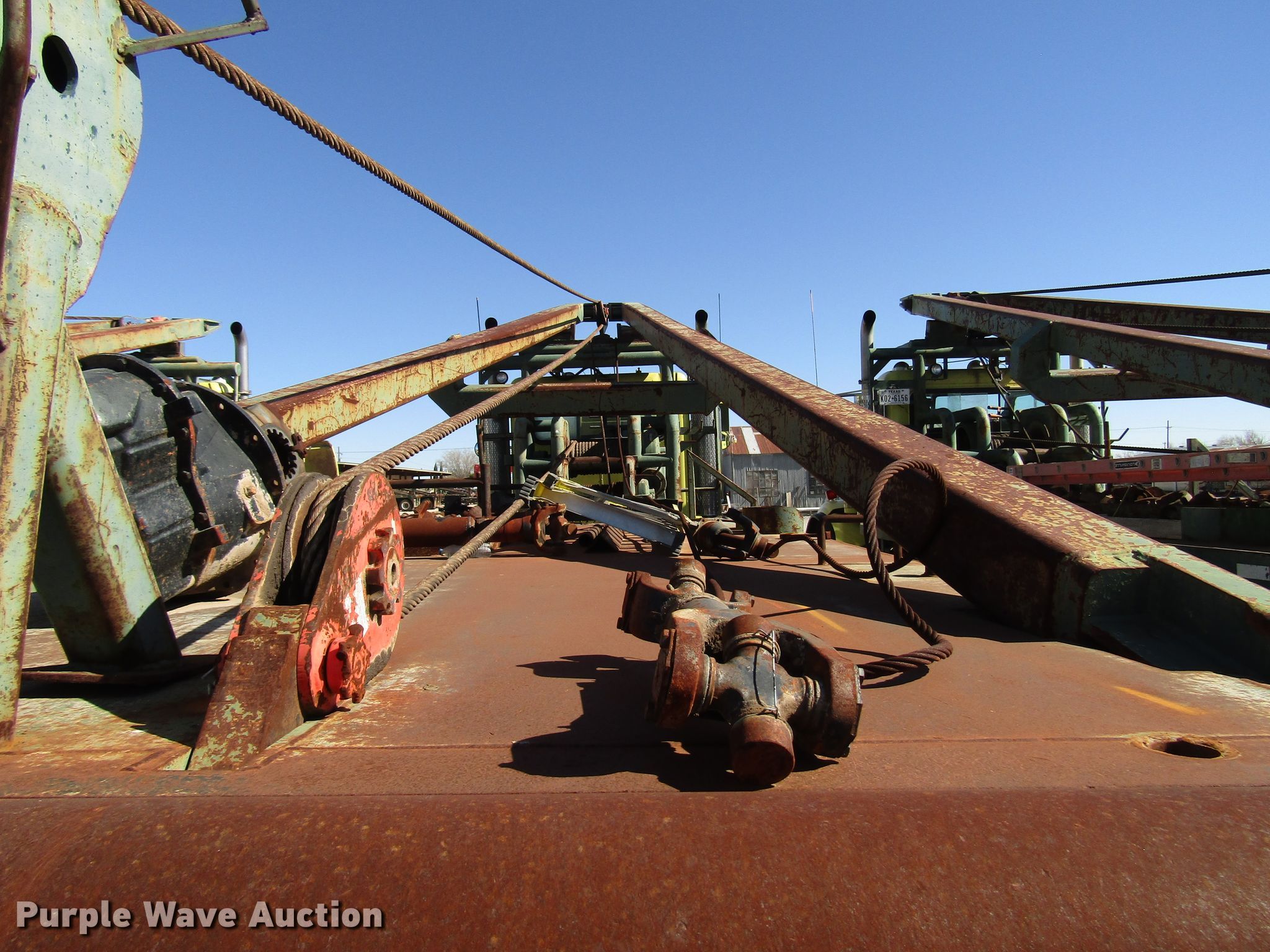 2006 Peterbilt 357 winch truck. 308,871 miles on odometer, Caterpillar C15 14.6L L6 diesel engine, Manual transmission, Tandem axle, AC and heat, PTO, 28'L x 102"W flatbed Dual winches , Rolling tailboard, 28'L gin poles, Walking beam suspension, Air brakes, 29' wheelbase, 445/65R22.5 front tires, 12.00R24 rear tires, GVWR 86,000 lbs, Contents not included, Rear end removed from truck, Non-operational unit, Unit# 55. Texas title. Title distribution may be delayed up to 30 days from verification of funds. 1NPALBTX26D881231. Schlumberger Rod Lift Group. 901 S Cecil. Hobbs, NM 88240