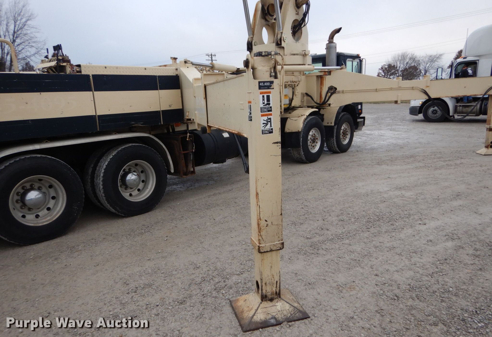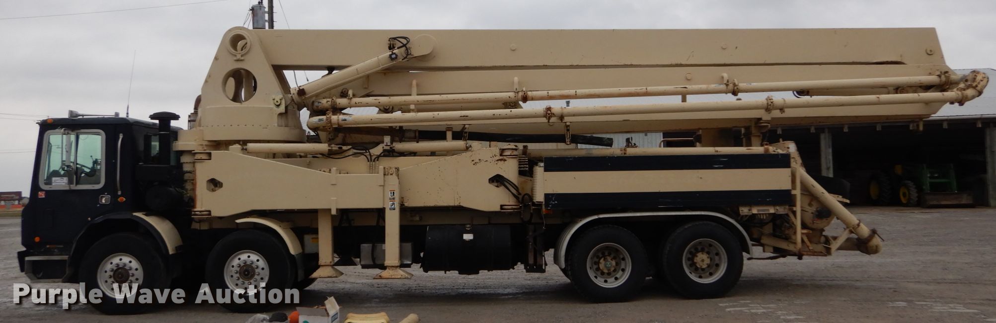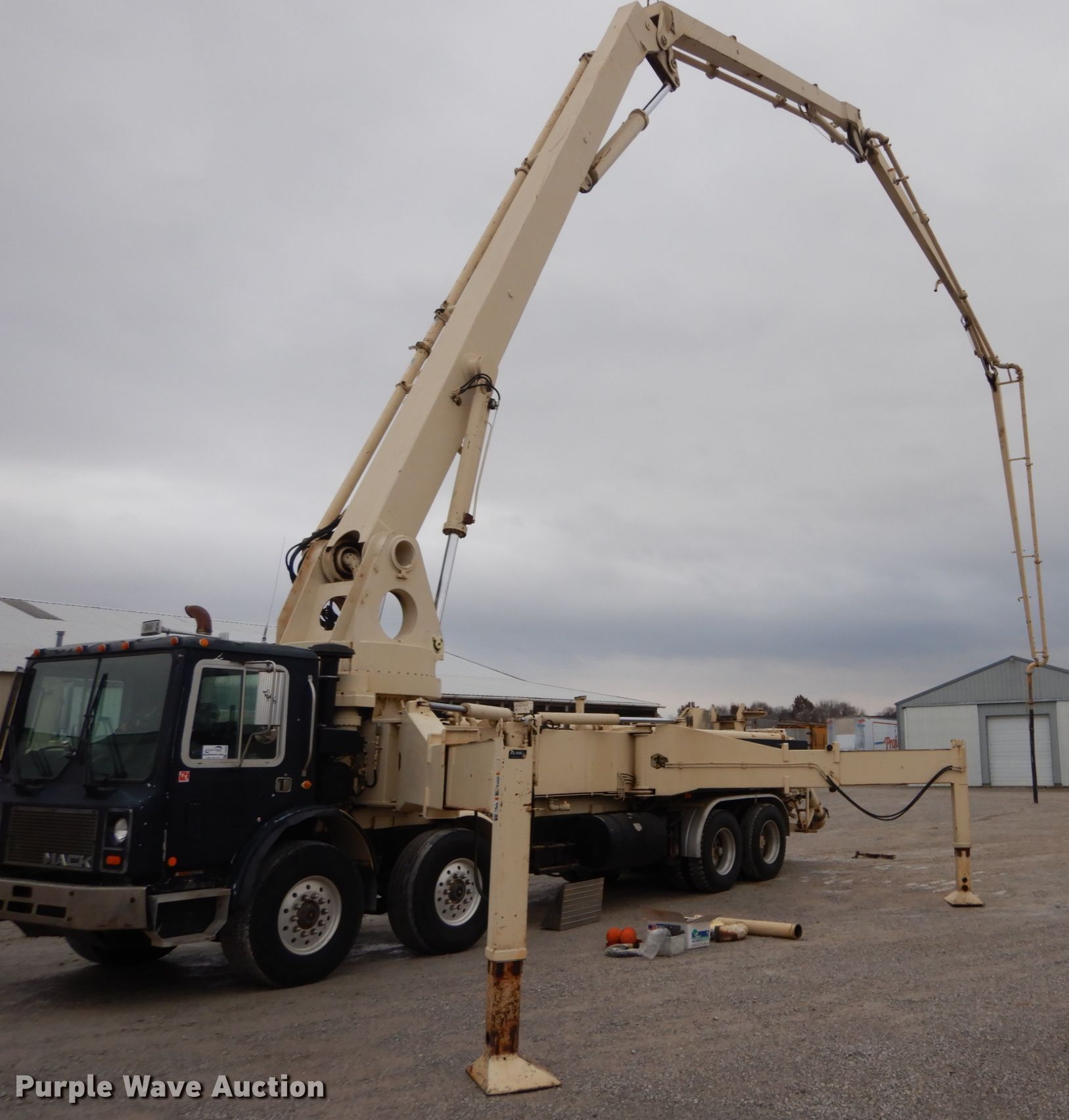 Purple Wave is selling a used Ready Mix or Pump Truck in Illinois. This item is a 1993 Mack MR688S pump truck with the following: 489,854 miles on odometer, 22,116 hours on meter, 12.0L L6 diesel engine, Maxitorque eight speed manual transmission, Tandem axle, Heat, PTO, 1993 Schwing BPL 1200 HDR-23 pump bed, Four boom sections, 42 meter boom length, Ground and remote controls, Serial 170512256, Spring over walking beam suspension, Air brakes, 425/65R22.5 front tires, 11R22.5 rear tires