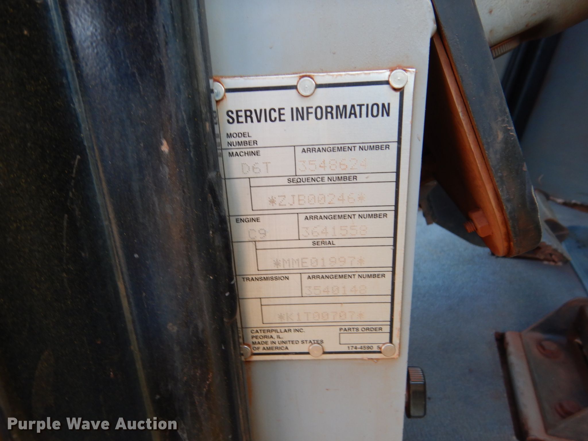 2011 Caterpillar D6T LGP dozer. 13,777 hours on meter, Caterpillar C9 six cylinder diesel engine Serial MME01997, Powershift transmission 3F-3R gears, Enclosed cab AC and heat, Differential steering, 12'9"W single tilt straight dozer blade, Auxiliary hydraulics, Eight bottom rollers, Track guards, 36"W single grouser track pads, GPS ready, Serial ZJB00246. Hutchinson, MN 55350