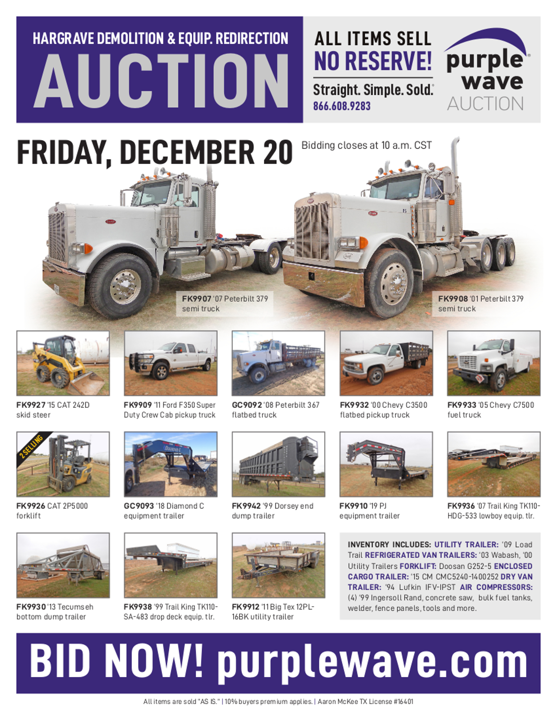 This auction is conducted by Purple Wave, Inc., whose home office is 825 Levee Drive, Manhattan, Kansas. Aaron McKee, Texas auctioneer license # 16401, operates Purple Wave, Inc. Complaints against us may be directed to the Texas Department of Licensing and Regulation, P.O. Box 12157, Austin, Texas 78711, (512) 463-6599. For additional required information, see the attached document.
