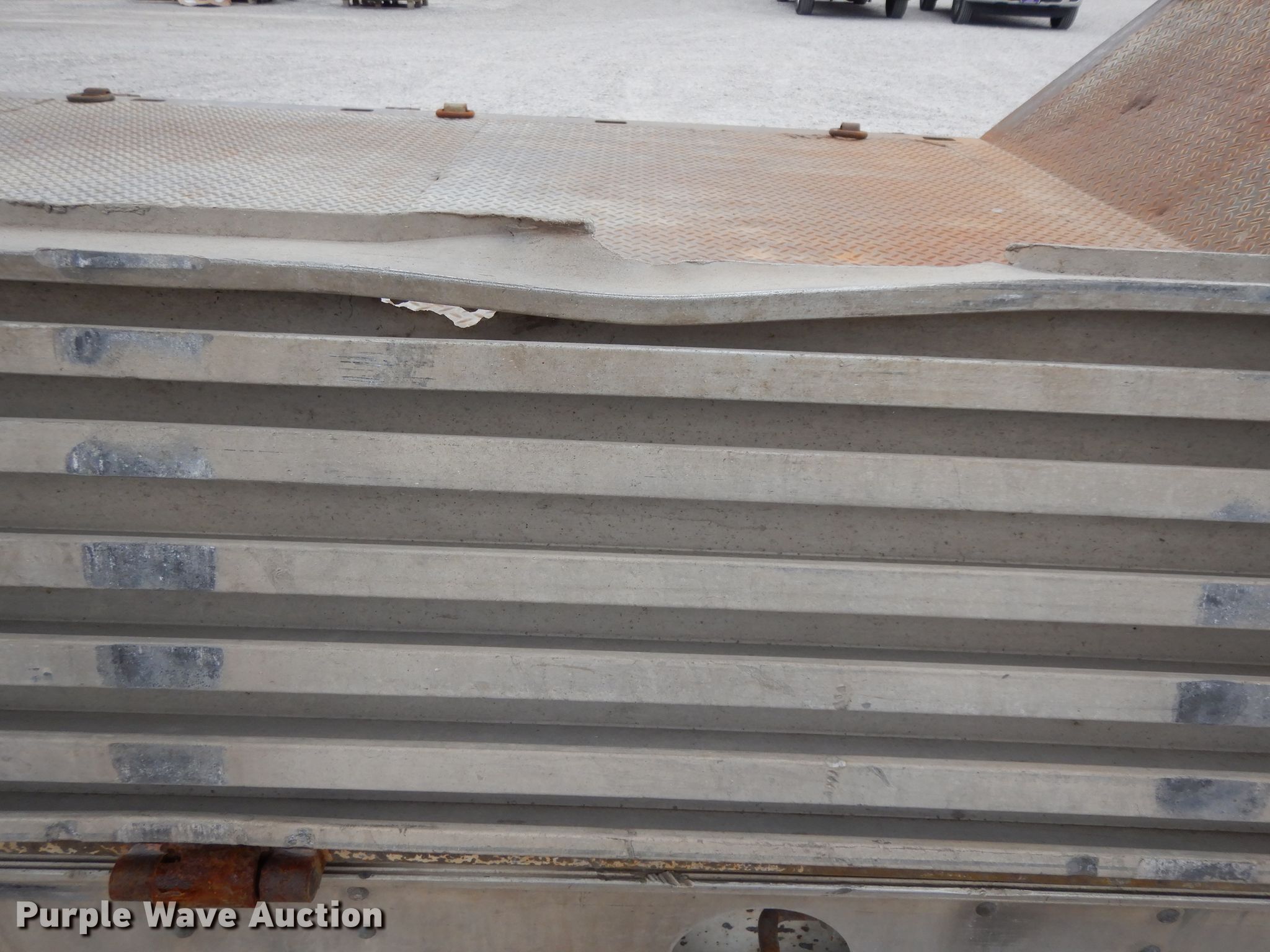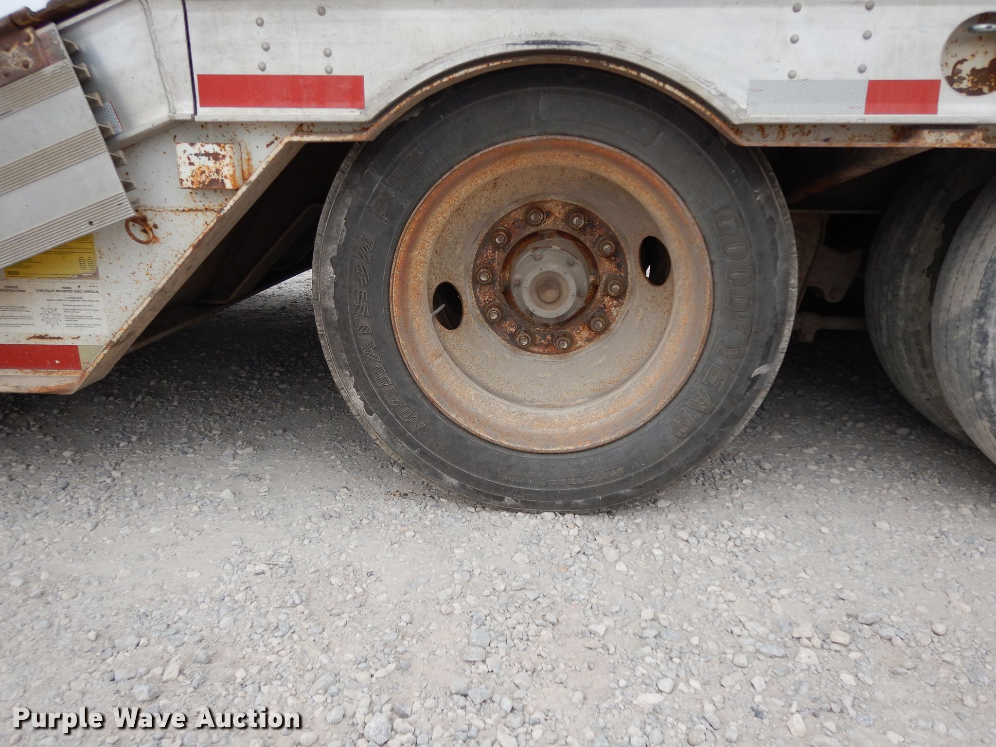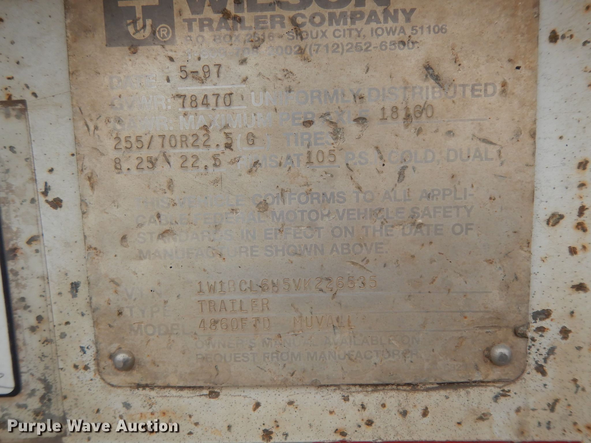 Purple Wave is selling a used Equip. Trailer in Texas. This item is a 1997 Wilson 4860FTD drop deck equipment trailer with the following: 48'3"L x 96"W overall, 7'11"L top deck, 17'1"L main deck, 8'1"L rear deck, Steel deck, Hydraulic ramps, Manual hydraulic controls, Dual leg landing gear, Spring suspension, Air brakes, Tandem axle, Steel wheels, 255/70R22.5 tires, GVWR 78,470 lbs, GAWR 18,160 lbs