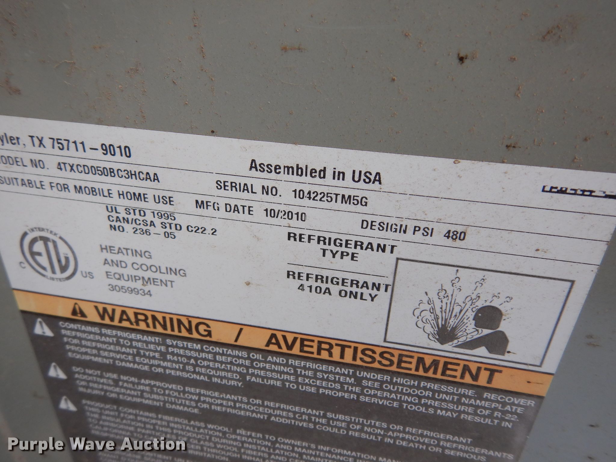 Purple Wave is selling a used Appliances in Kansas. This item is a (2) HVAC units with the following: 2006 Trane XR14 central air unit, Model 2TTR4048A1000AA, 208/230V, Single phase, Serial 6072XJW1F, 2010 Trane XB heater, Model 4TXCD050BC3HCAA, Natural gas fired, Serial 104225TM56