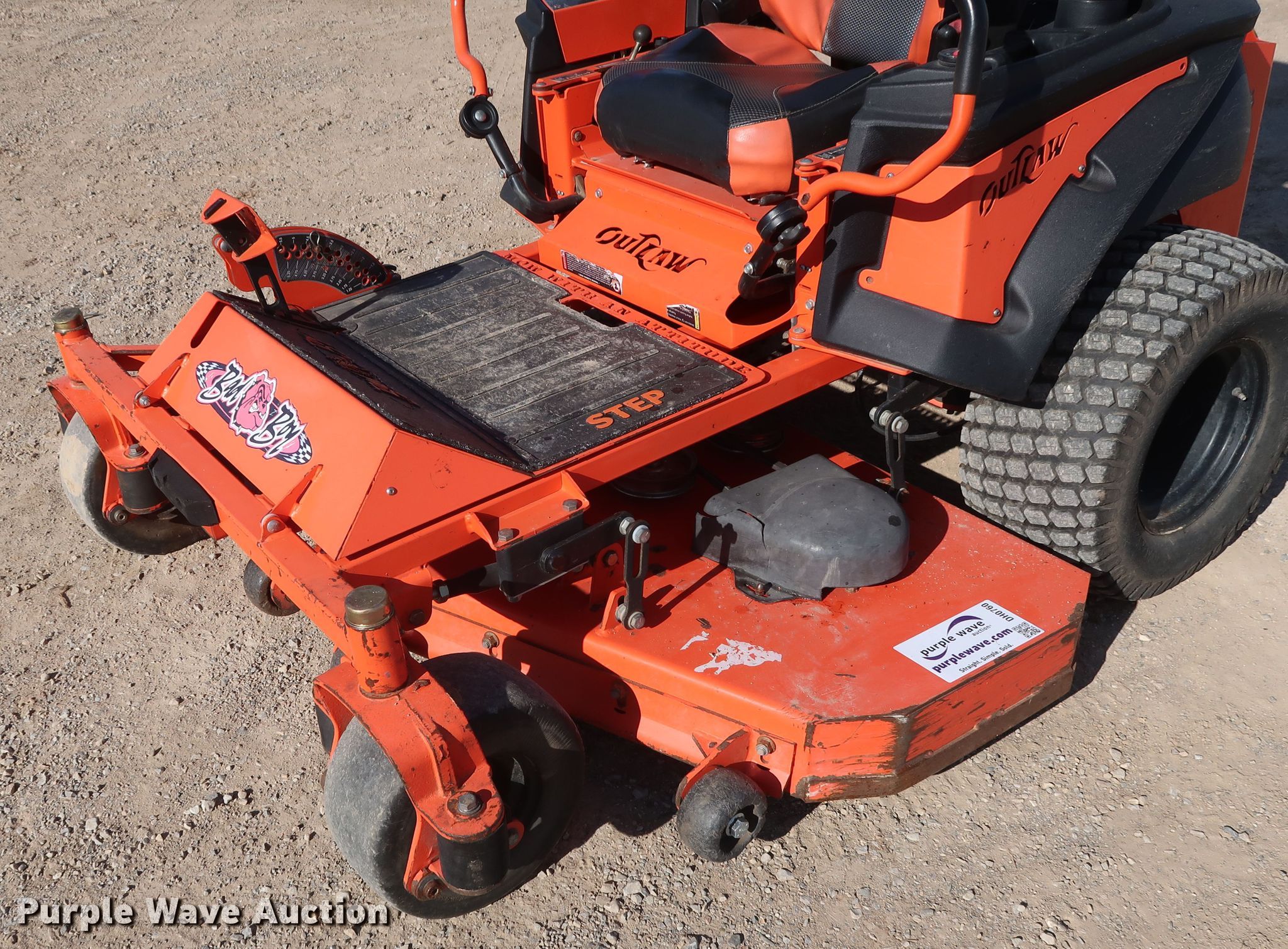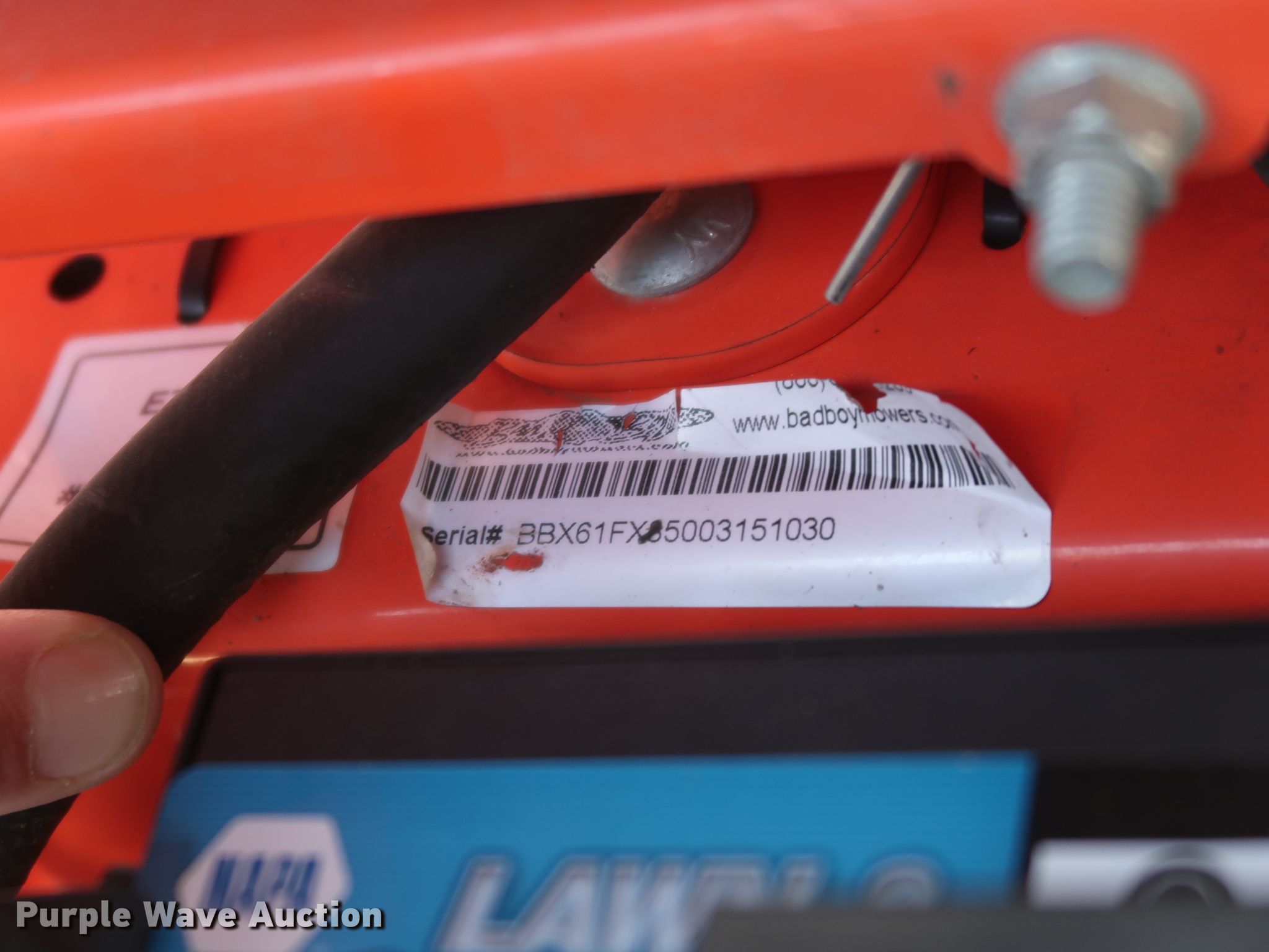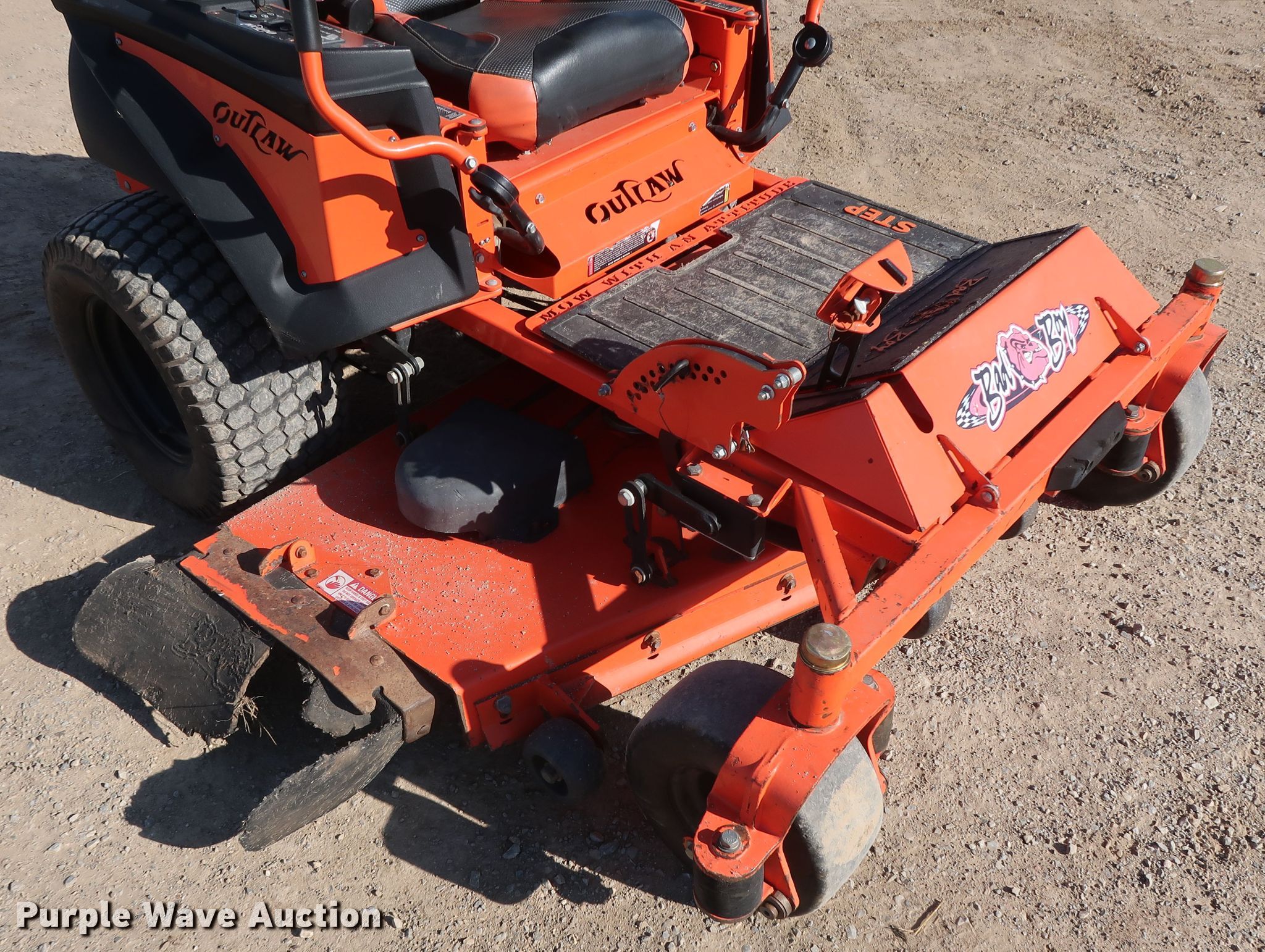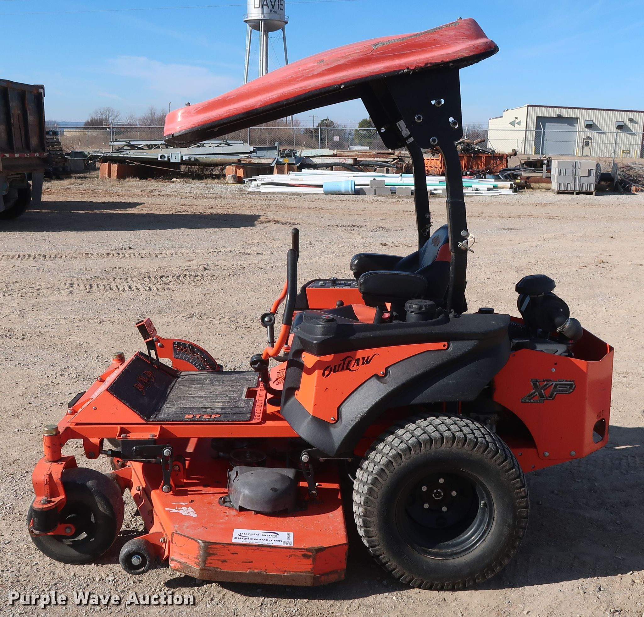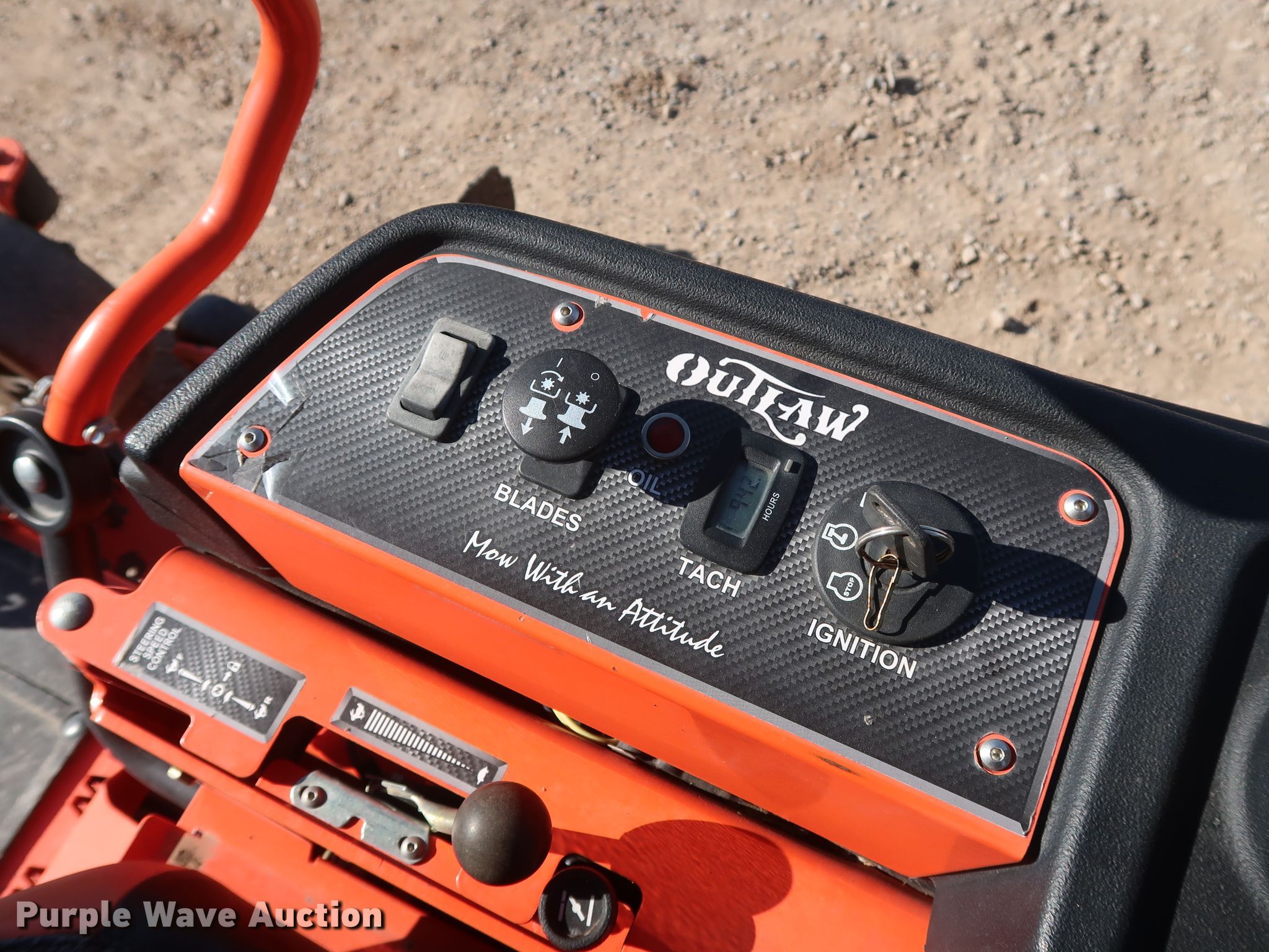 Purple Wave is selling a used Commercial Turf Mower in Oklahoma. This item is a Bad Boy Outlaw XP ZTR lawn mower with the following: 943 hours on meter, 61" cut, Kawasaki FX850V two cylinder gas engine, 27 HP, Hydrostatic transmission, OROPS, 13x6.50-6 NHS front tires, 24x12.00-12 NHS rear tires, Serial BBX61FX85003151030