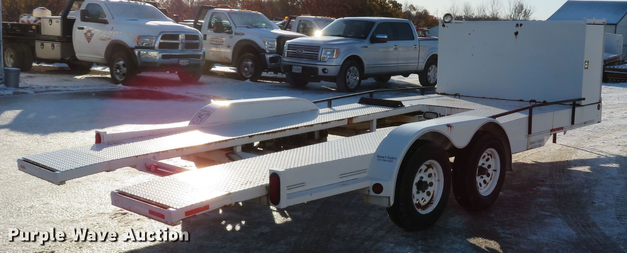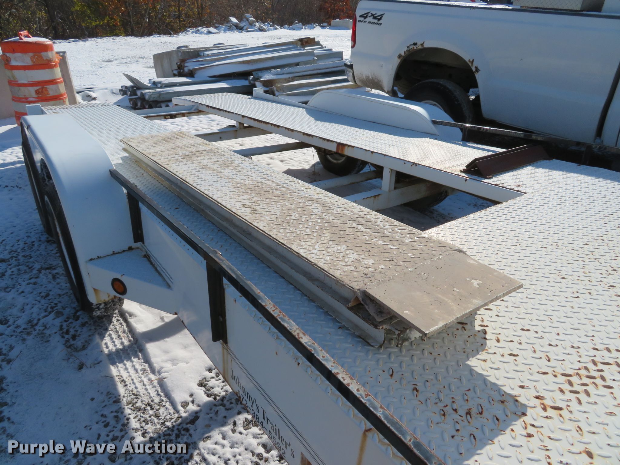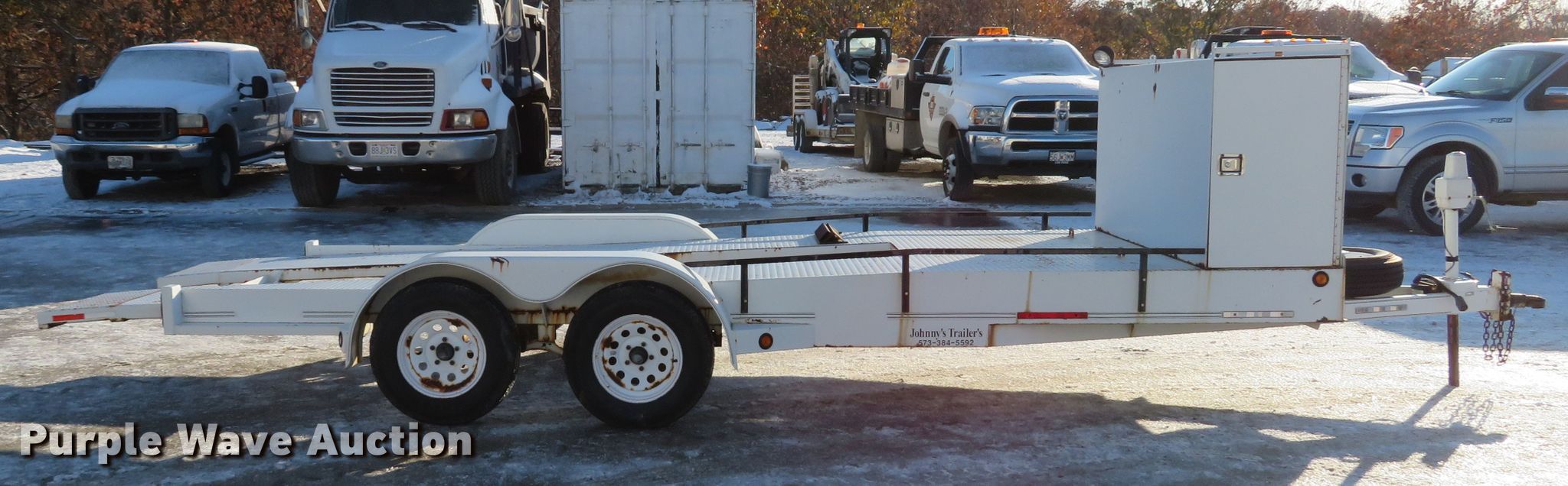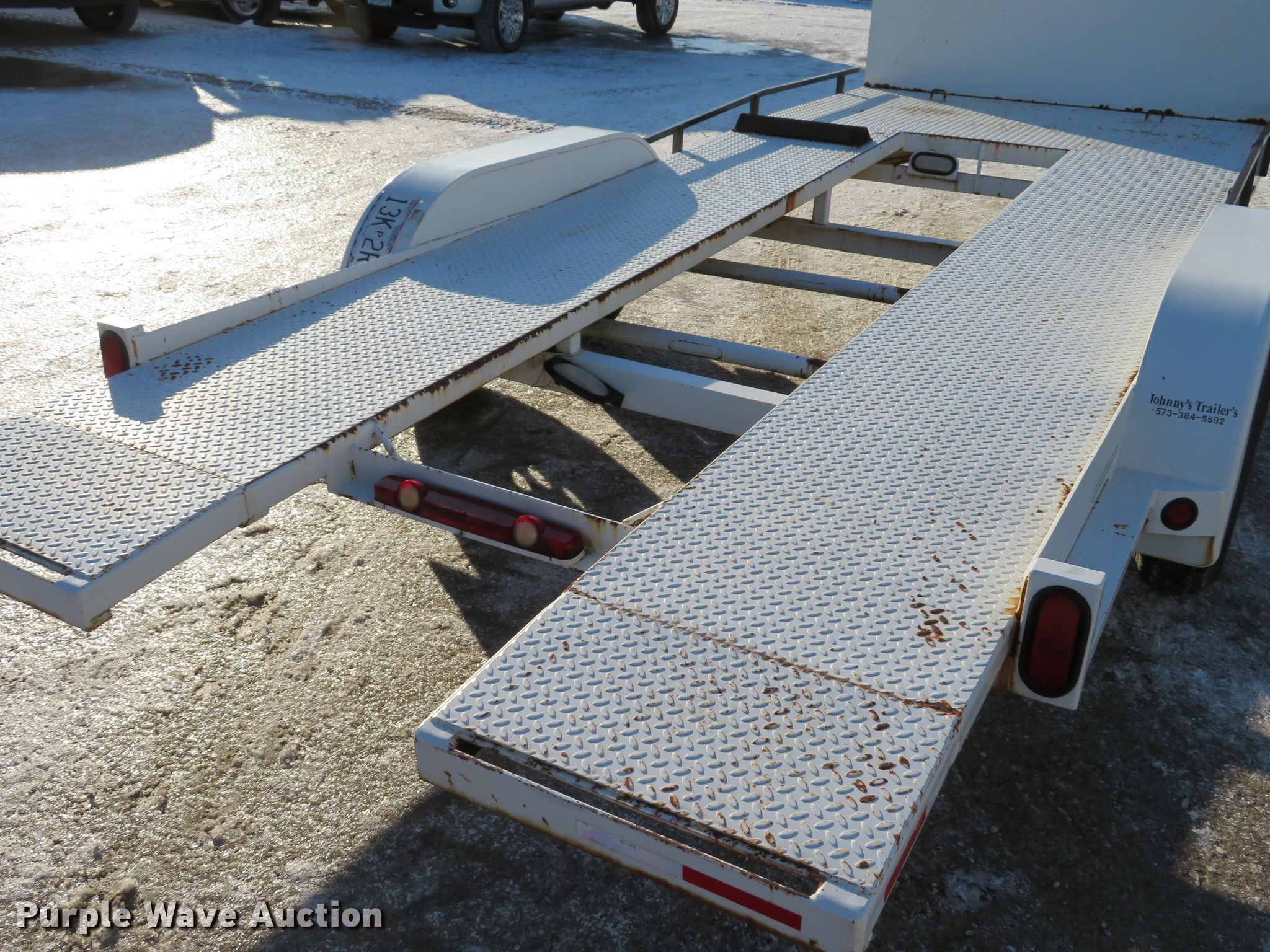 Purple Wave is selling a used Car or Utility Trailer in Missouri. This item is a 2001 Johnnys Truck & Trailers utility trailer with the following: 23.5'L x 96"W overall, 17'3"L x 77"W deck, 80"L ramps, Steel deck, 2" ball hitch, Jack stand, Spring suspension, Electric brakes, Tandem axle, Steel wheels, ST205/75R14 tires, GVWR 6,000 lbs, GAWR 3,500 lbs, Unit# T103