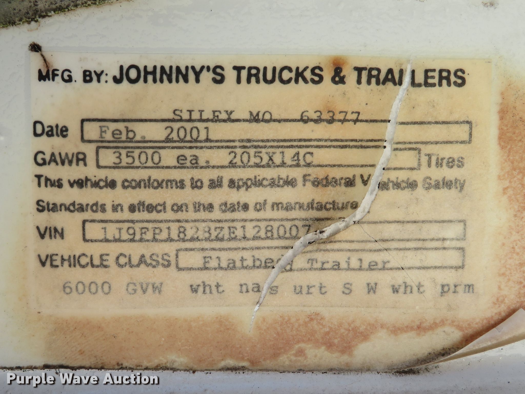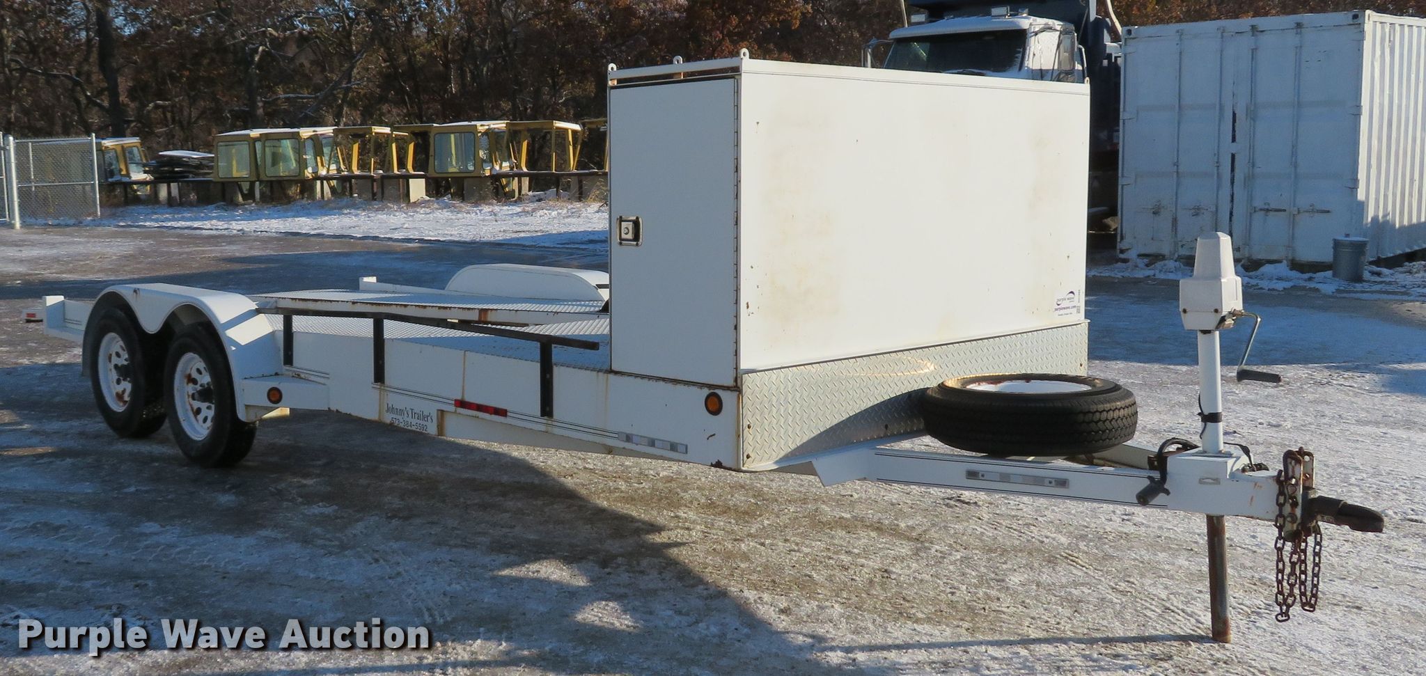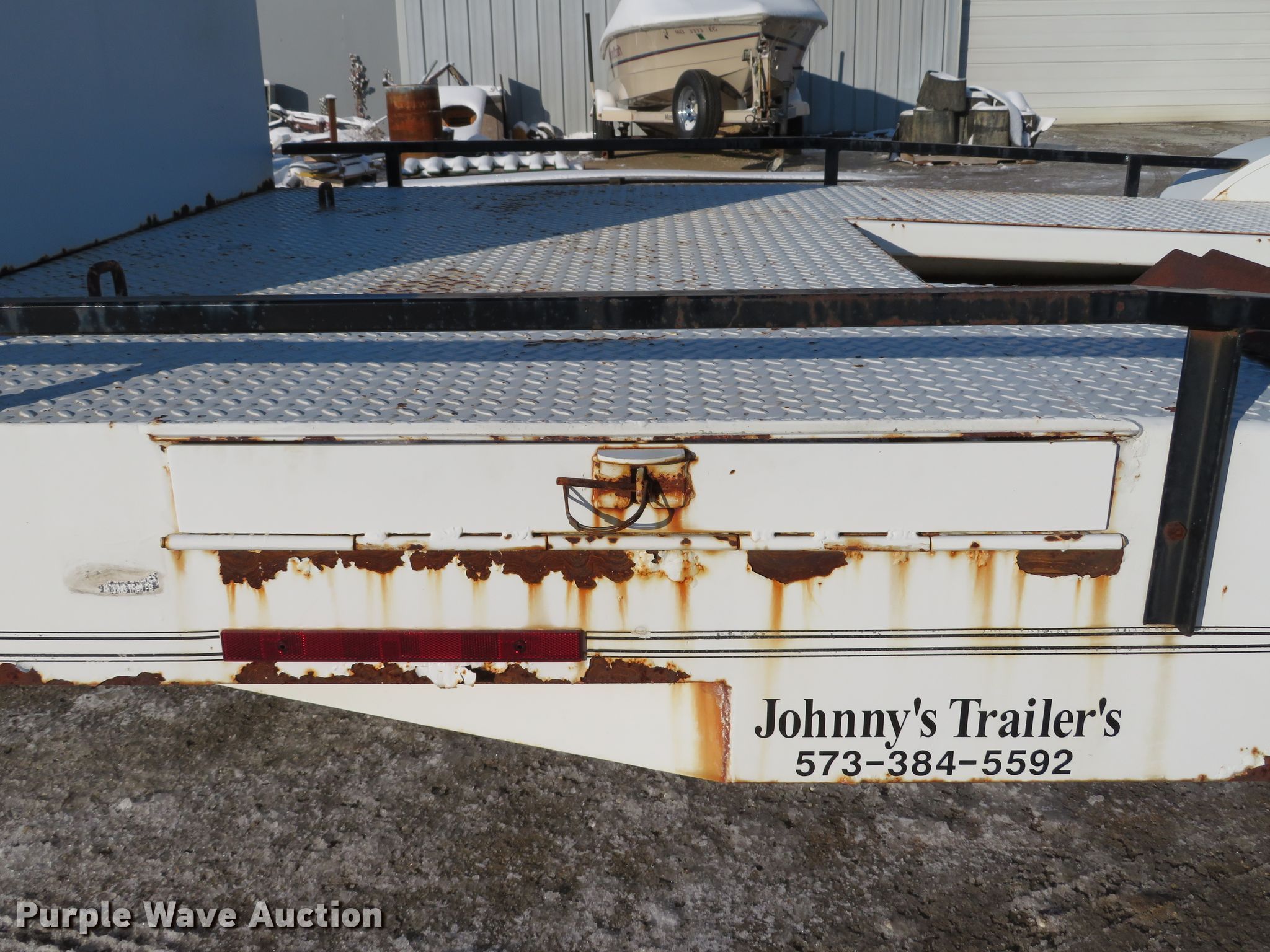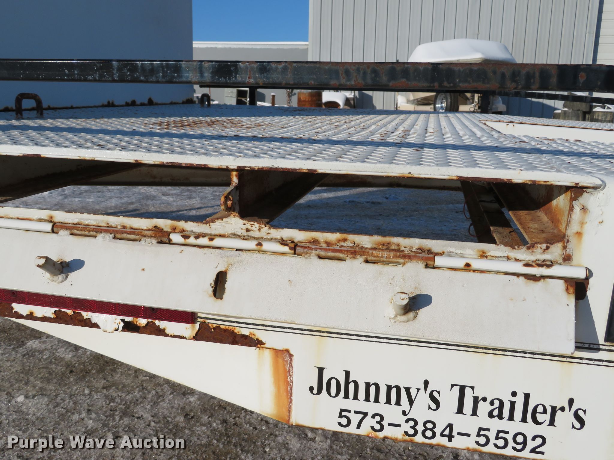 Purple Wave is selling a used Car or Utility Trailer in Missouri. This item is a 2001 Johnnys Truck & Trailers utility trailer with the following: 23.5'L x 96"W overall, 17'3"L x 77"W deck, 80"L ramps, Steel deck, 2" ball hitch, Jack stand, Spring suspension, Electric brakes, Tandem axle, Steel wheels, ST205/75R14 tires, GVWR 6,000 lbs, GAWR 3,500 lbs, Unit# T103