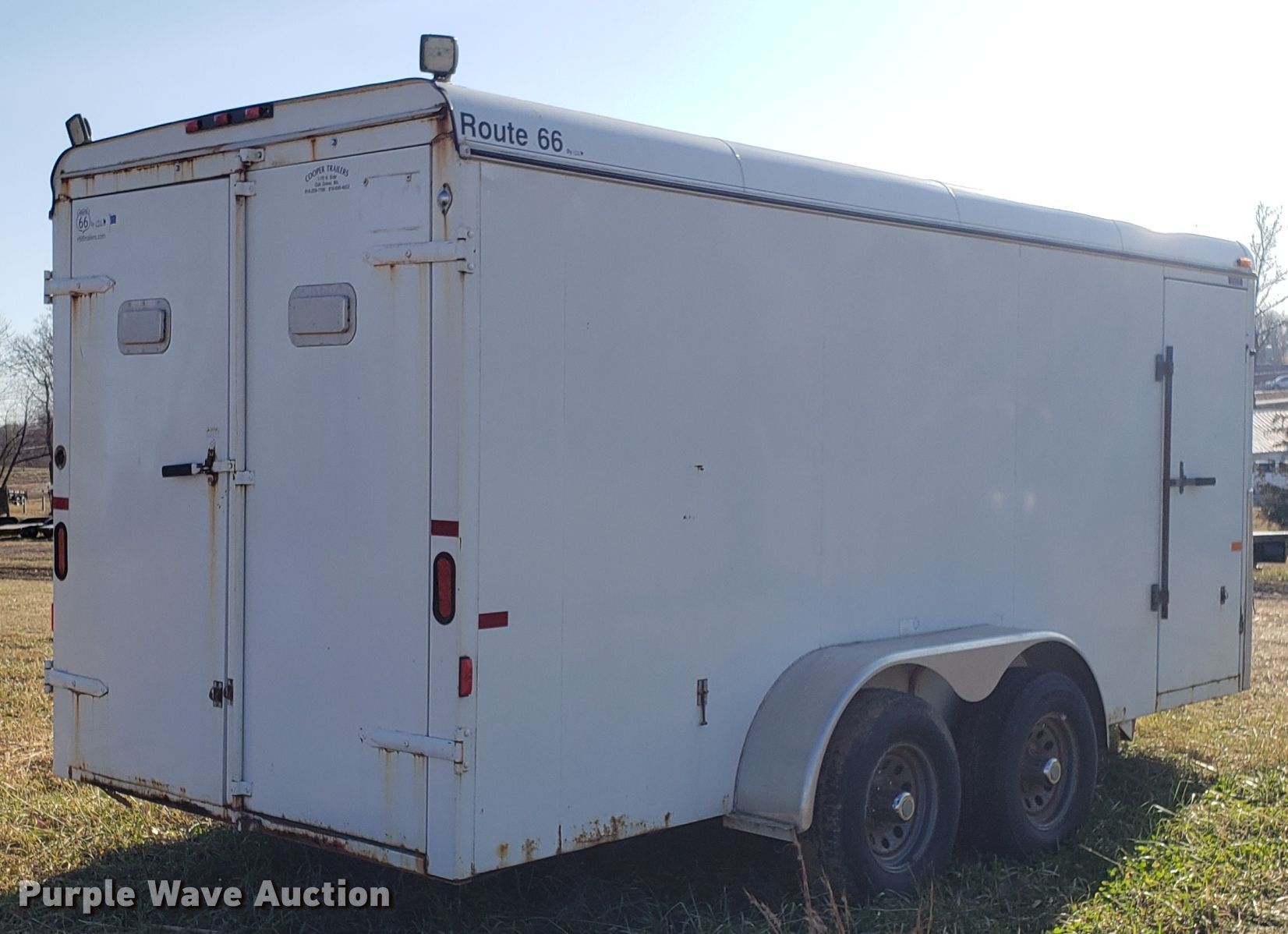 2004 Cm Trailers enclosed cargo trailer. 16'L x 77"W x 80"H overall, 2 5/16" ball hitch, Single leg landing gear, Torsion suspension, Electric brakes, Tandem axle, 225/75R15 tires, GVWR 8,600 lbs. Missouri title. Title distribution may be delayed up to 14 days from verification of funds. 49TCB162241070402. Cooper Trailers. 700 NW 1st St. Oak Grove, MO 64075