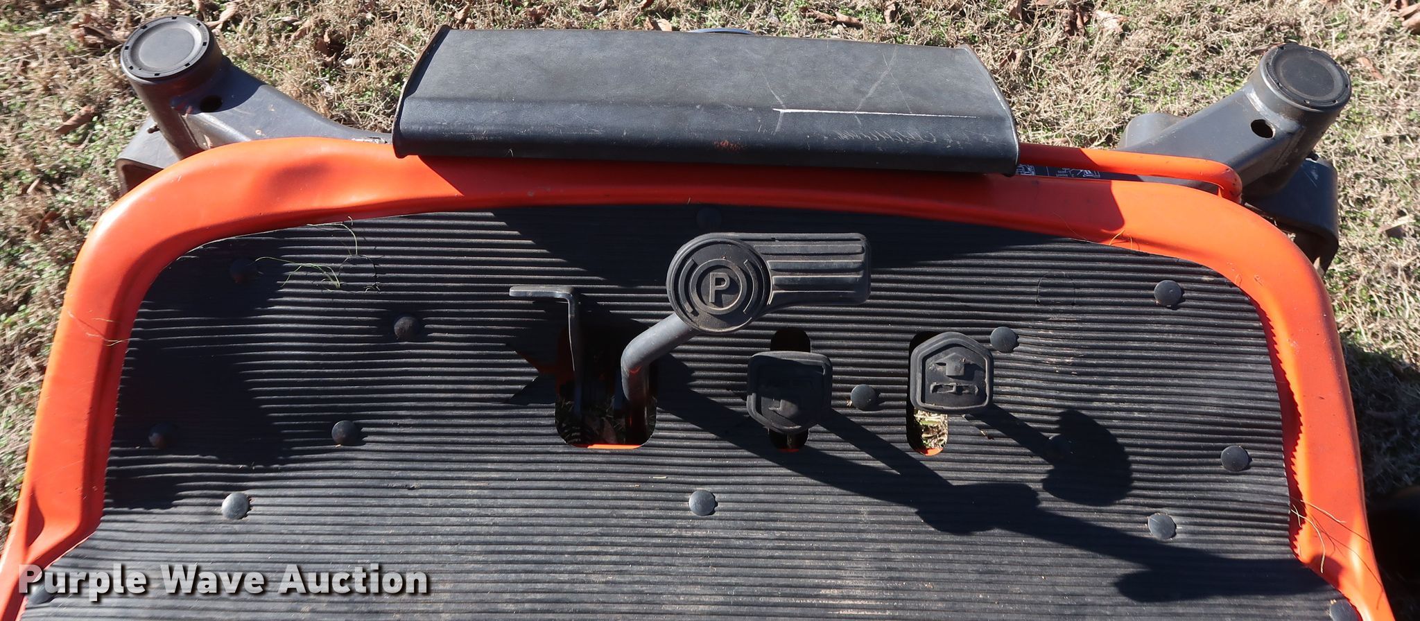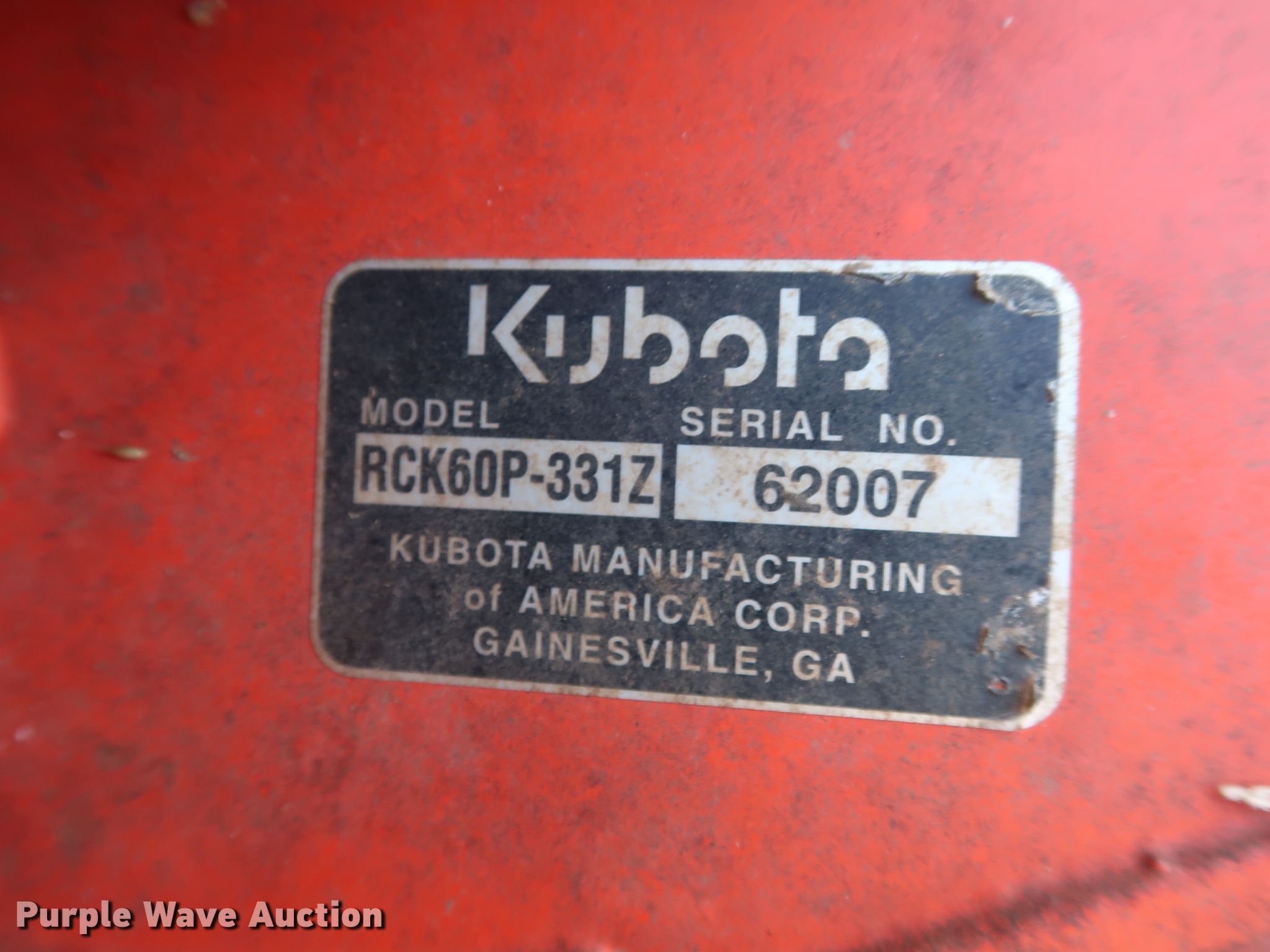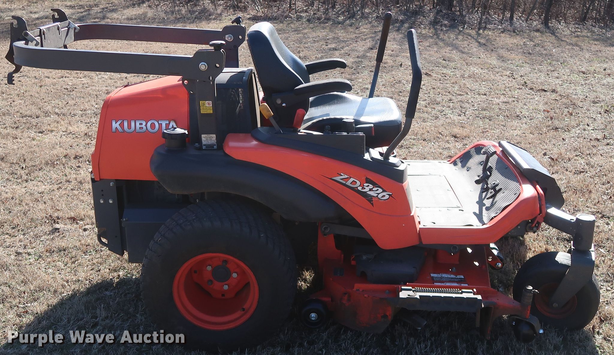 Purple Wave is selling a used Commercial Turf Mower in Oklahoma. This item is a 2011 Kubota ZD326P ZTR lawn mower with the following: 972 hours on meter, 60" cut, Kubota D1105-ET03 1.0L three cylinder diesel engine, 24.8 HP, Hydrostatic transmission, Two post ROPS bar, Kubota RCK60P-331Z mower deck, Serial 62007, Carlisle 15x6.00-6 front tires, Carlisle 26x12.00-12 rear tires, Serial 34550