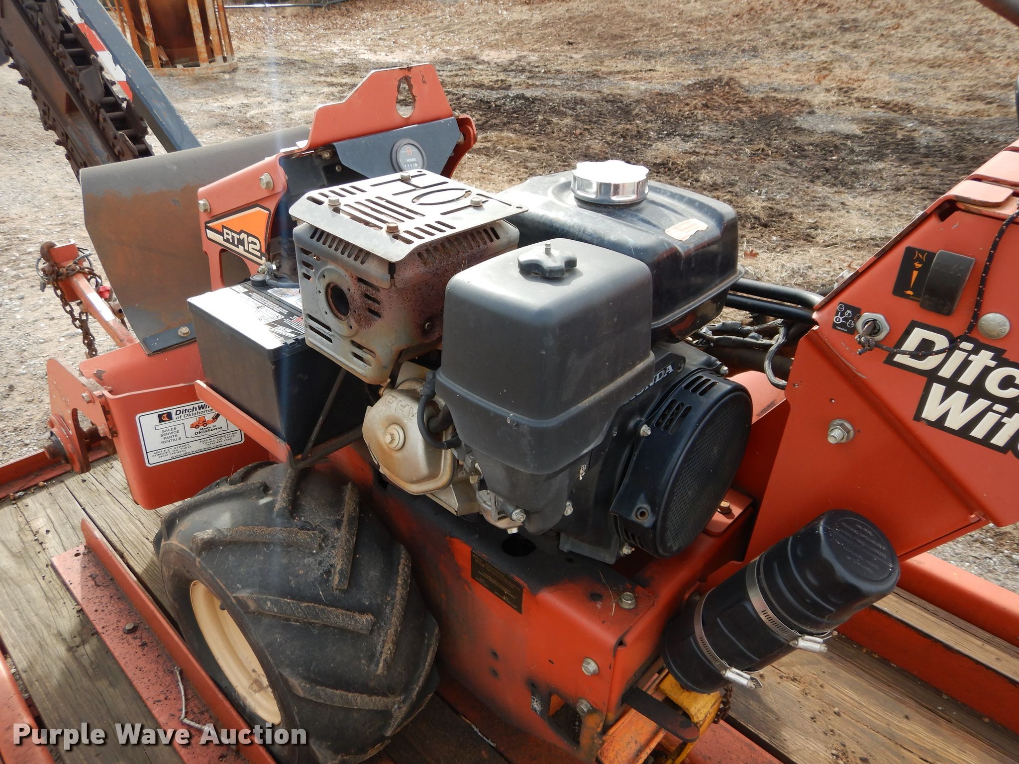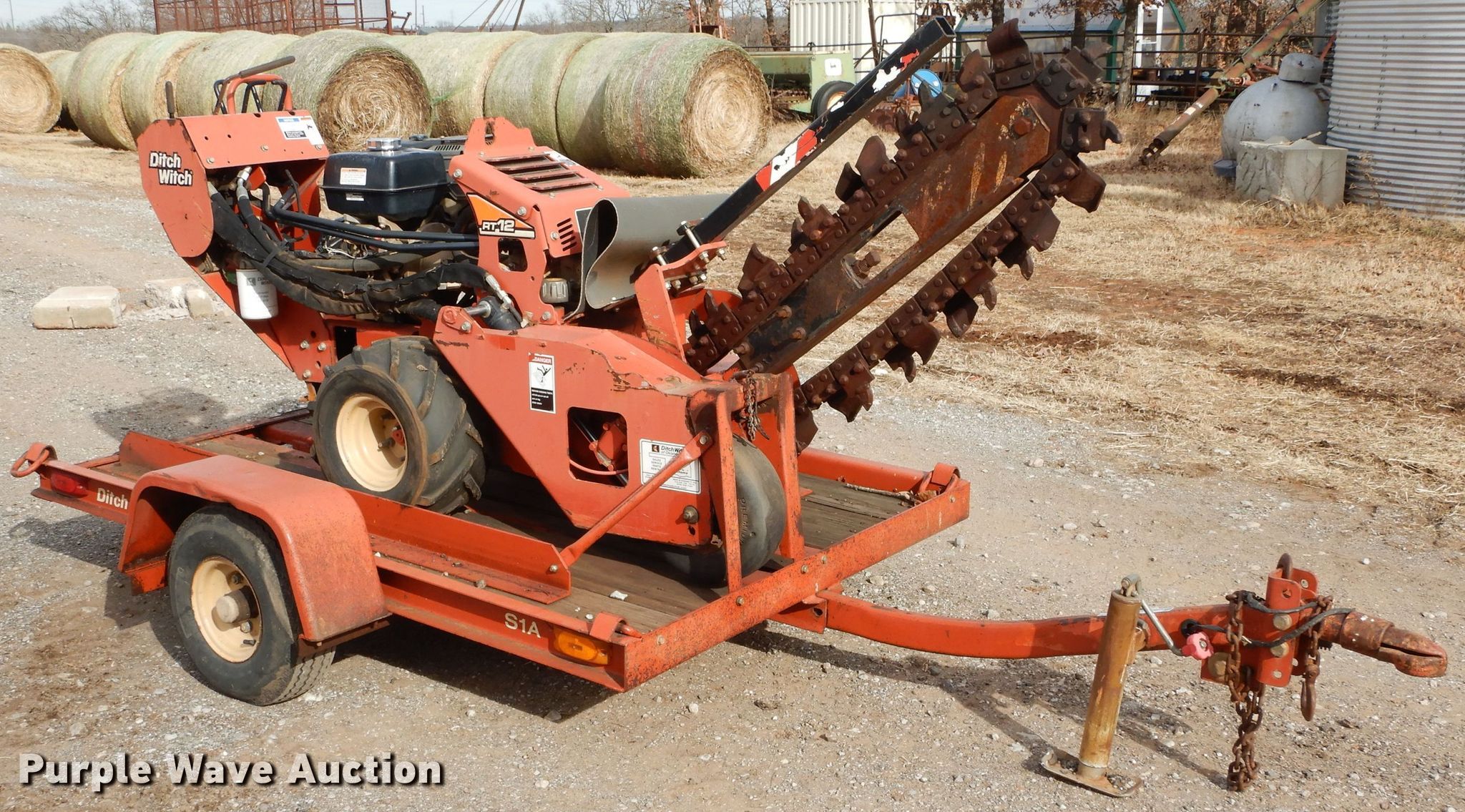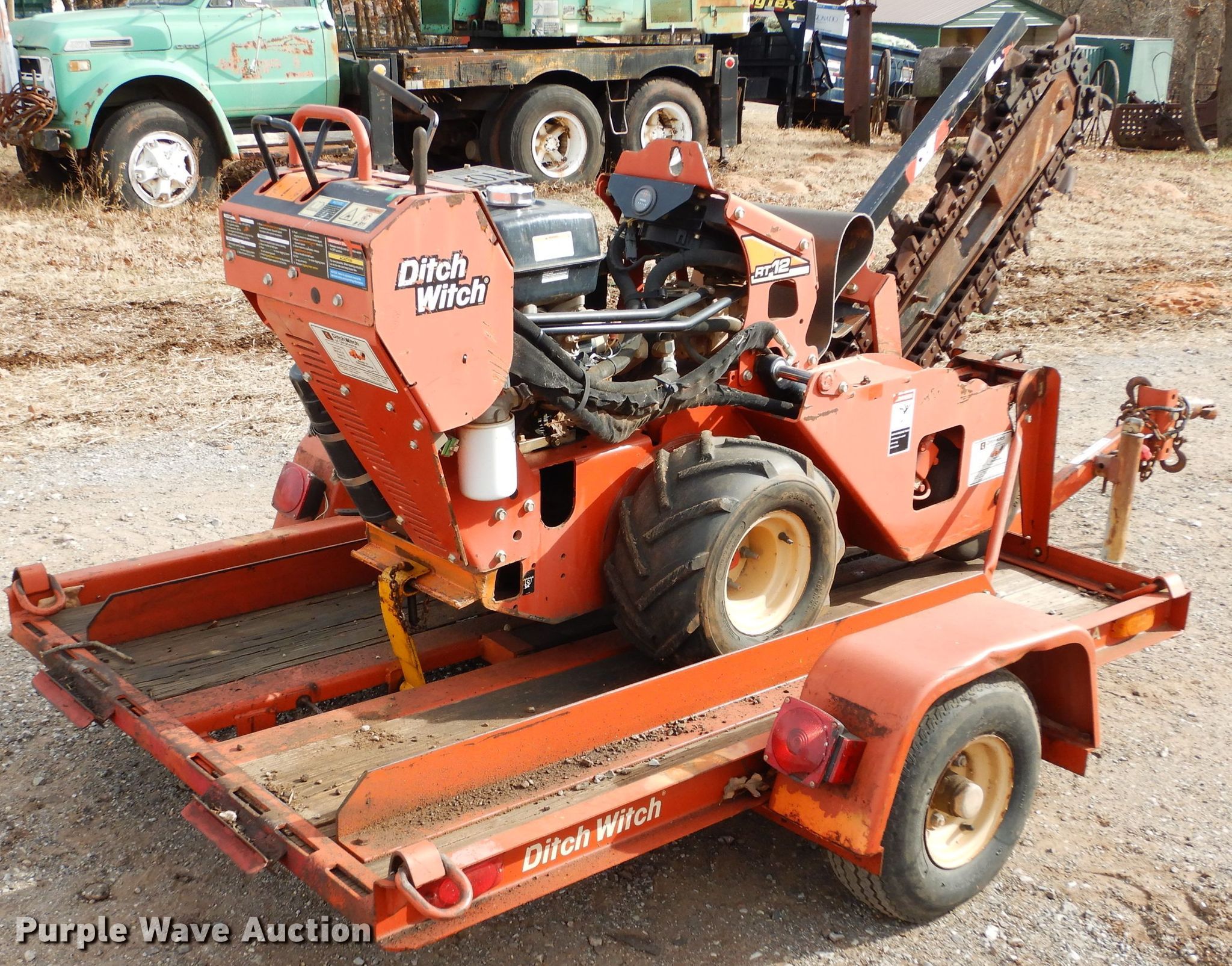 Purple Wave is selling a used Trencher or Rock Saw in Oklahoma. This item is a 2012 Ditch Witch RT12 trencher with the following: 58 hours on meter, Honda single cylinder gas engine, Hydrostatic transmission, 36" boom length, 4" cutting width, 5.70-8 tires, 2005 Charles Machine Works 11'L x 70"W utility trailer, 78" x 54" deck, Serial CMWRT12XJC0001472