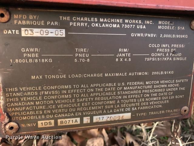 - 2005 Charles Machine Works 11'L x 70"W utility trailer