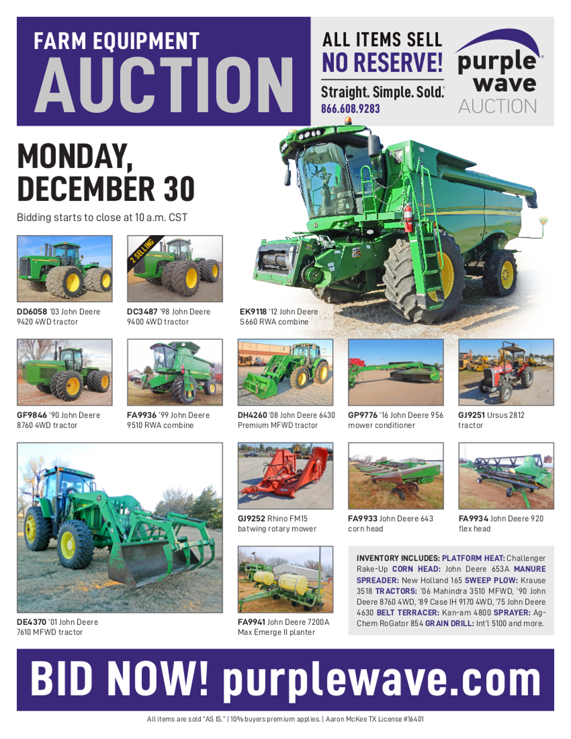 This auction is conducted by Purple Wave, Inc., whose home office is 825 Levee Drive, Manhattan, Kansas. Aaron McKee, Texas auctioneer license # 16401, operates Purple Wave, Inc. Complaints against us may be directed to the Texas Department of Licensing and Regulation, P.O. Box 12157, Austin, Texas 78711, (512) 463-6599. For additional required information, see the attached document.