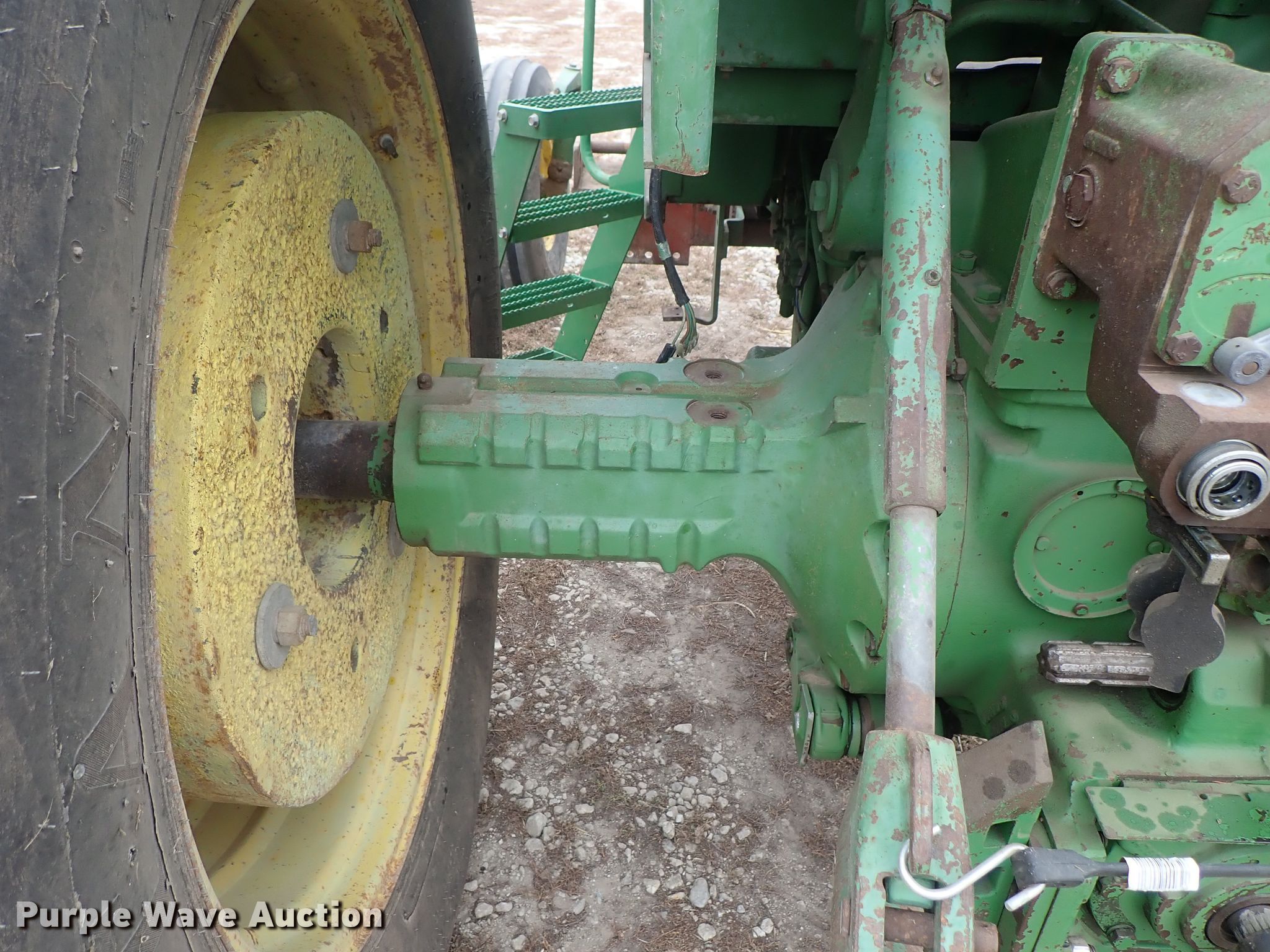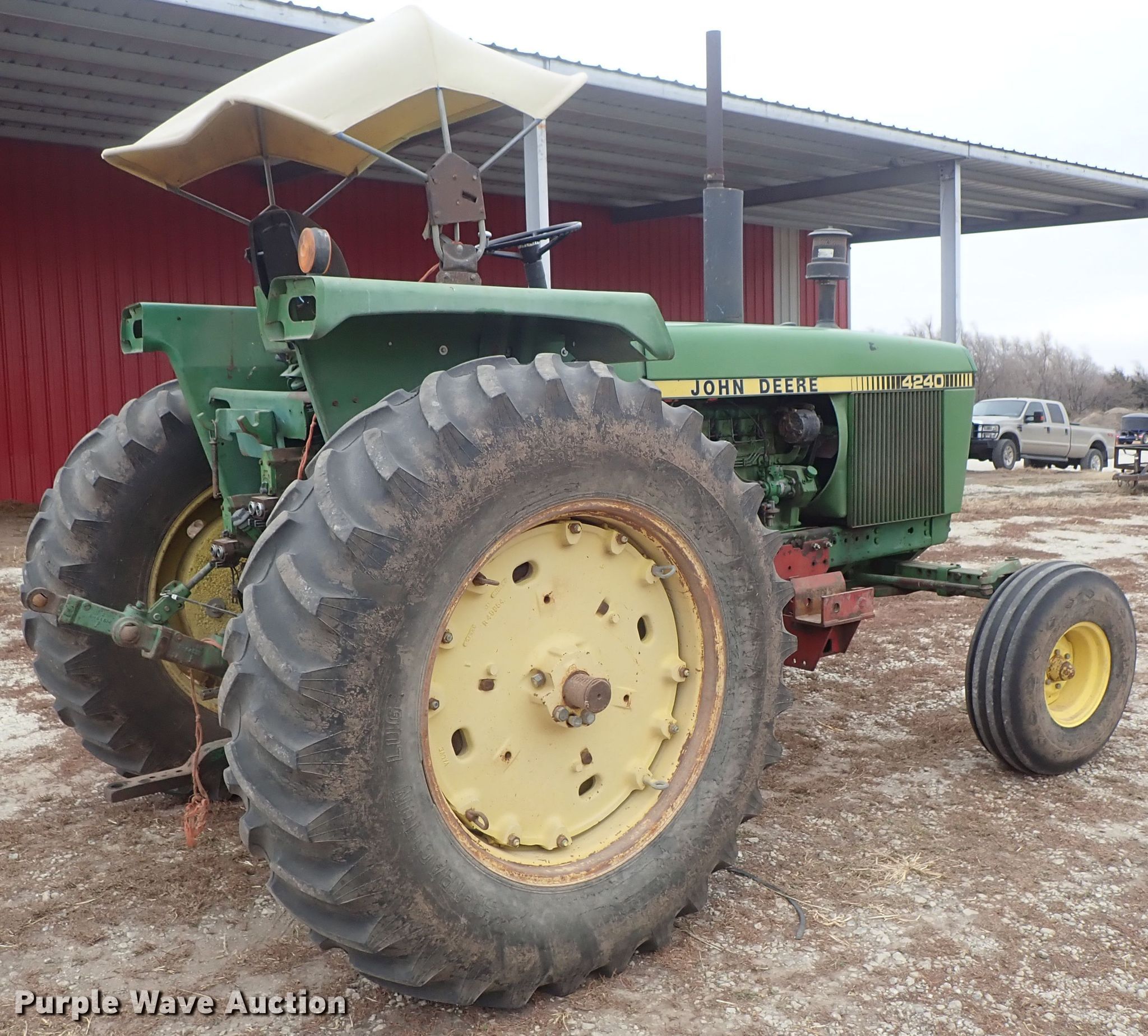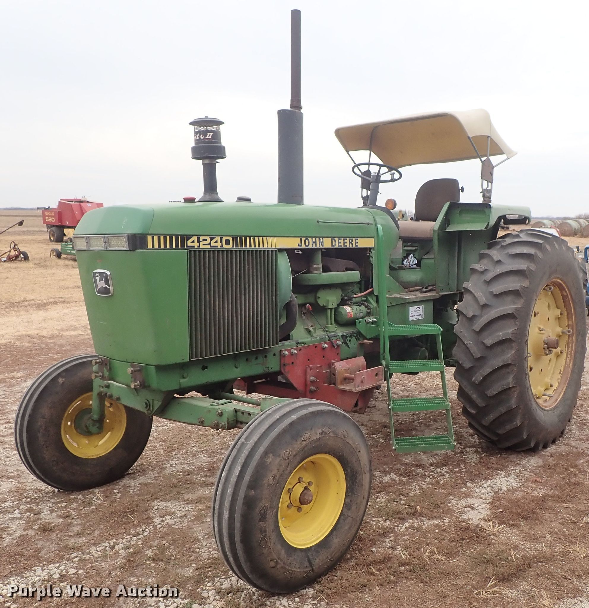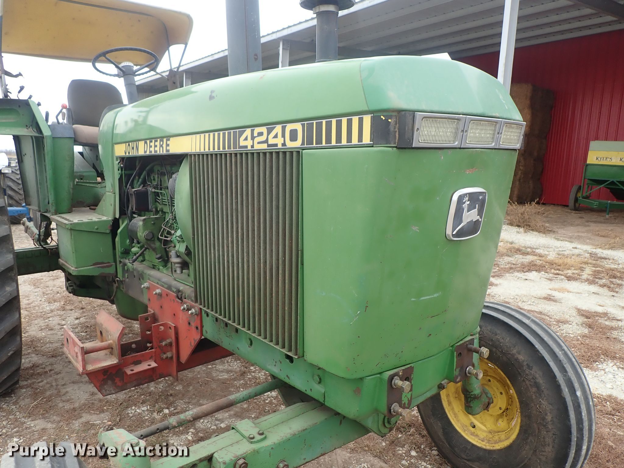 Purple Wave is selling a used Tractor in Kansas. This item is a John Deere 4240 tractor with the following: 7,144 hours on meter, John Deere 7.6L six cylinder diesel engine, Synchro transmission, 8F-2R gears, Three point, 540 PTO, (3) sets rear hydraulic remotes, 10.00-16 front tires, 18.4-38 rear tires, Loader brackets not included, Serial 4240W006833R