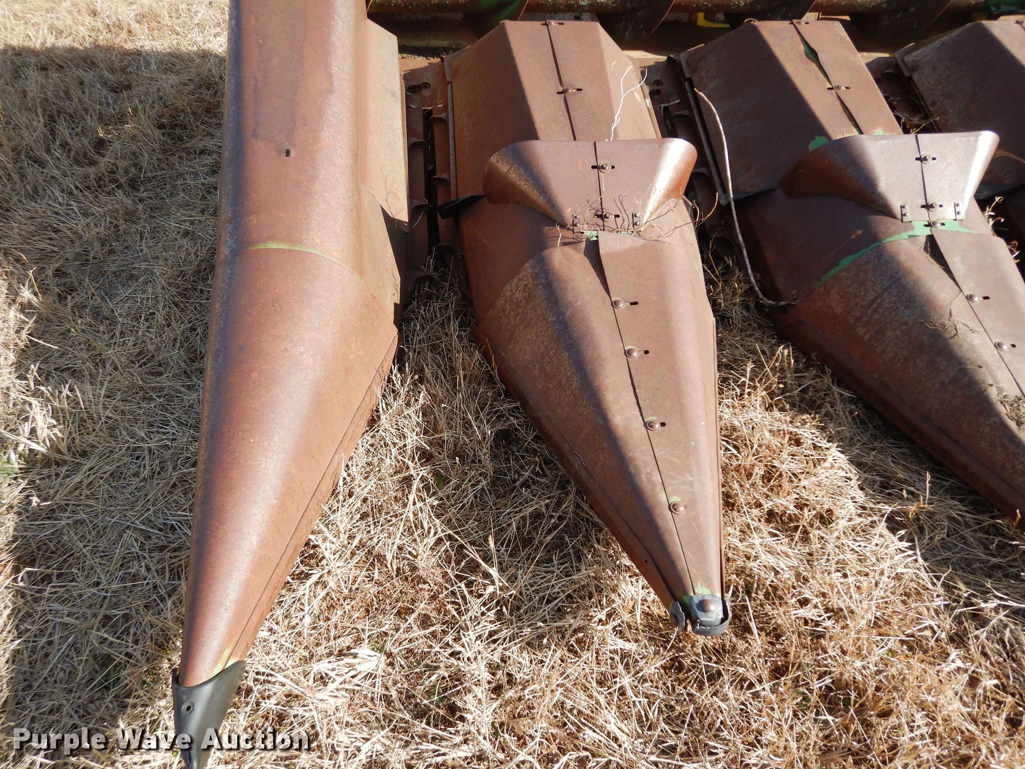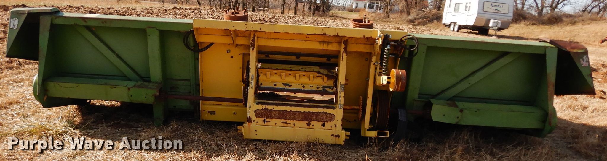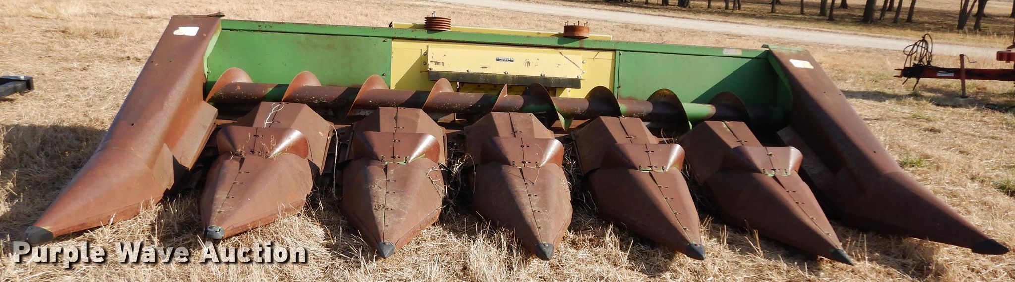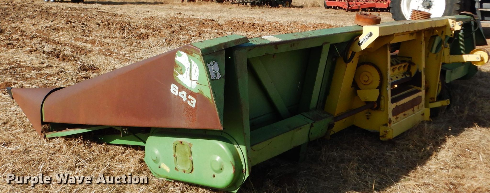 Purple Wave is selling a used Corn or Row Head in Kansas. This item is a John Deere 643 corn head with the following: 16'W, Six rows, 30" row spacing, Corn savers, Lindquist adapter