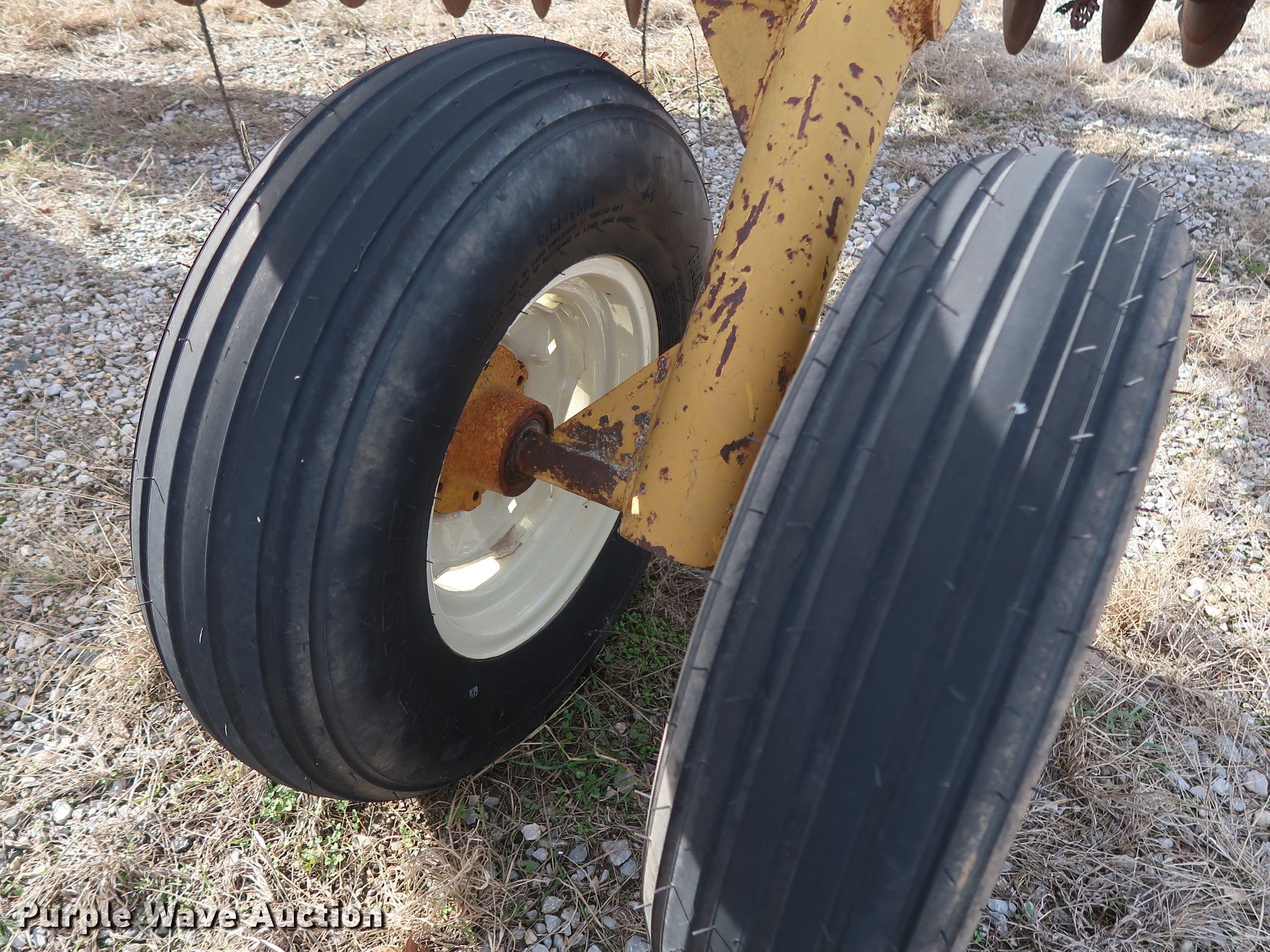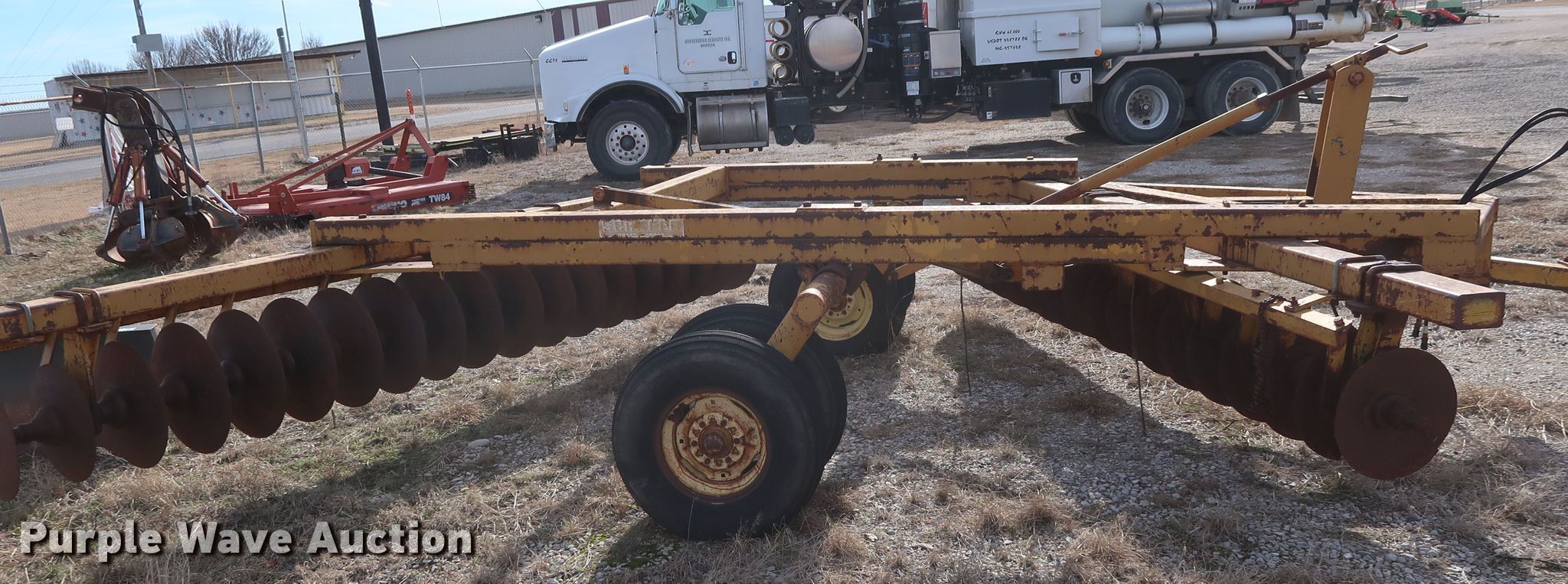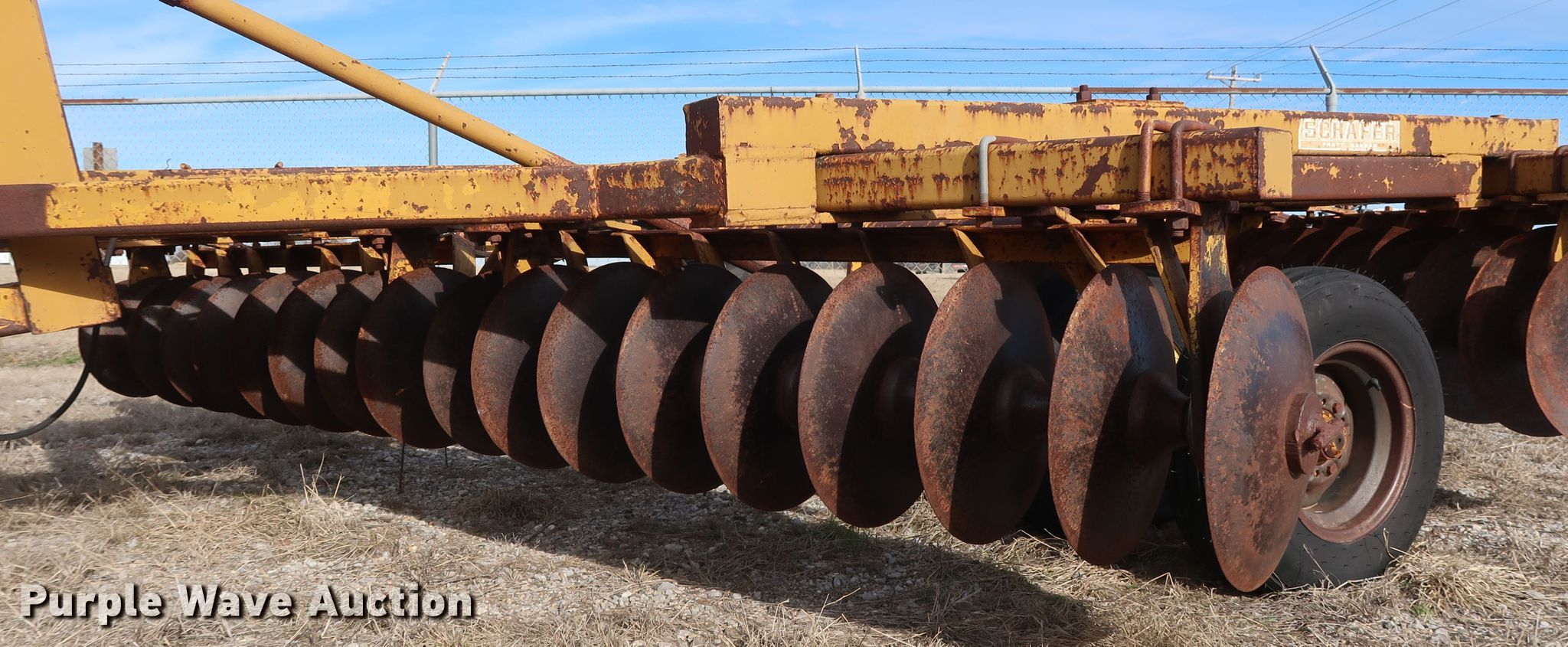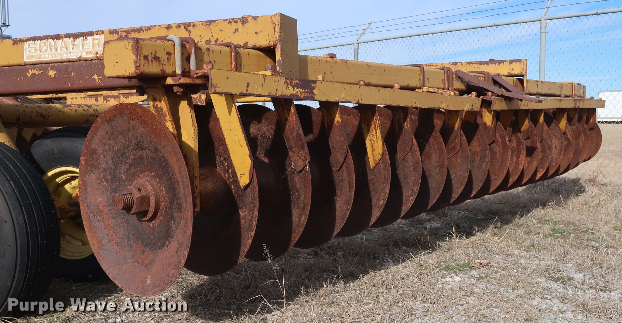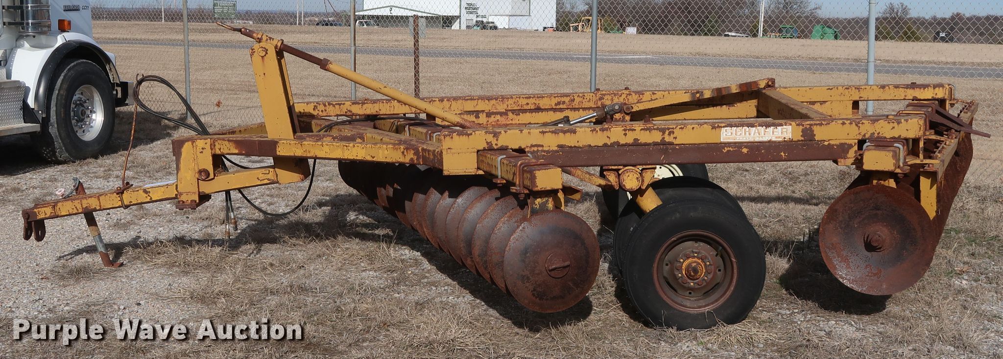 Purple Wave is selling a used Disk in Oklahoma. This item is a Schafer off-set disk with the following: 14'W, 20" diameter front disks, 22" diameter rear disks, 9" spacing, Disk scrapers, Hydraulic lift, 9.5L-15SL tires