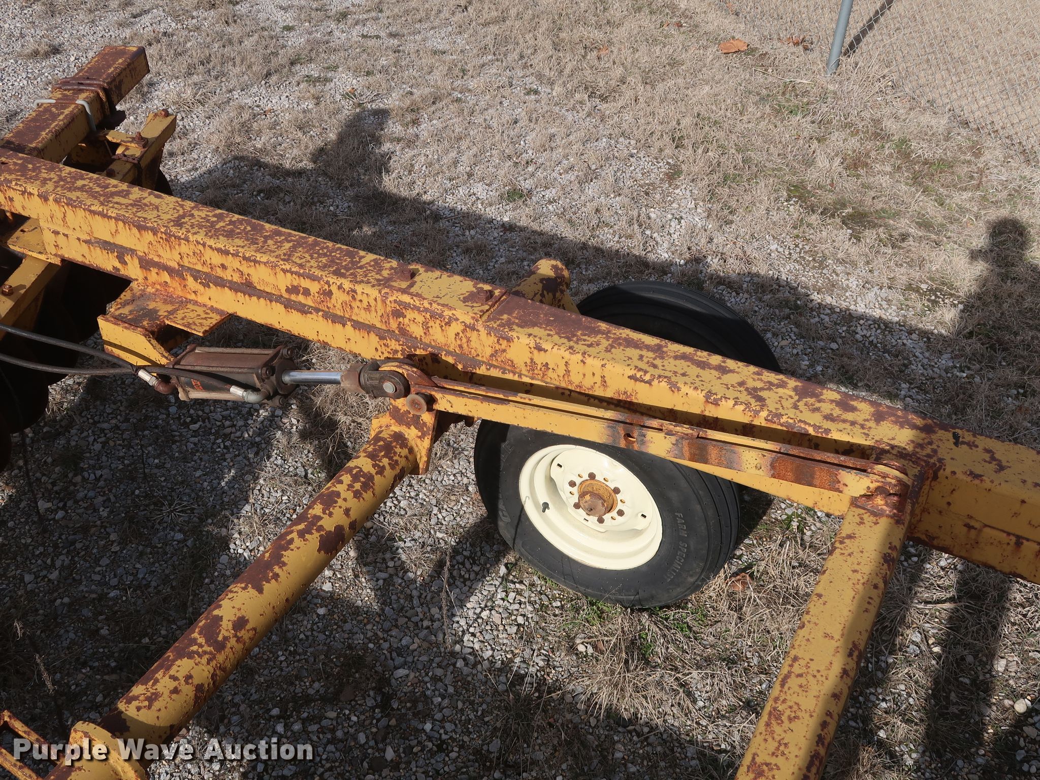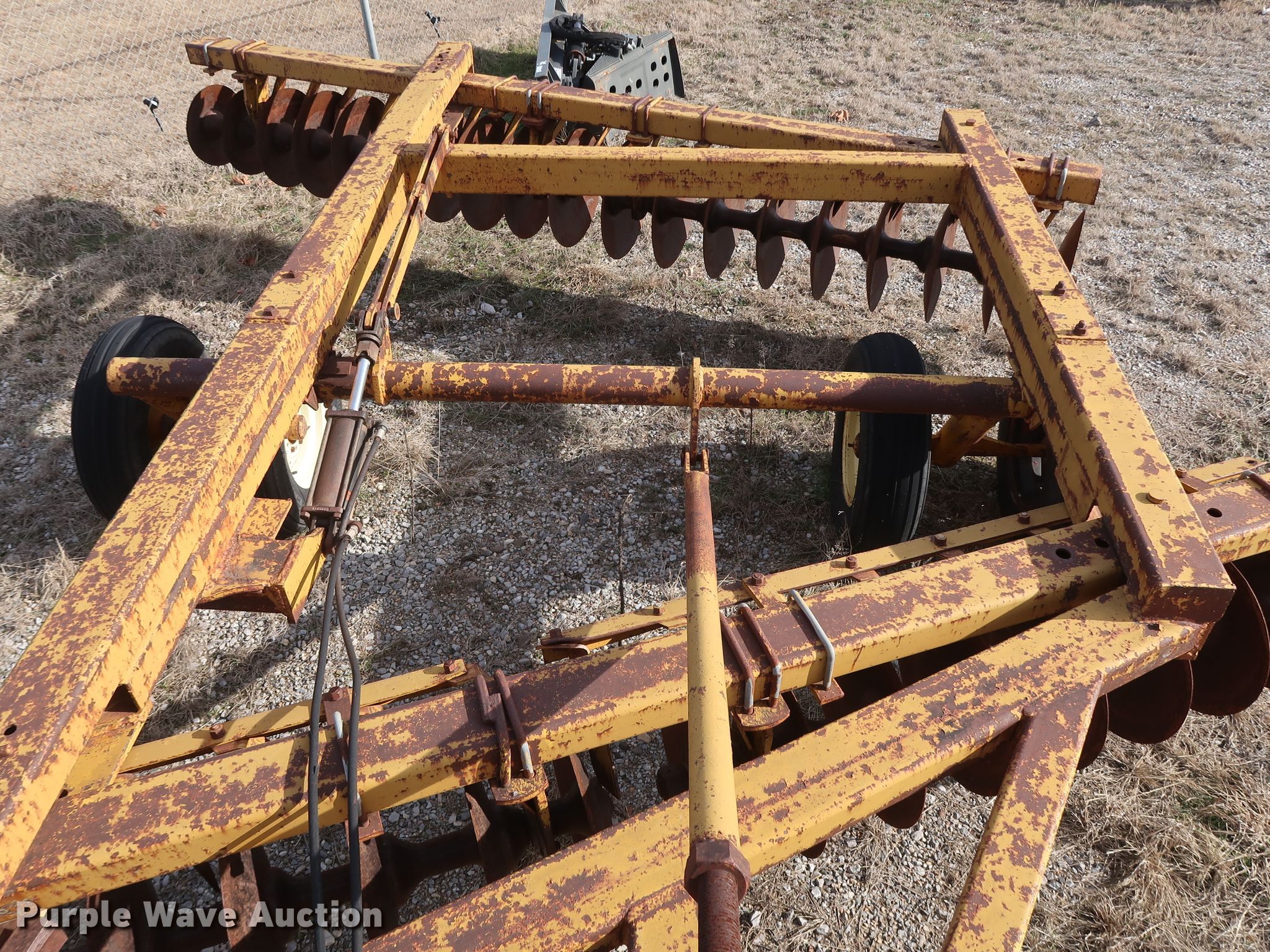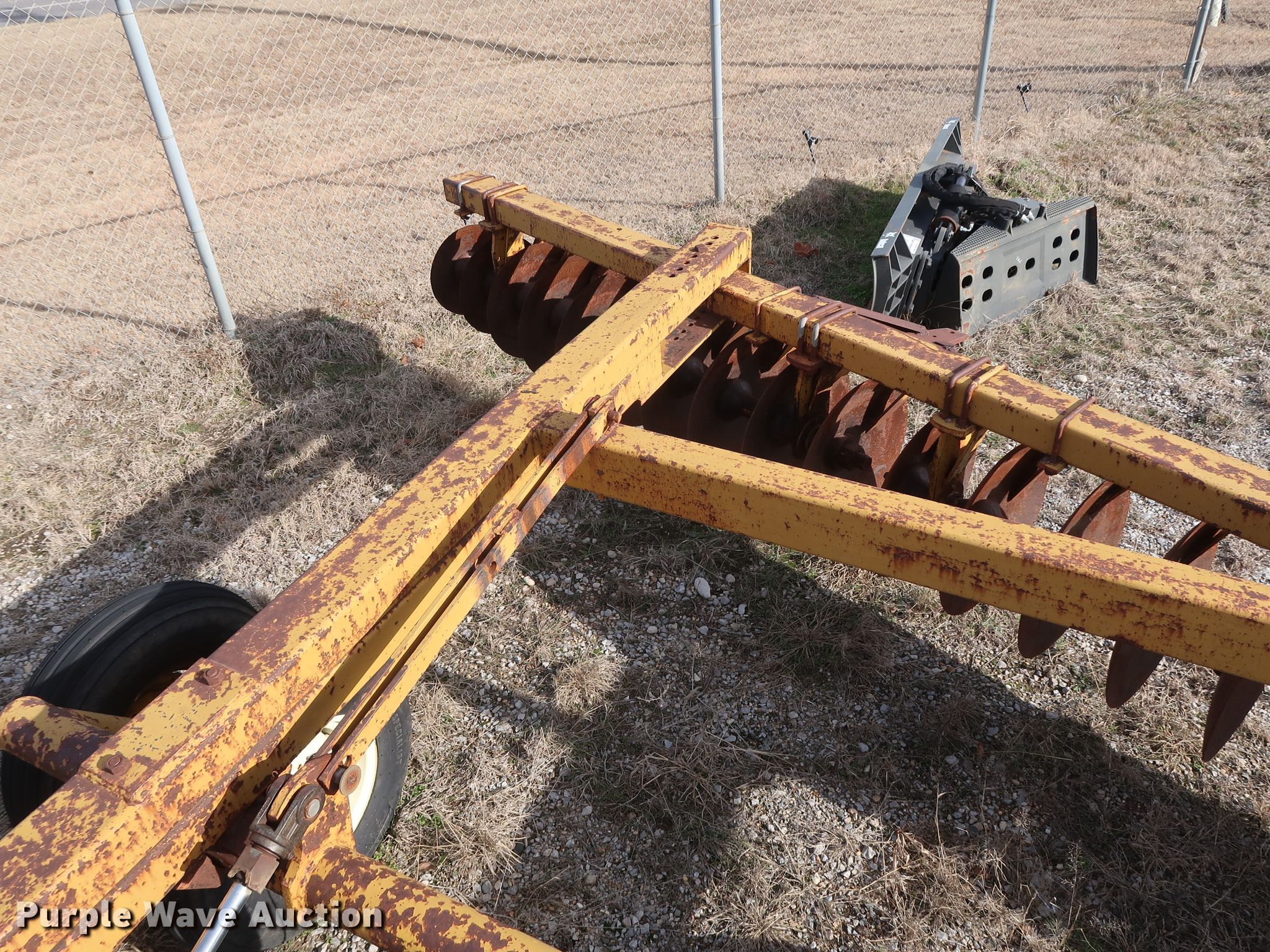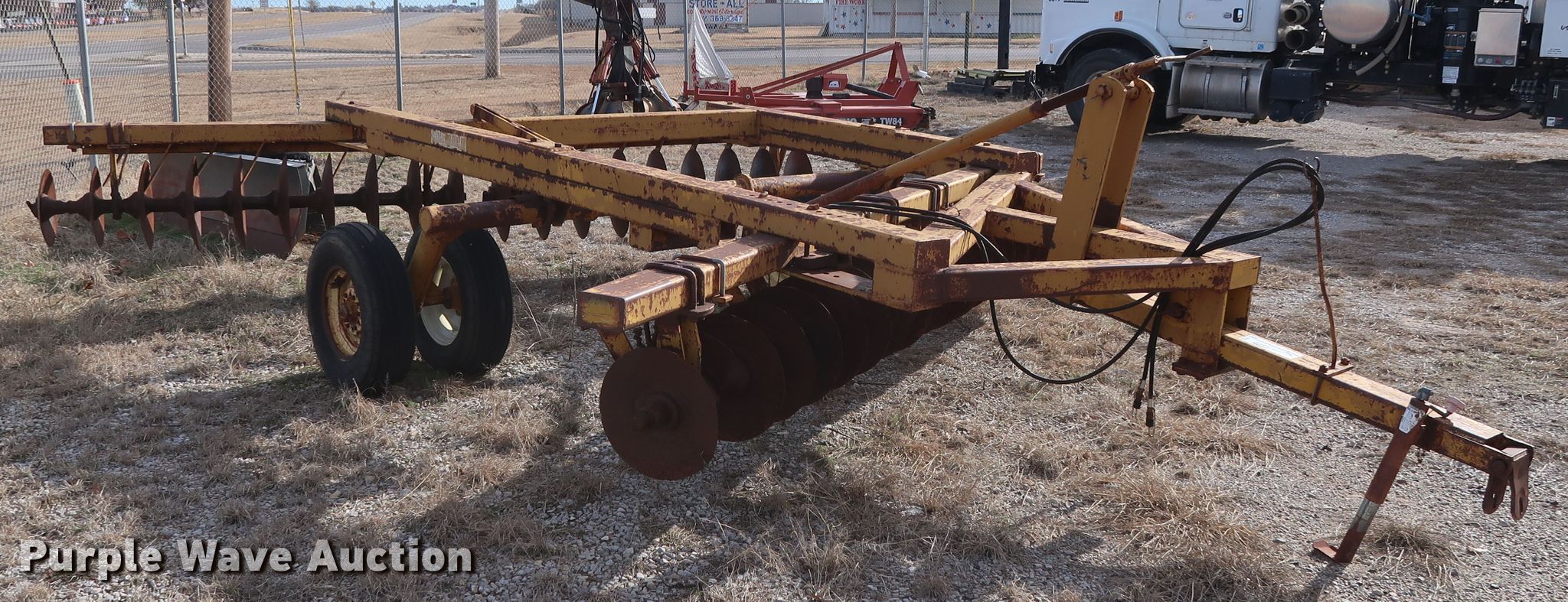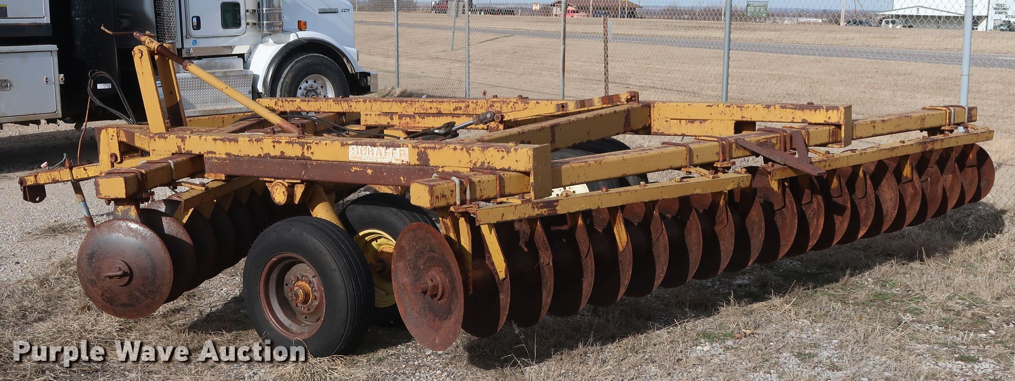Purple Wave is selling a used Disk in Oklahoma. This item is a Schafer off-set disk with the following: 14'W, 20" diameter front disks, 22" diameter rear disks, 9" spacing, Disk scrapers, Hydraulic lift, 9.5L-15SL tires