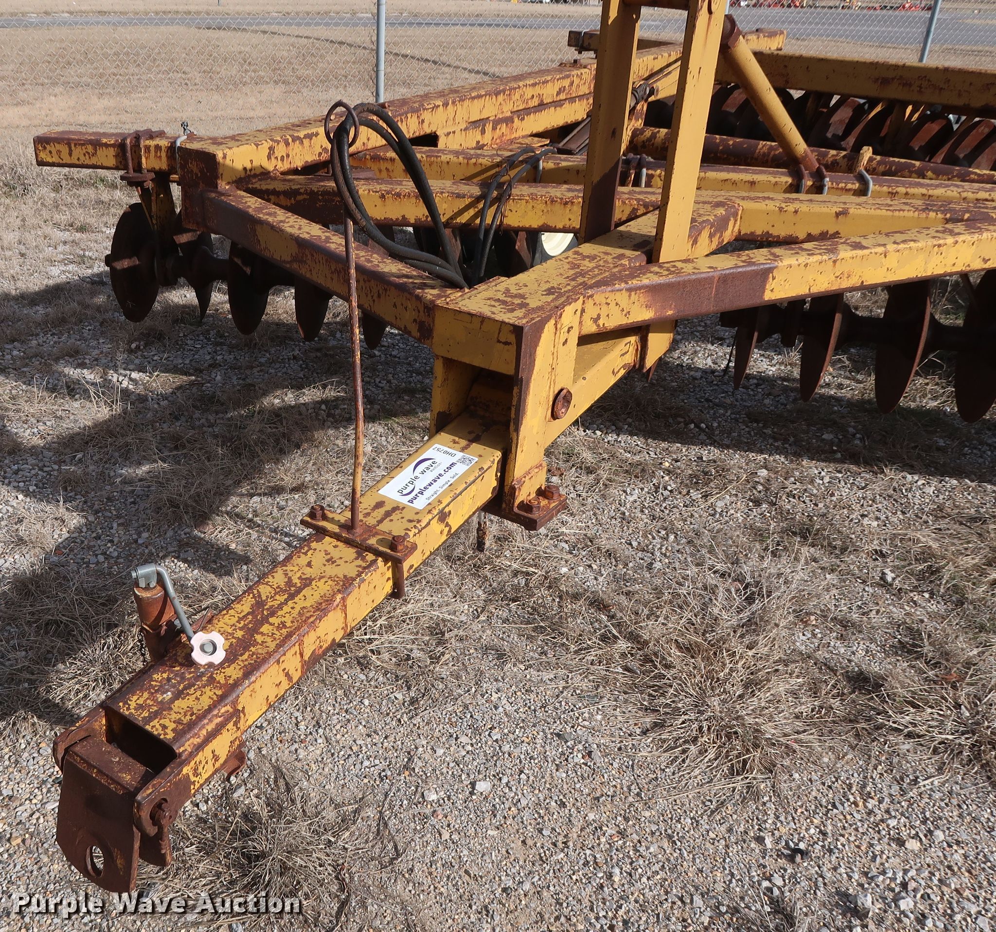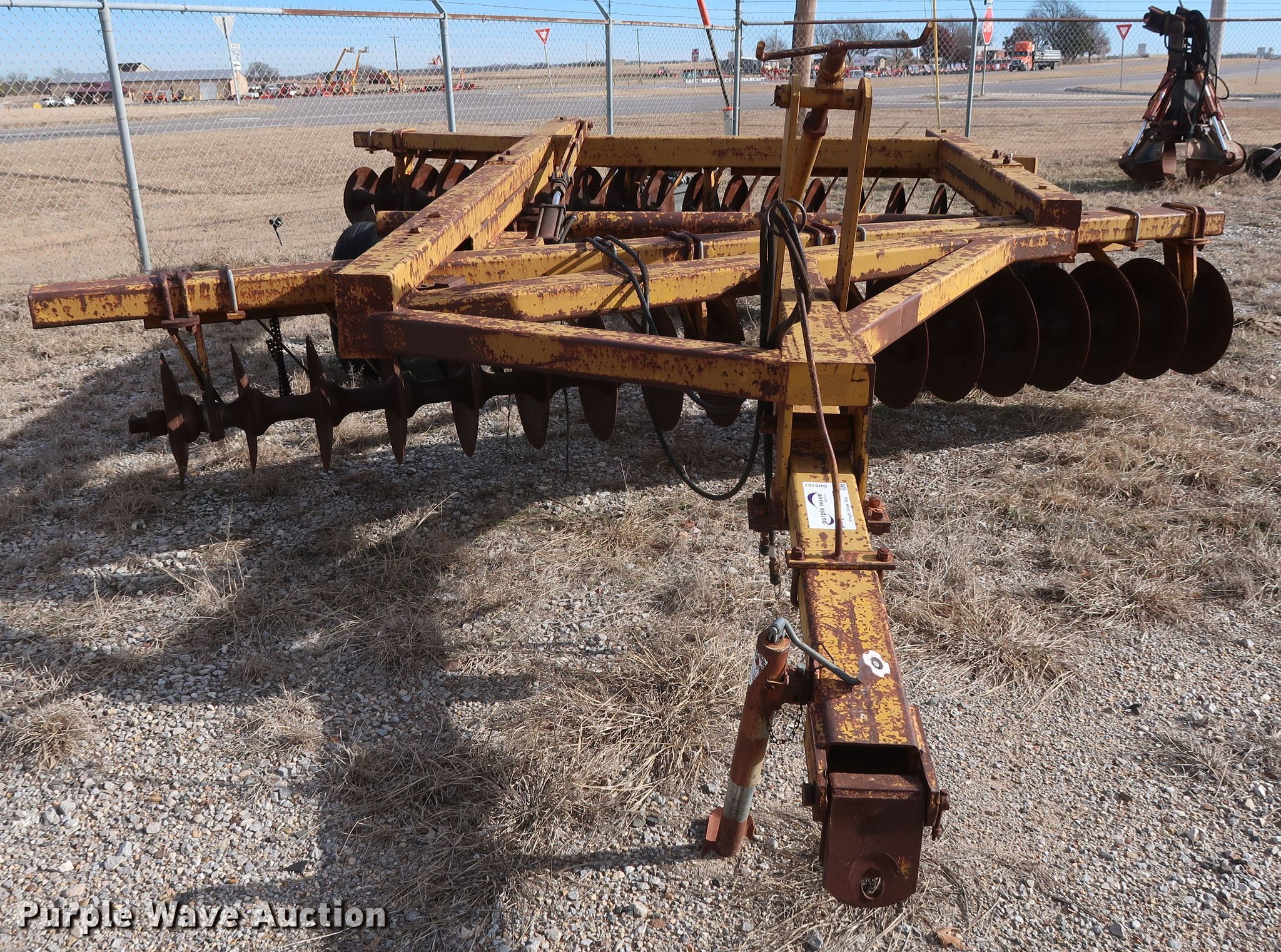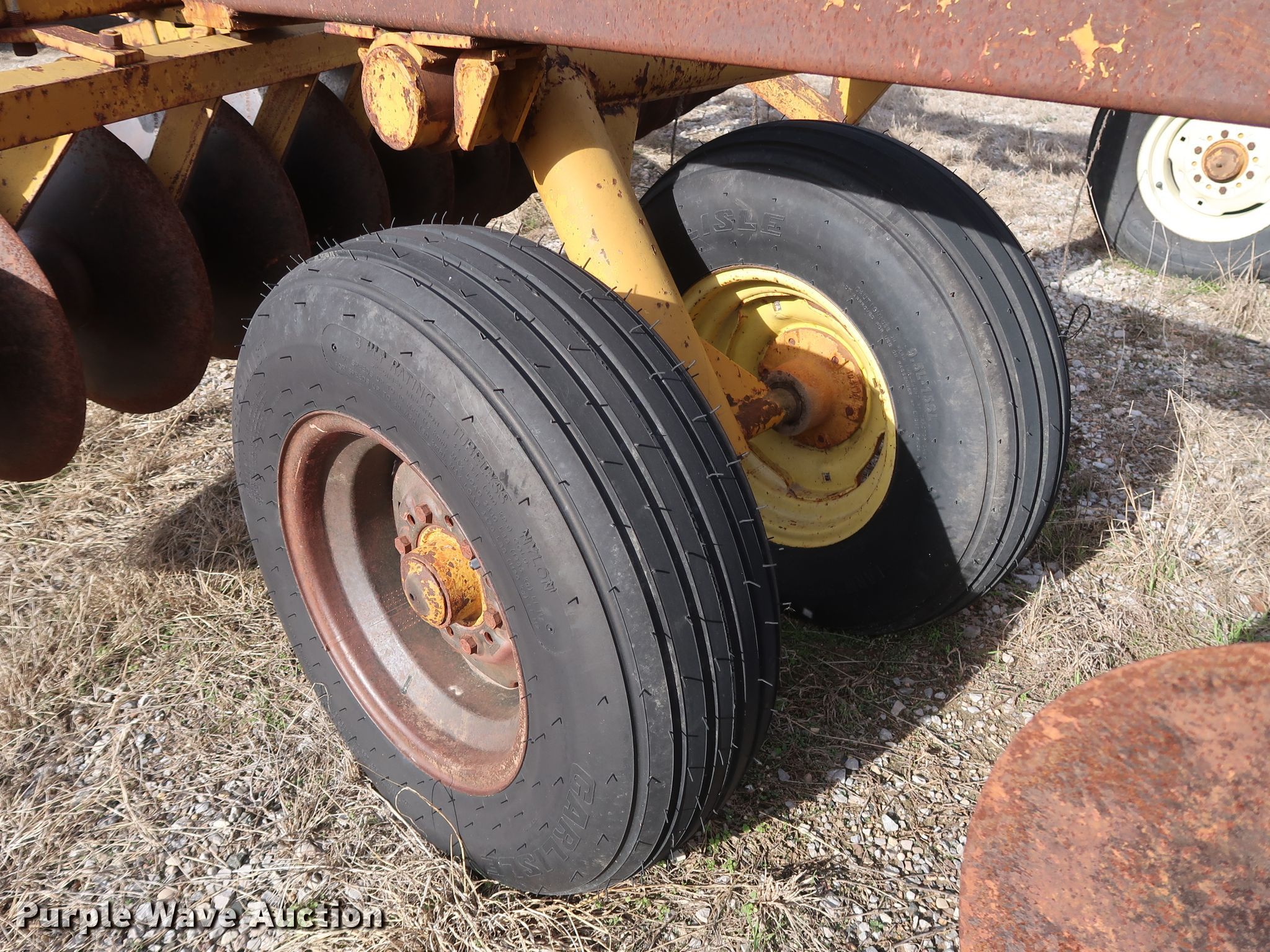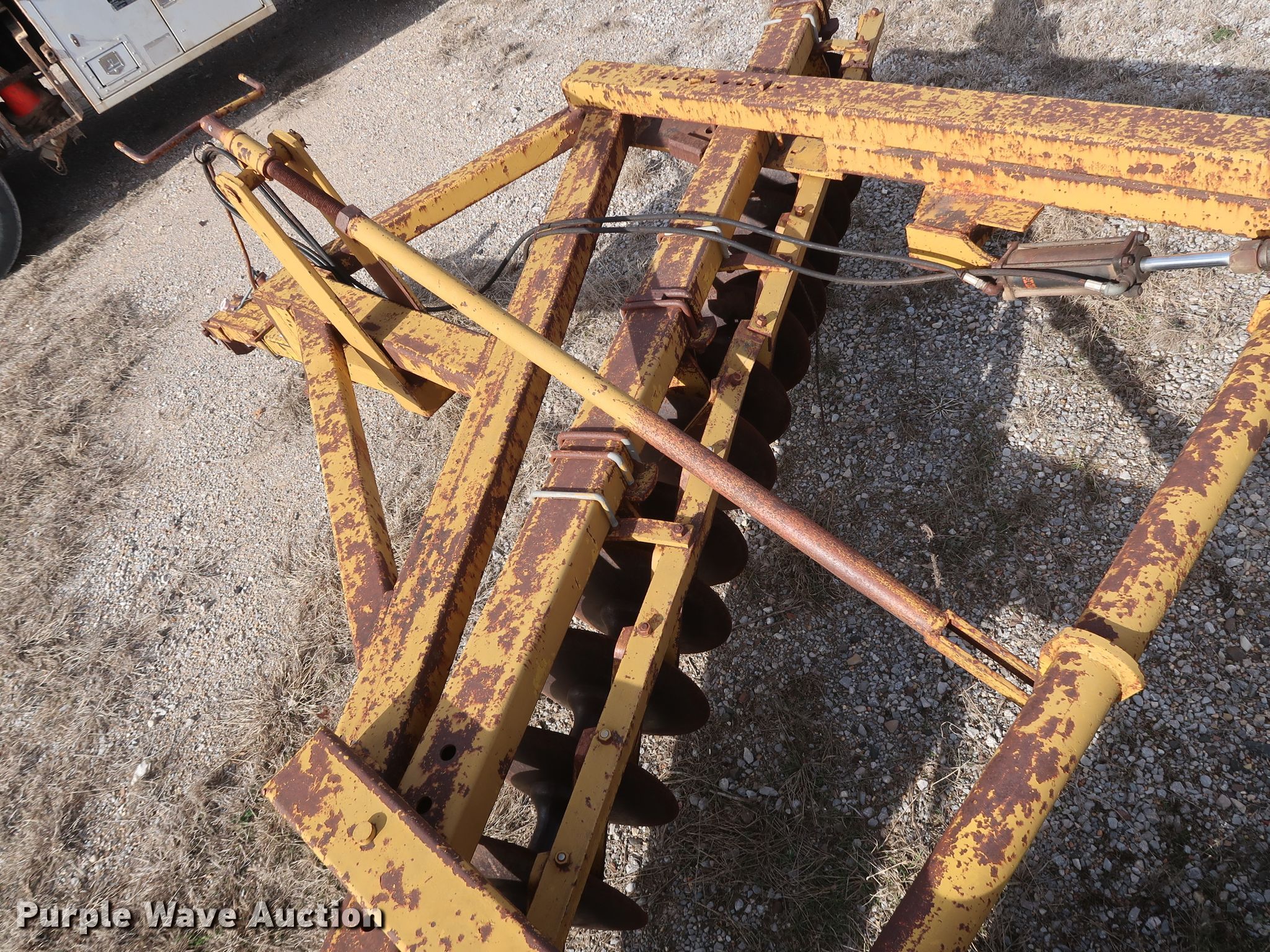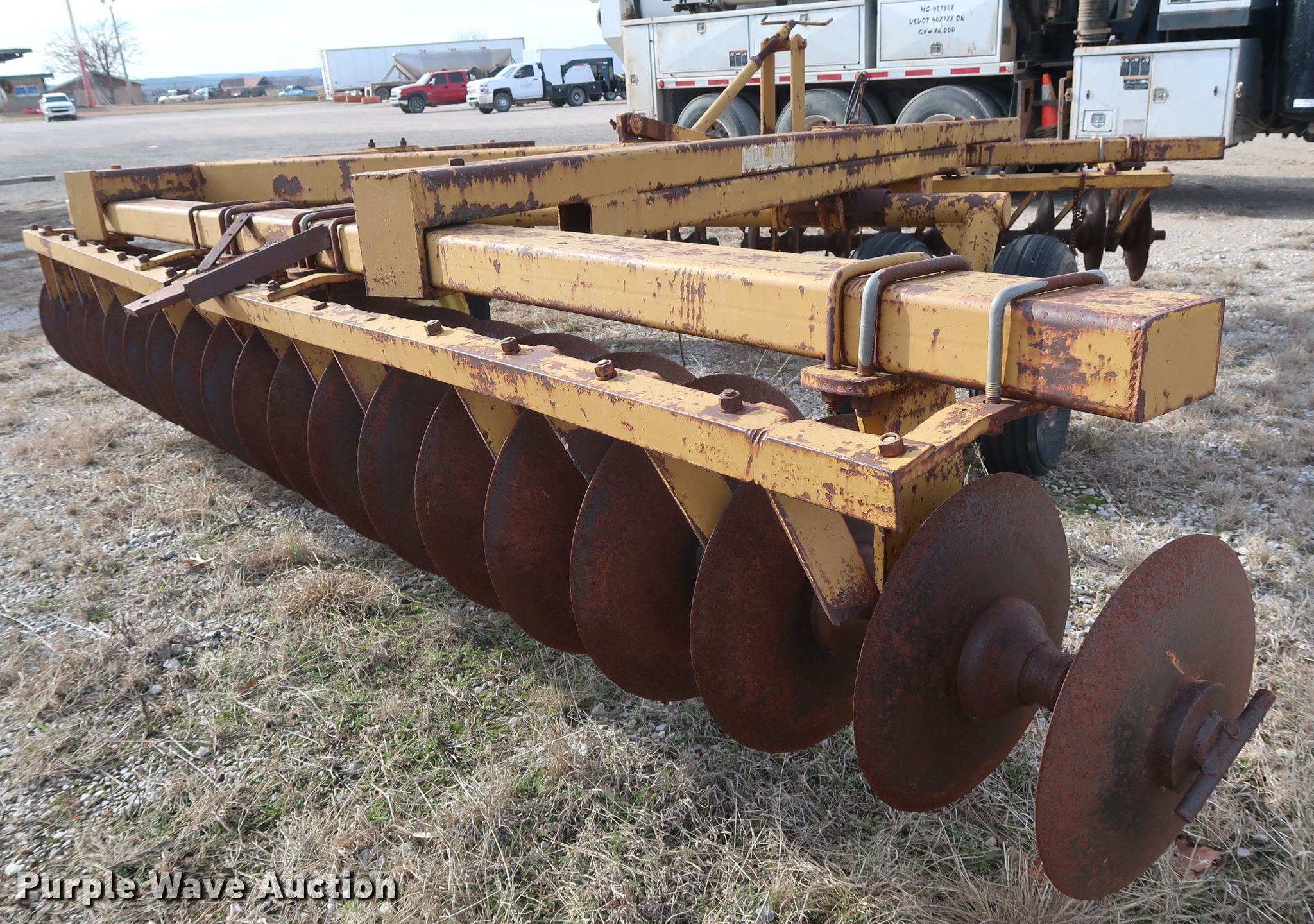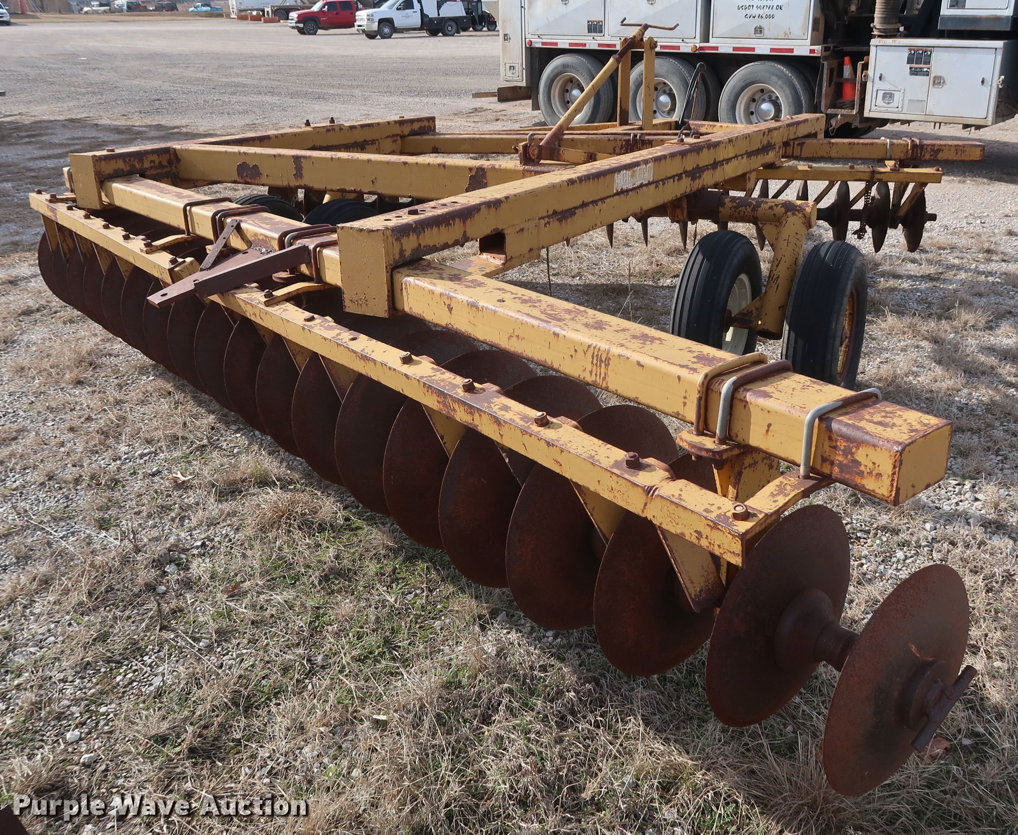 Purple Wave is selling a used Disk in Oklahoma. This item is a Schafer off-set disk with the following: 14'W, 20" diameter front disks, 22" diameter rear disks, 9" spacing, Disk scrapers, Hydraulic lift, 9.5L-15SL tires