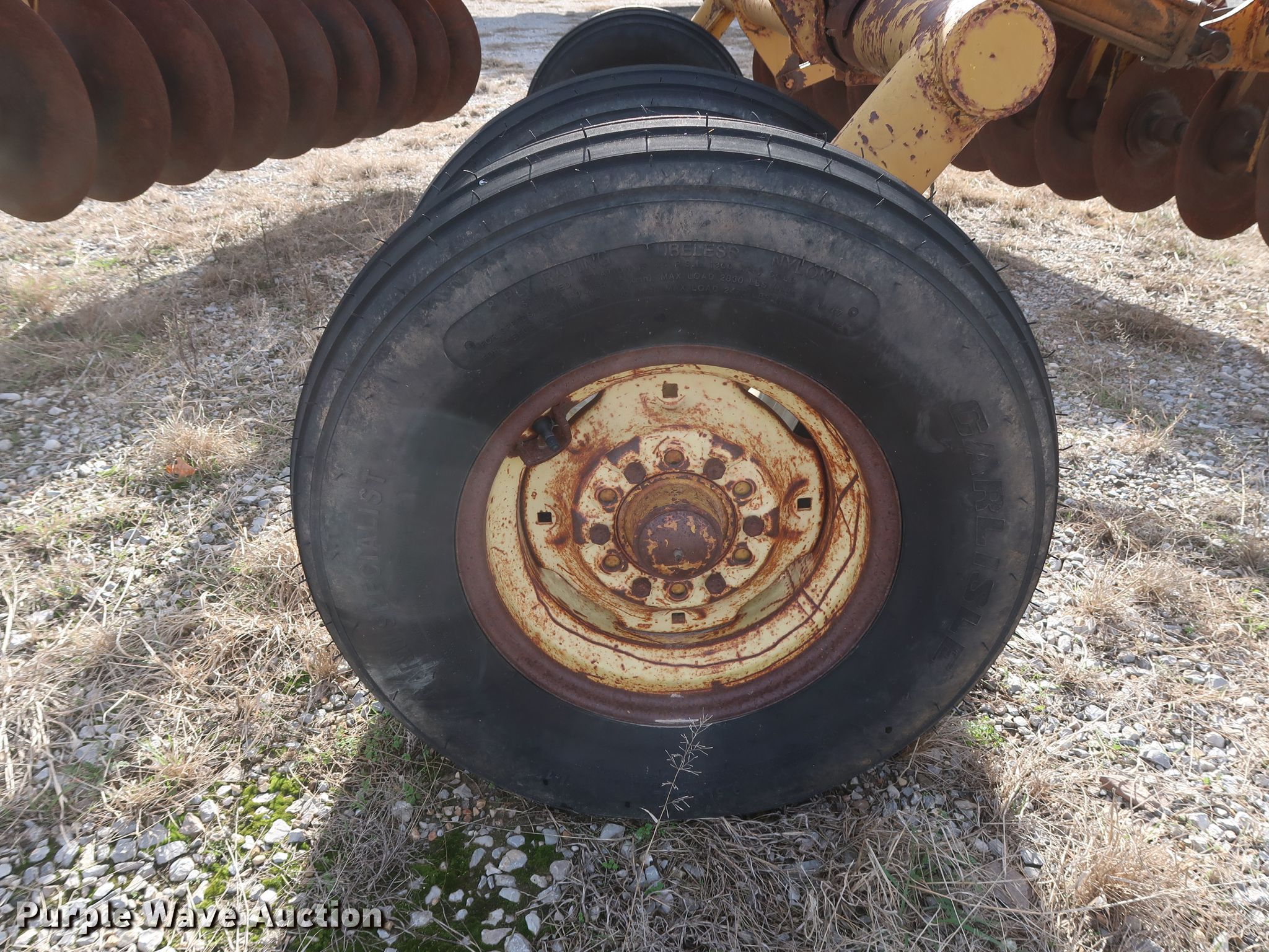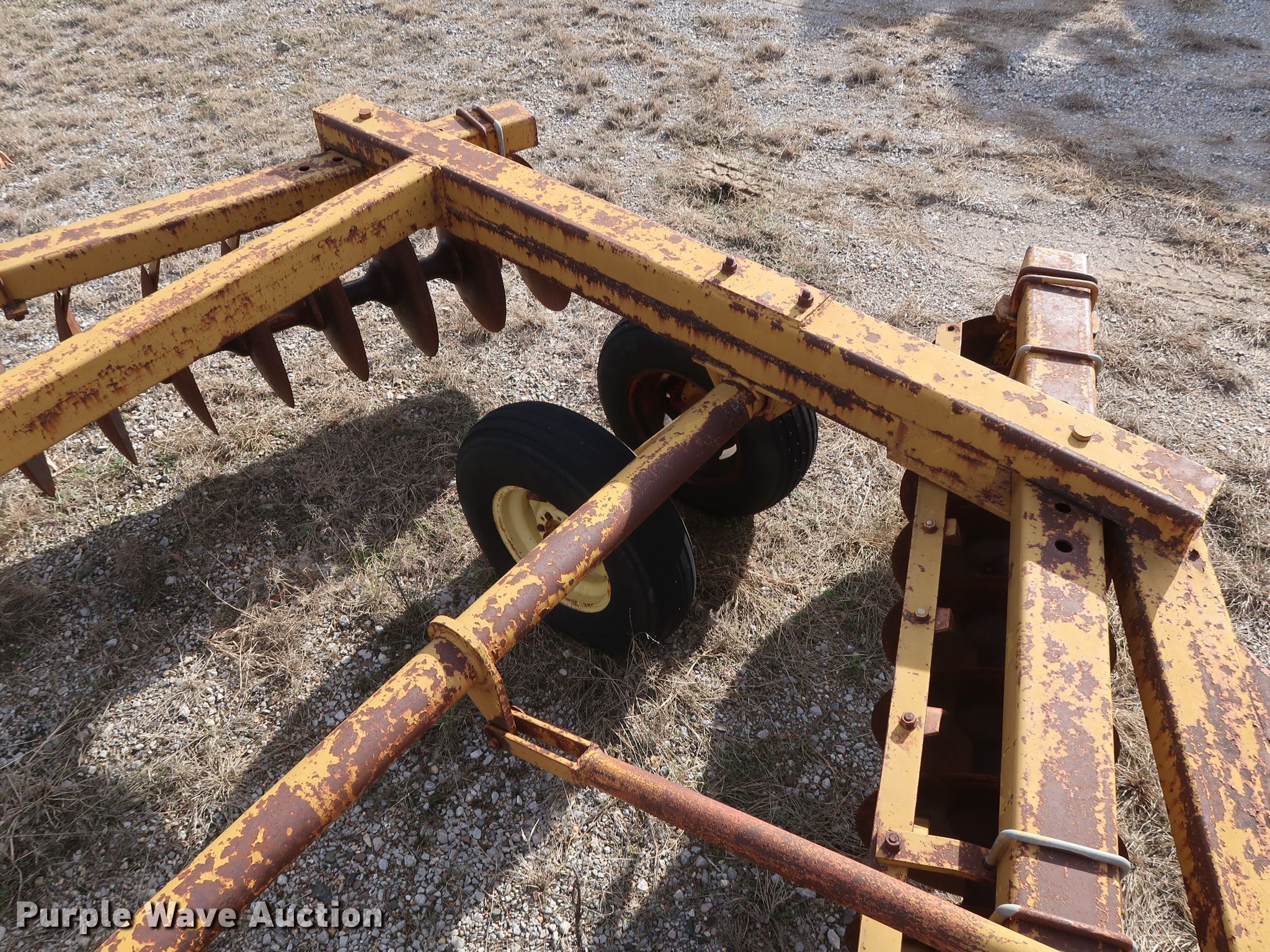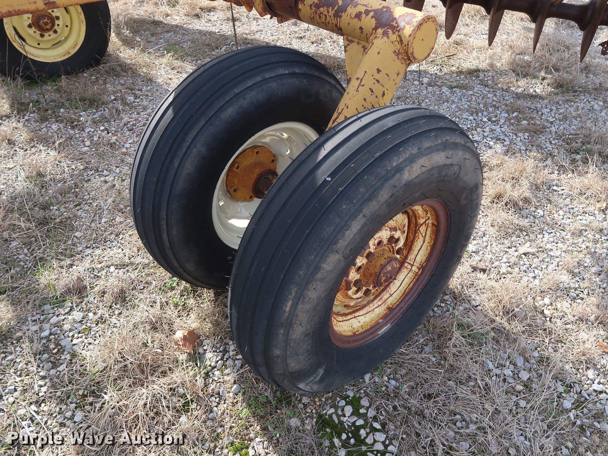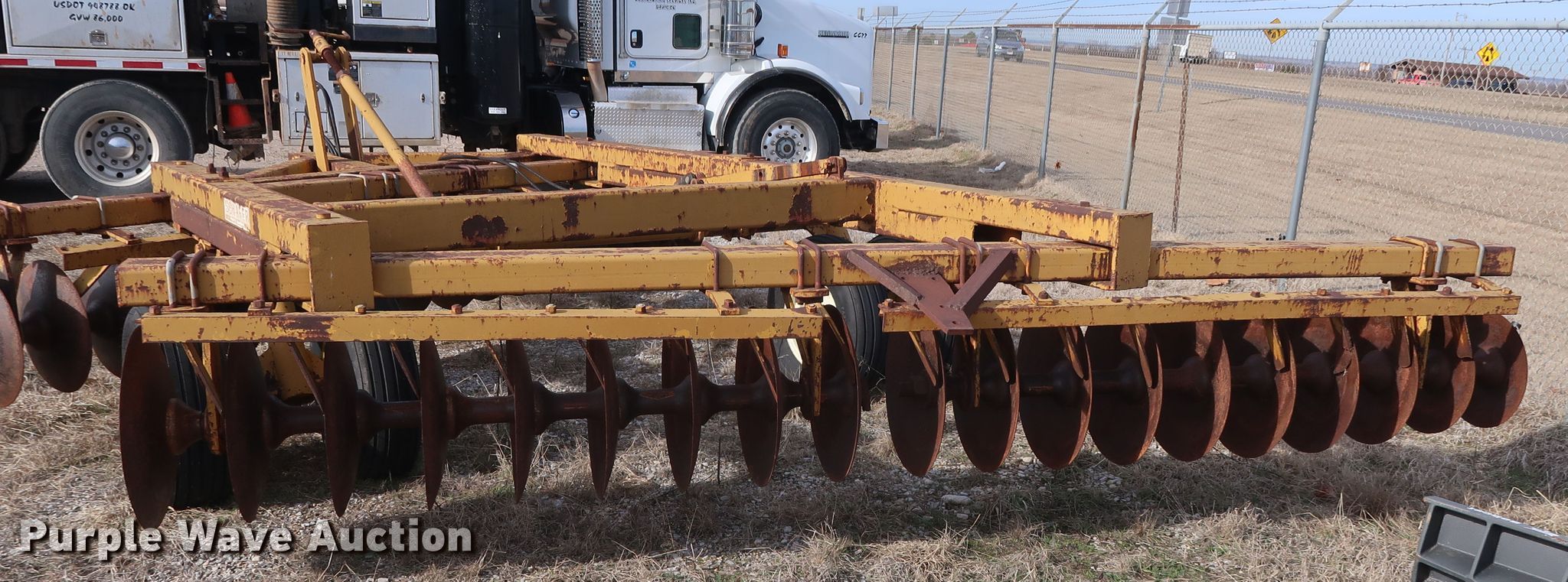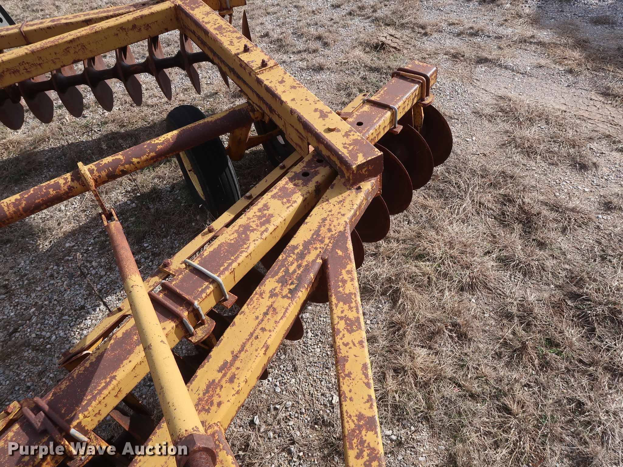 Purple Wave is selling a used Disk in Oklahoma. This item is a Schafer off-set disk with the following: 14'W, 20" diameter front disks, 22" diameter rear disks, 9" spacing, Disk scrapers, Hydraulic lift, 9.5L-15SL tires