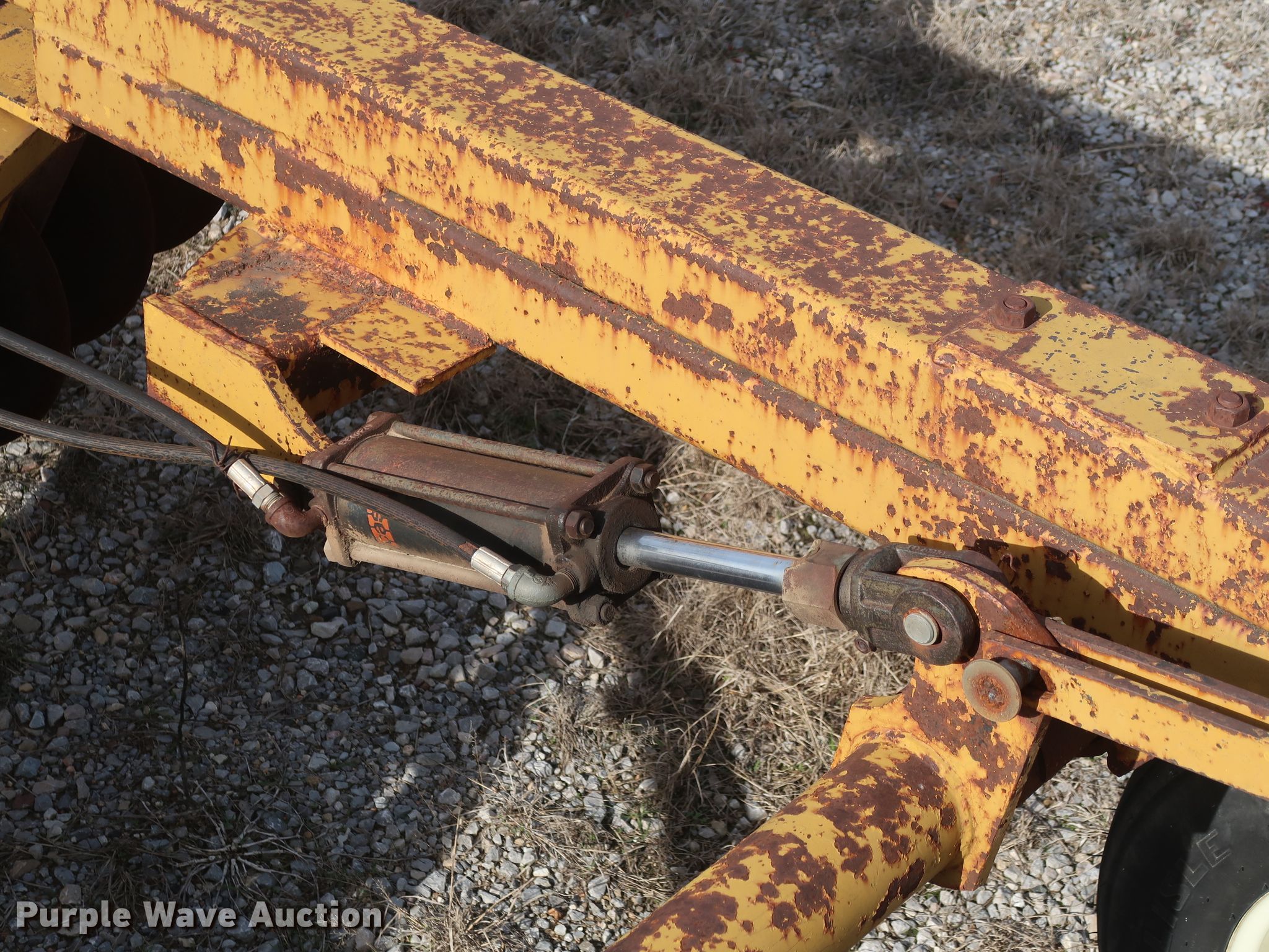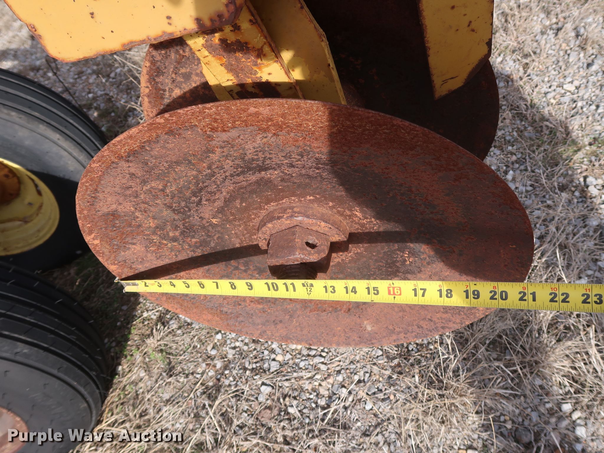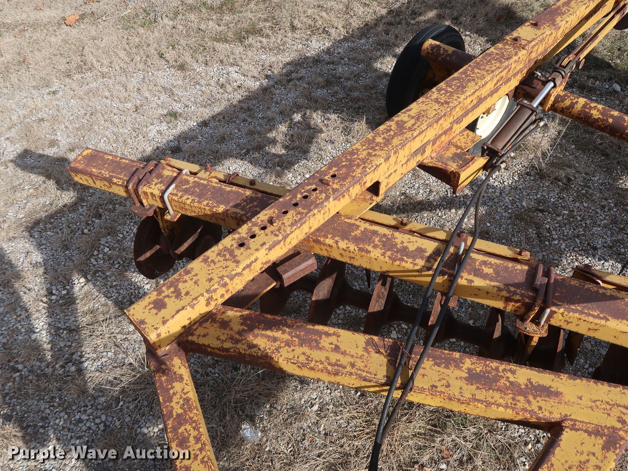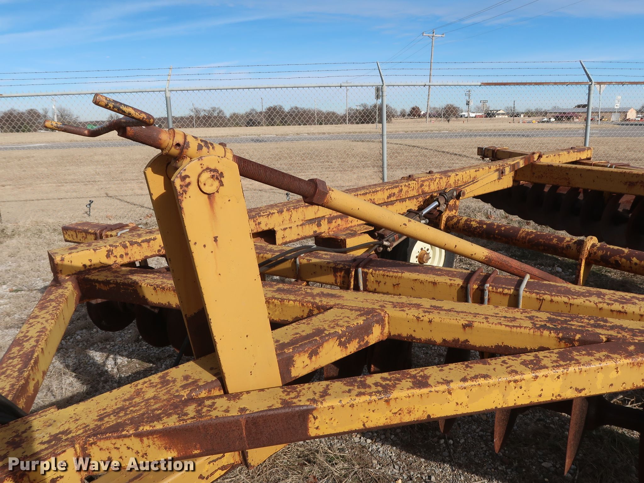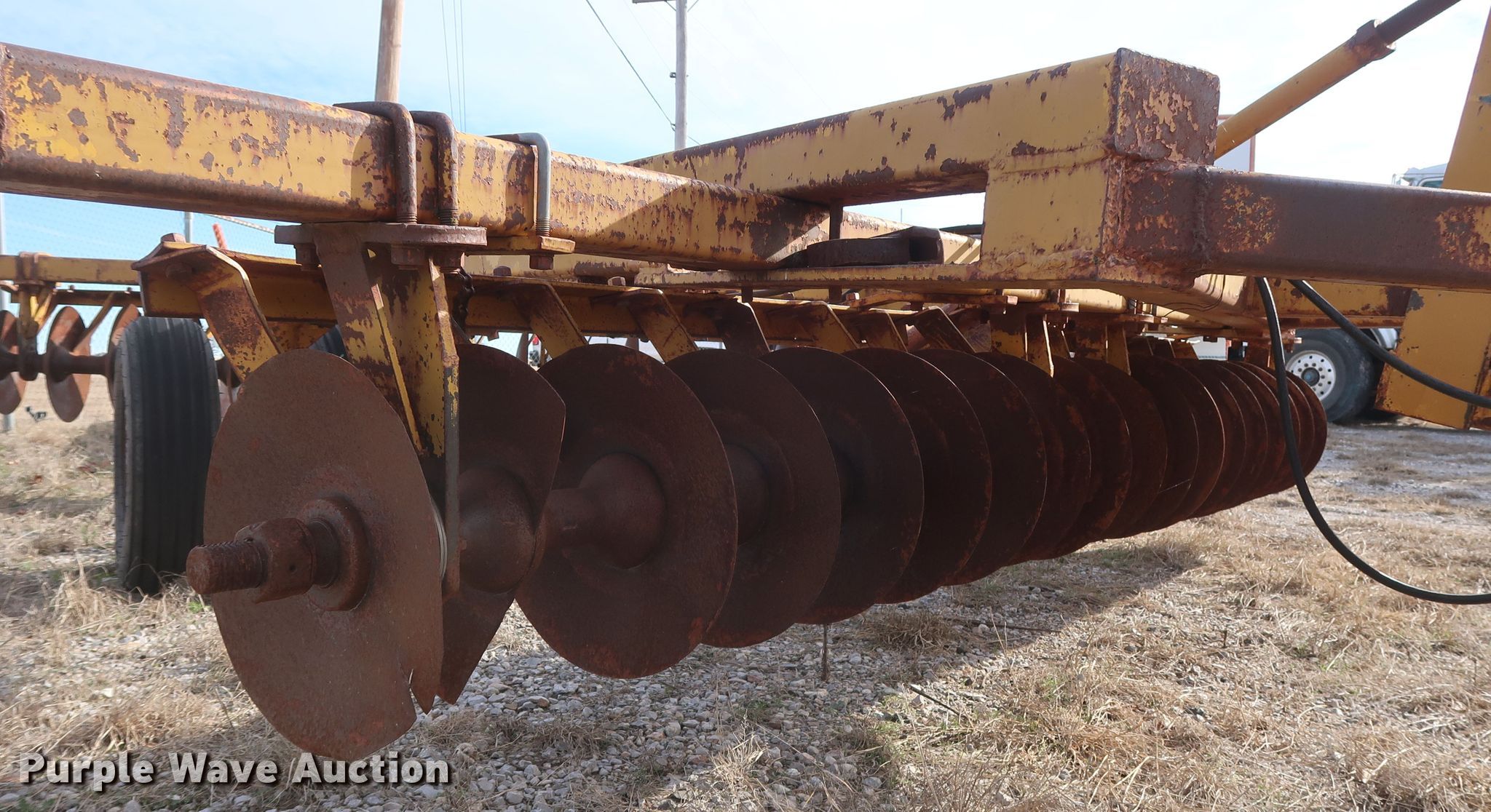 Purple Wave is selling a used Disk in Oklahoma. This item is a Schafer off-set disk with the following: 14'W, 20" diameter front disks, 22" diameter rear disks, 9" spacing, Disk scrapers, Hydraulic lift, 9.5L-15SL tires
