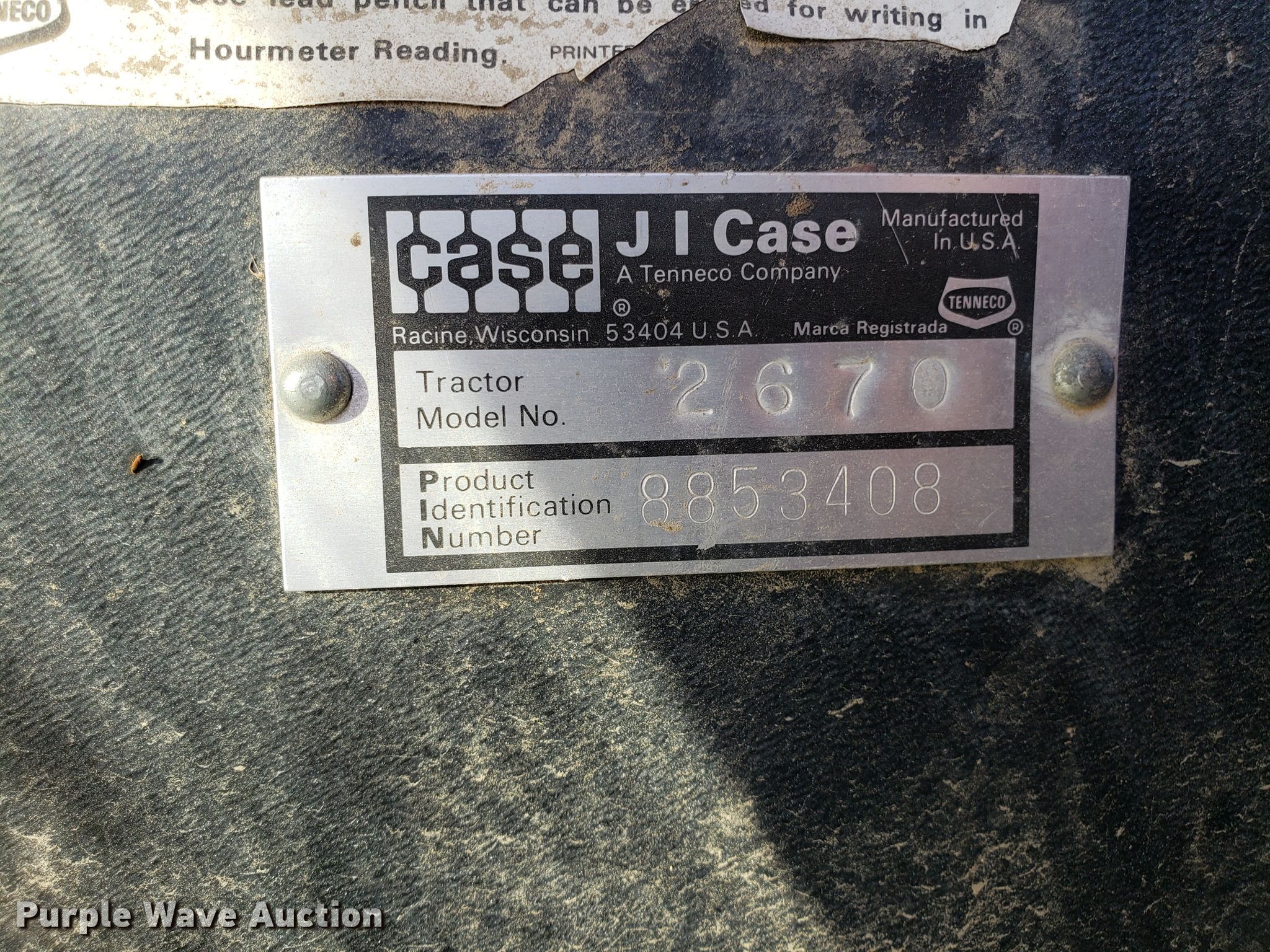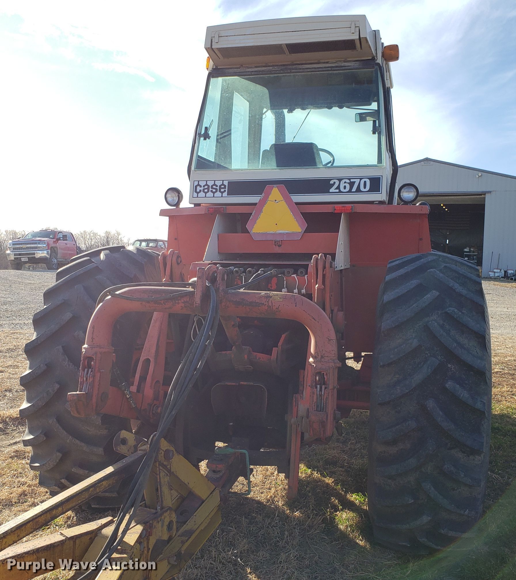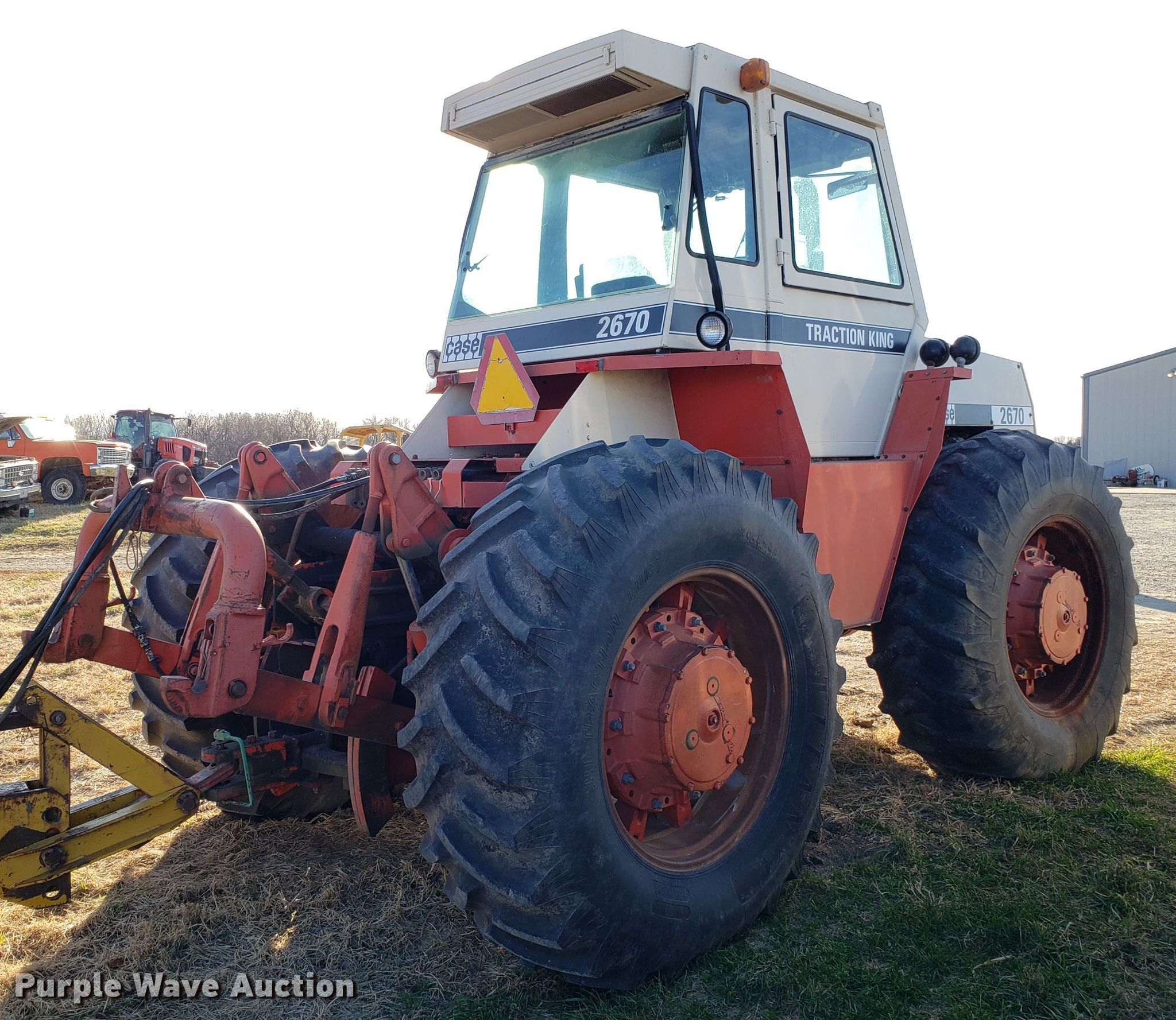 Purple Wave is selling a used Tractor in Missouri. This item is a Case 2670 Traction King 4WD tractor with the following: 4,687 hours on meter, Six cylinder diesel engine, Powershift transmission, 12F-4R gears, Four wheel drive, AC and heat, Three point, Top link, Quick attach, 1000 PTO, (4) rear hydraulic remotes, 20.8-34 tires, Serial 8853408