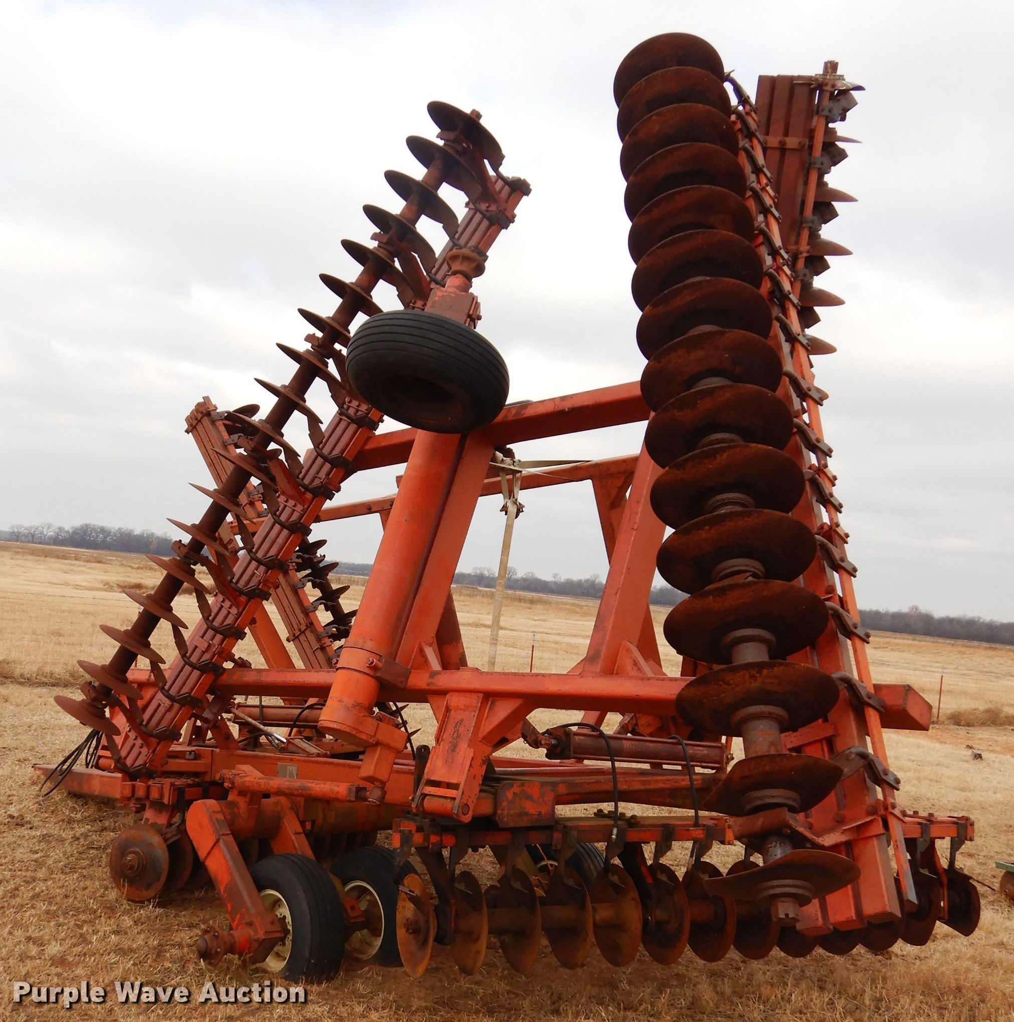 Purple Wave is selling a used Disk in Oklahoma. This item is a Miller tandem disk with the following: 30'W, 16" diameter disks, Hydraulic lift and fold, 11L-15 tires, Parts missing, Lift cylinder needs to be replaced, Some tires and wheels missing, Serial 1SFN-3-625S