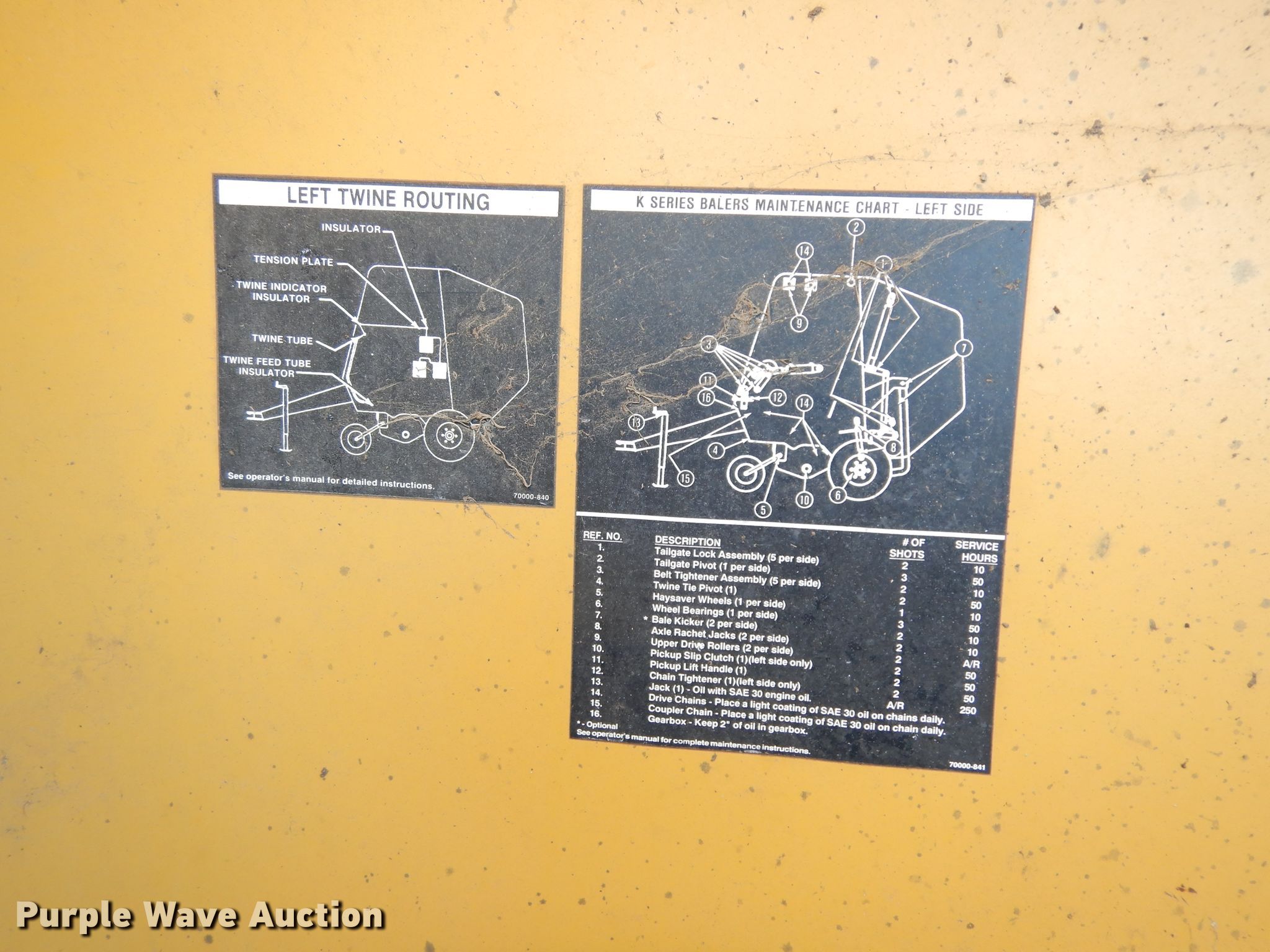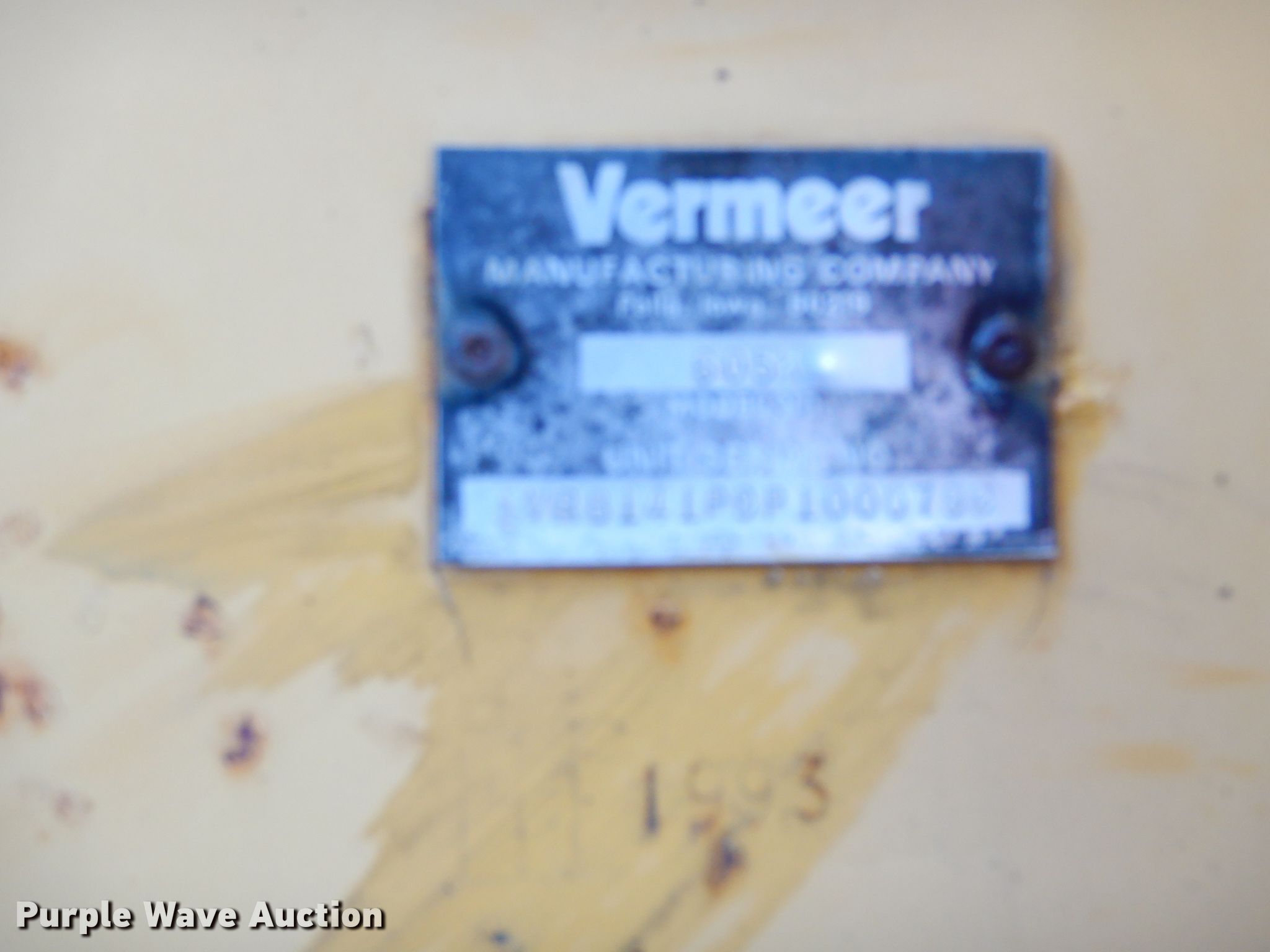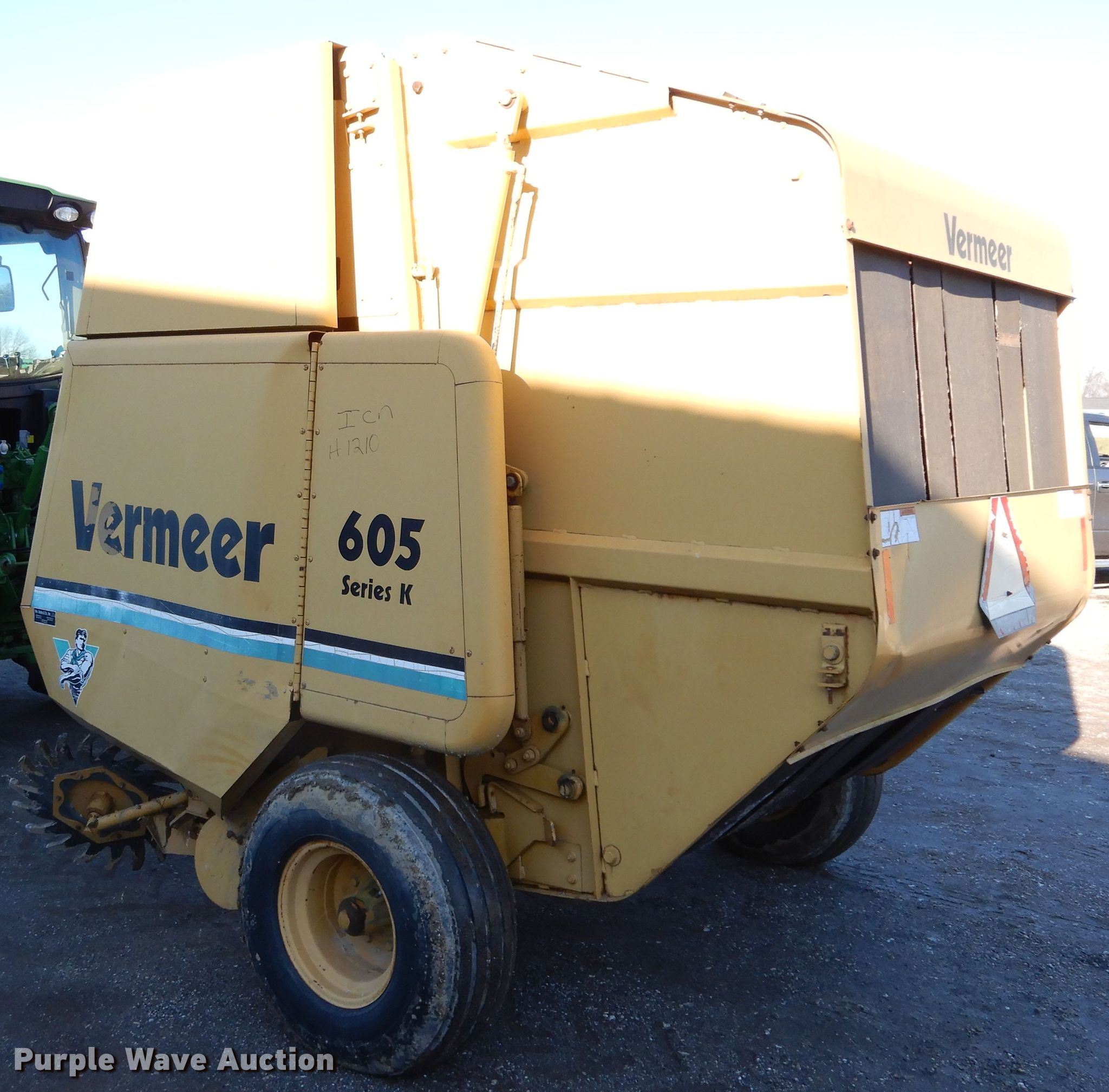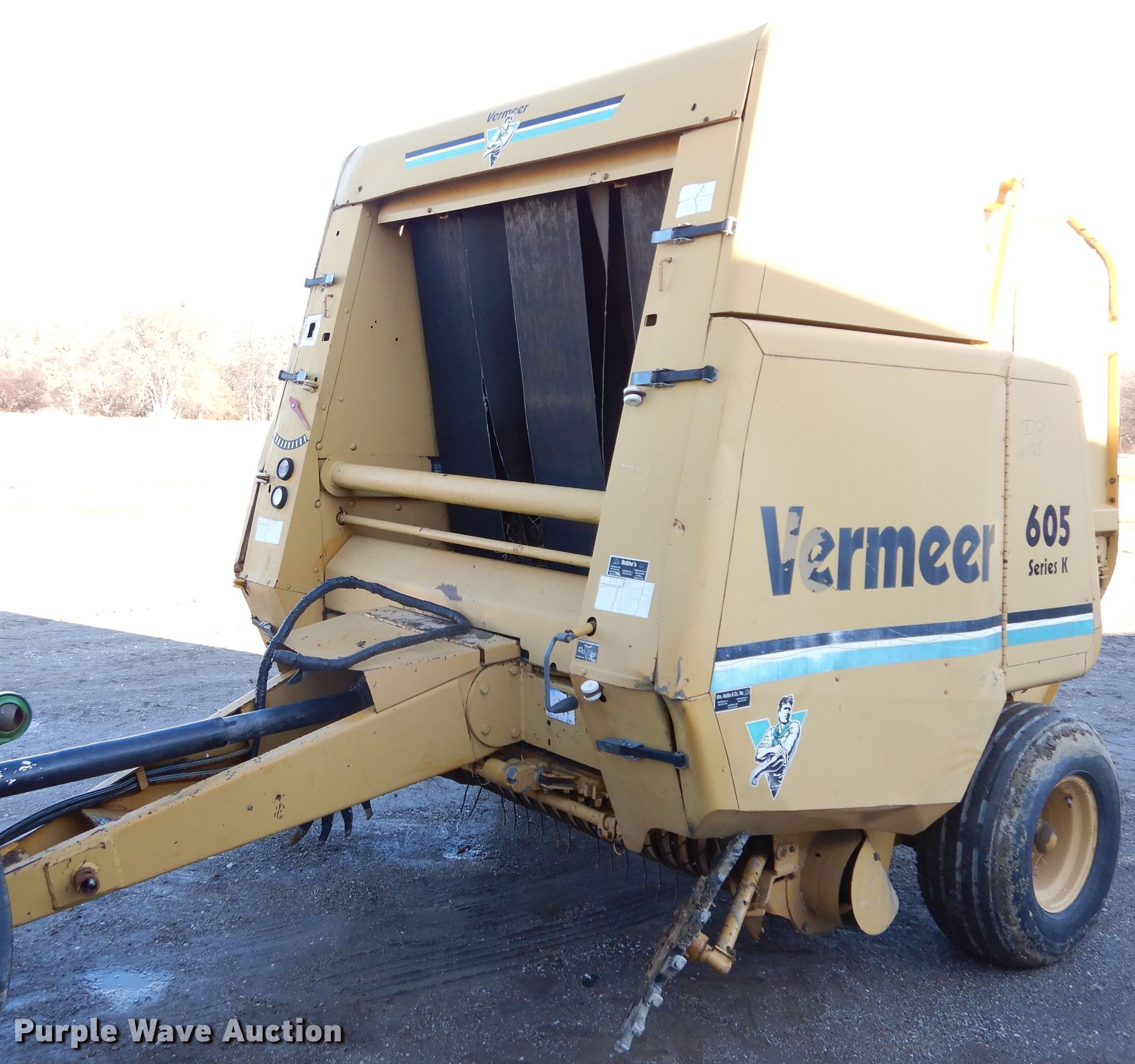 Purple Wave is selling a used Round Baler in Illinois. This item is a 1993 Vermeer 605 round baler with the following: 5' x 6' bale capacity, 60"W pickup, Gathering wheels, Feed assist roller, Vermeer 1-90-115214 monitor, Auto-tie, Twine tie, Bale kicker, 540/1000 PTO, 12.5-15 tires, Serial 49BB141PDP1000790
