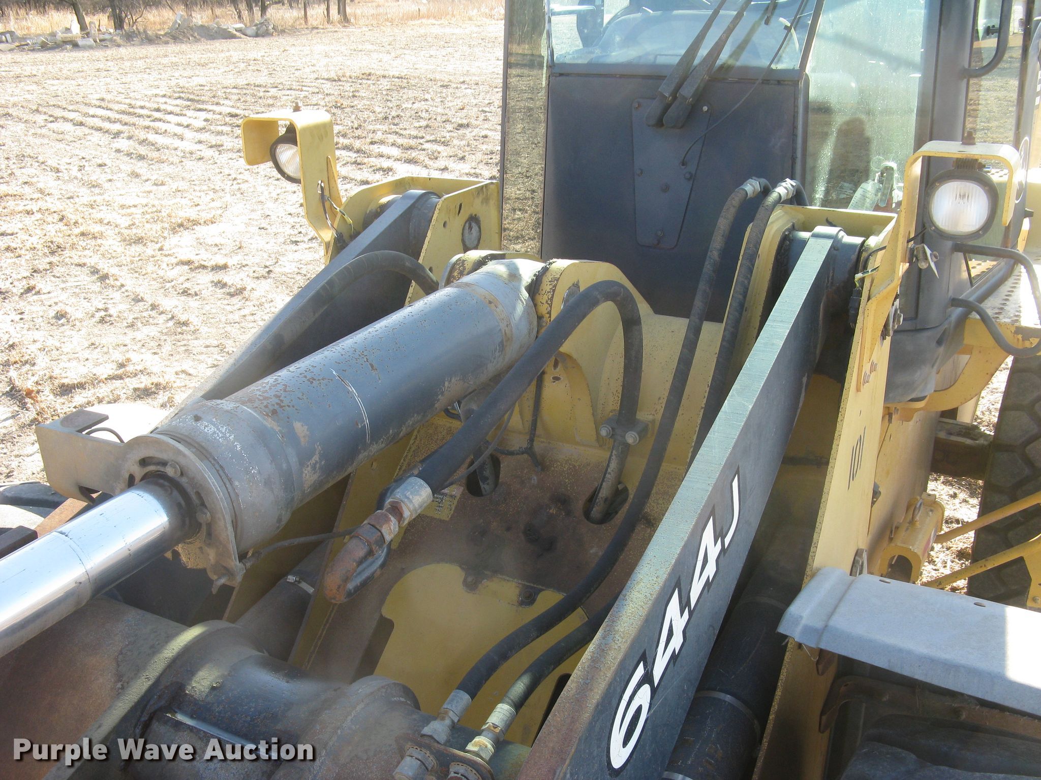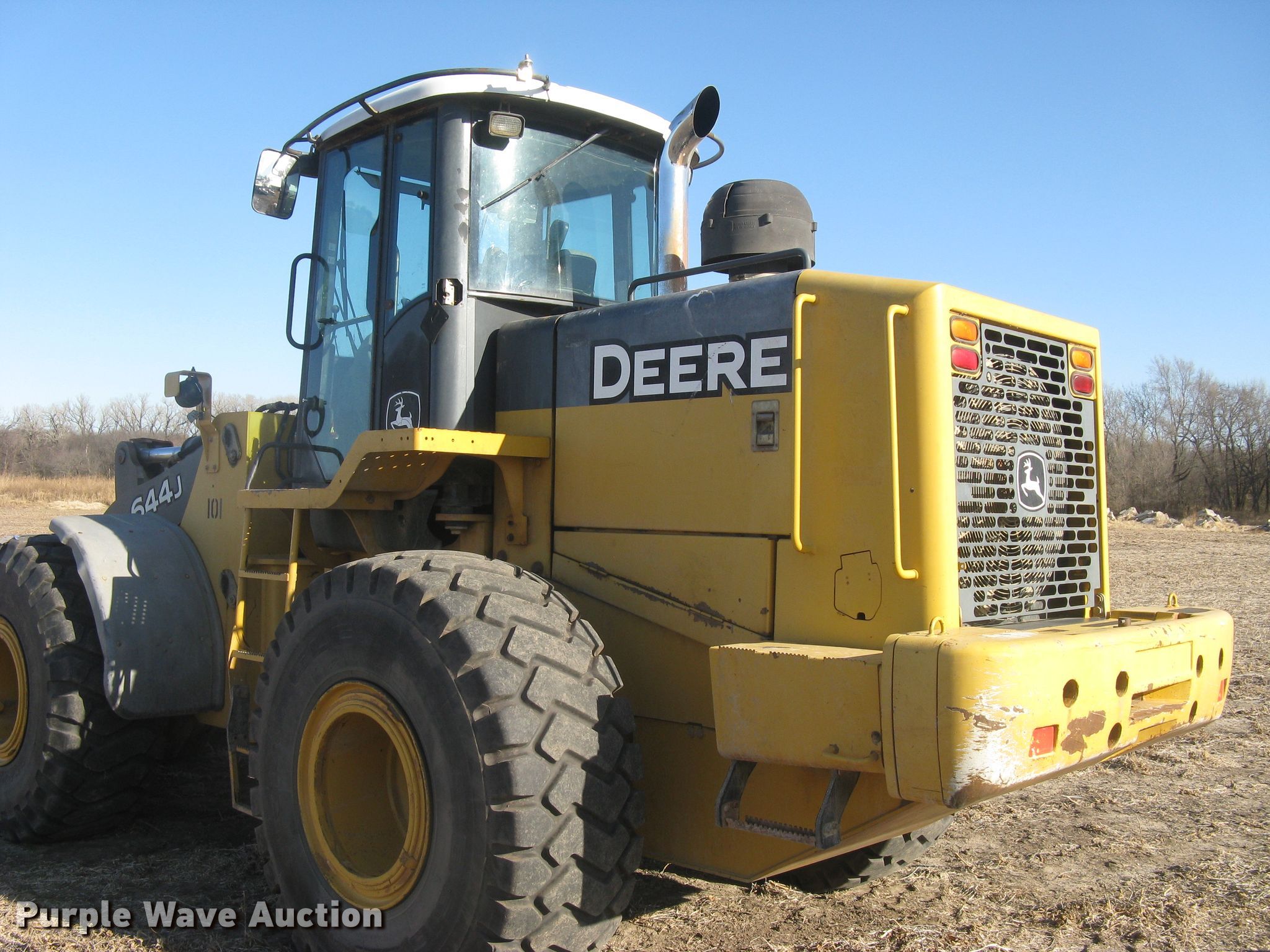 Purple Wave is selling a used Wheel Loader in Kansas. This item is a 2004 John Deere 644J wheel loader with the following: 21,001 hours on meter, 1,958 miles on odometer, John Deere 6081HDW08 8.1L six cylinder diesel engine, 148.6 kW, Serial RG6081H241229, Powershift transmission, 4F-4R gears, Differential lock, EROPS, AC and heat, Joystick bucket controls, Front auxiliary hydraulics, John Deere 120"W bucket, Bolt-on cutting edge, 4.5 cu.yd. capacity, 23.5R25 tires, Engine overhaul completed 02/2015, Estimated 200 hours since overhaul