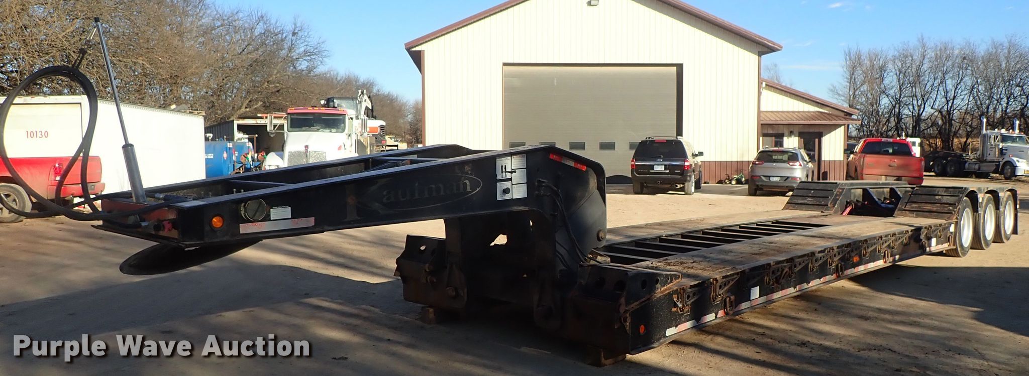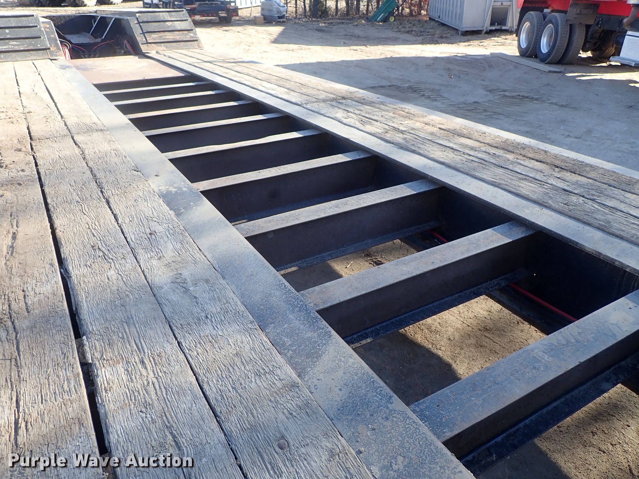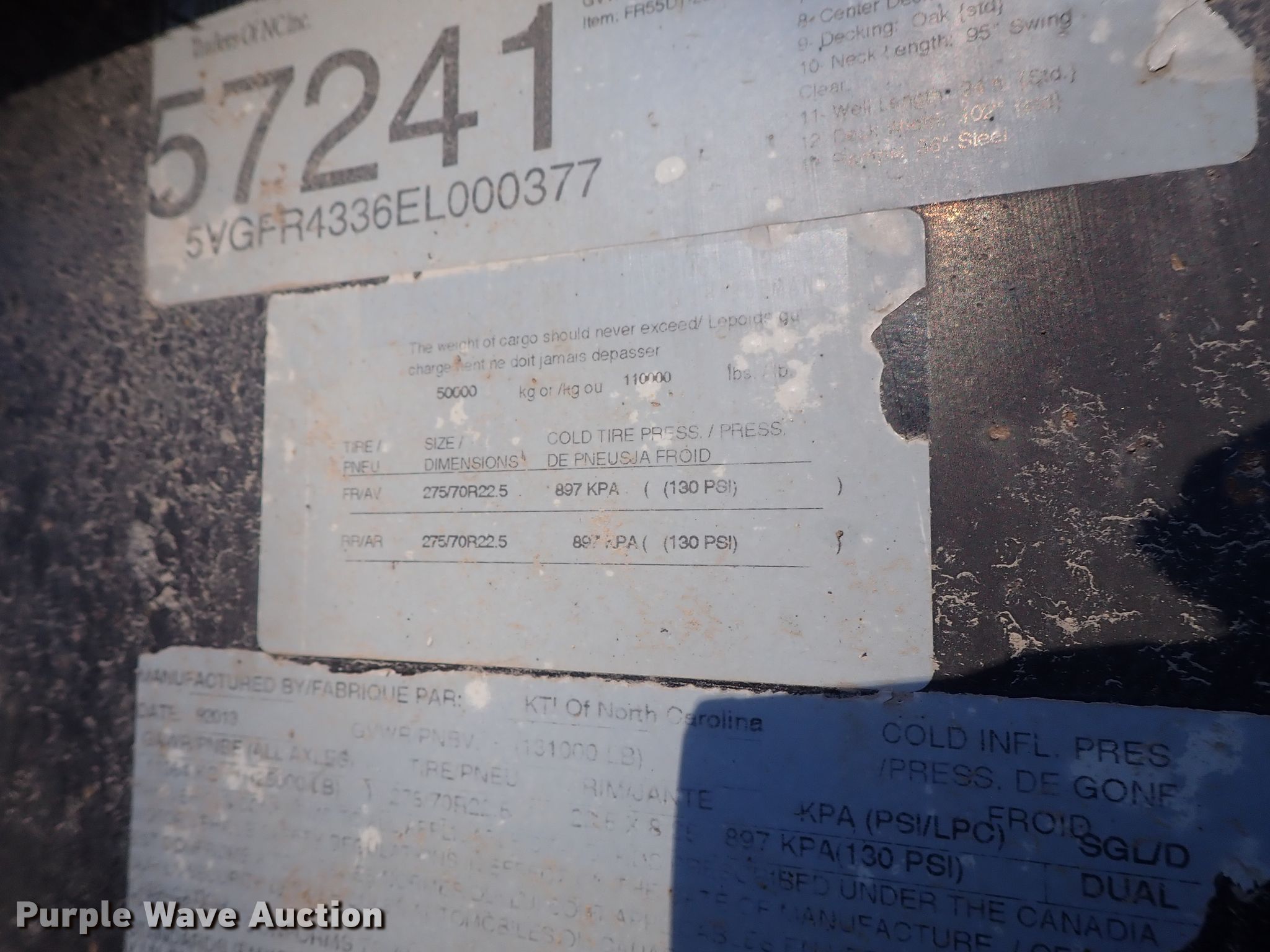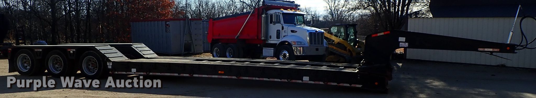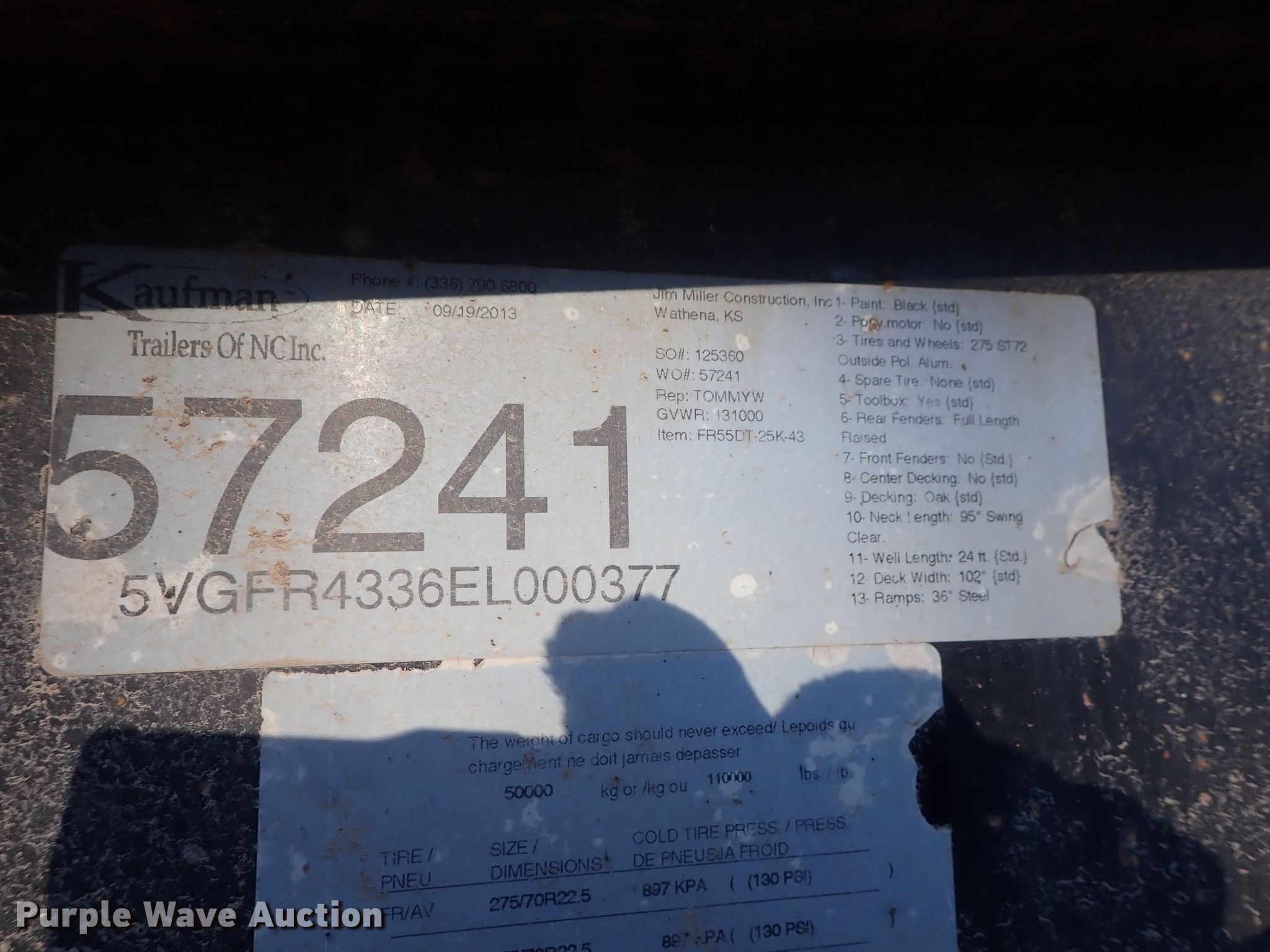 Purple Wave is selling a used Equip. Trailer in Kansas. This item is a 2014 Kaufman FR55DT low boy equipment trailer with the following: 49'L x 102"W overall, 24'L x 102"W steel and wood main deck, 14'L rear deck, Swing-out outriggers, Detachable neck, Self-contained hydraulics, Manual hydraulic controls, Air suspension, Air brakes, Triple axle, Air raise/lower third axle, Aluminum wheels, 255/70R22.5 tires, Crossfire tire equalizers, GVWR 131,000 lbs