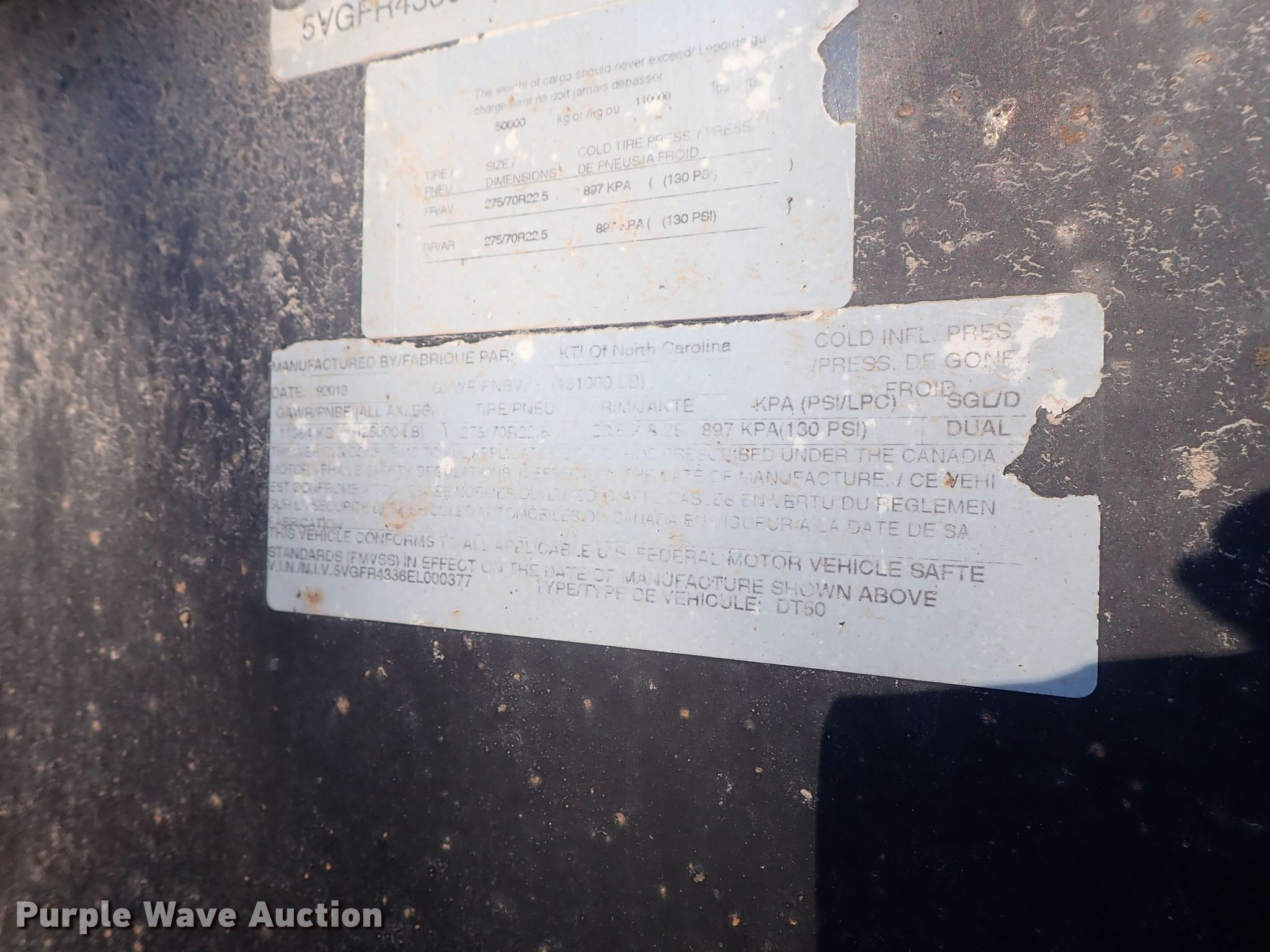 2014 Kaufman FR55DT low boy equipment trailer. 49'L x 102"W overall, 24'L x 102"W steel and wood main deck, 14'L rear deck, Swing-out outriggers, Detachable neck Self-contained hydraulics, Manual hydraulic controls, Air suspension, Air brakes, Triple axle Air raise/lower third axle, Aluminum wheels, 255/70R22.5 tires, Crossfire tire equalizers, GVWR 131,000 lbs. Kansas title. Title distribution may be delayed up to 30 days from verification of funds. 5VGFR4336EL000377. Rapid Services. Viola, KS 67149