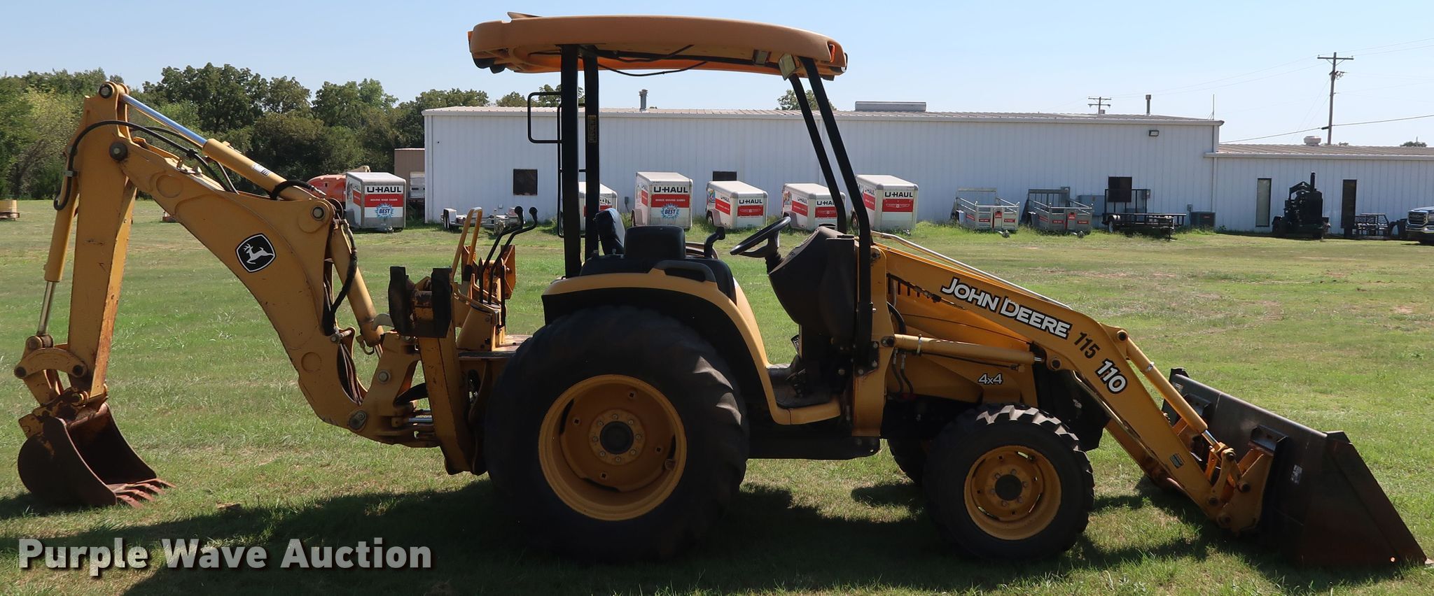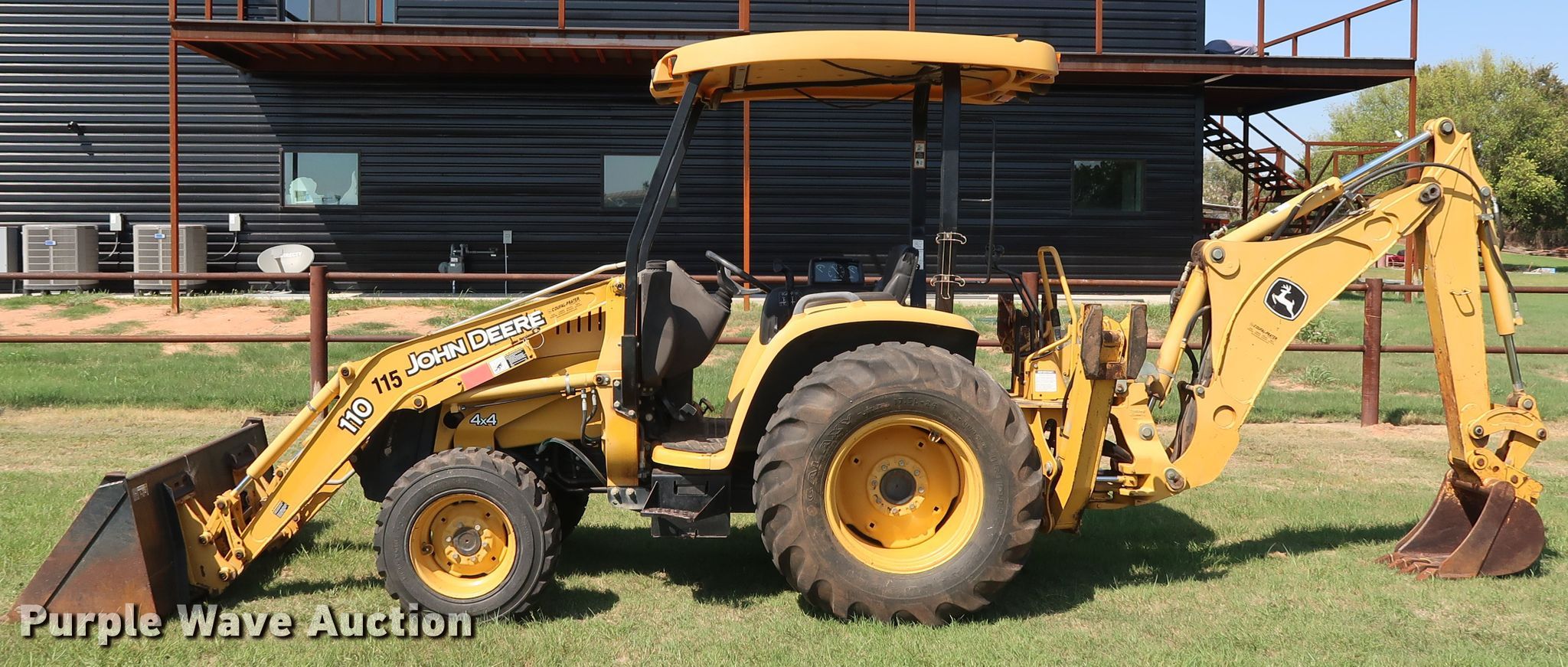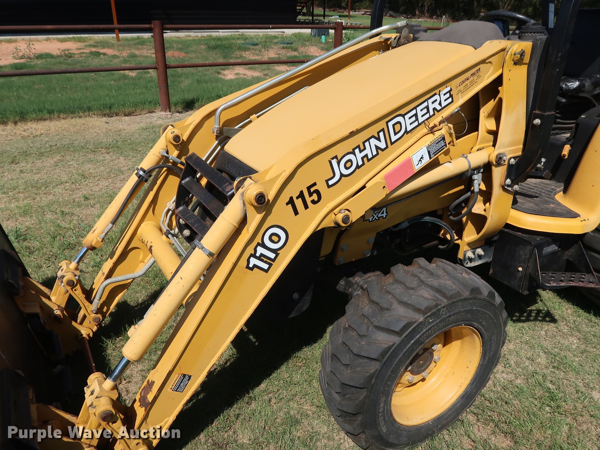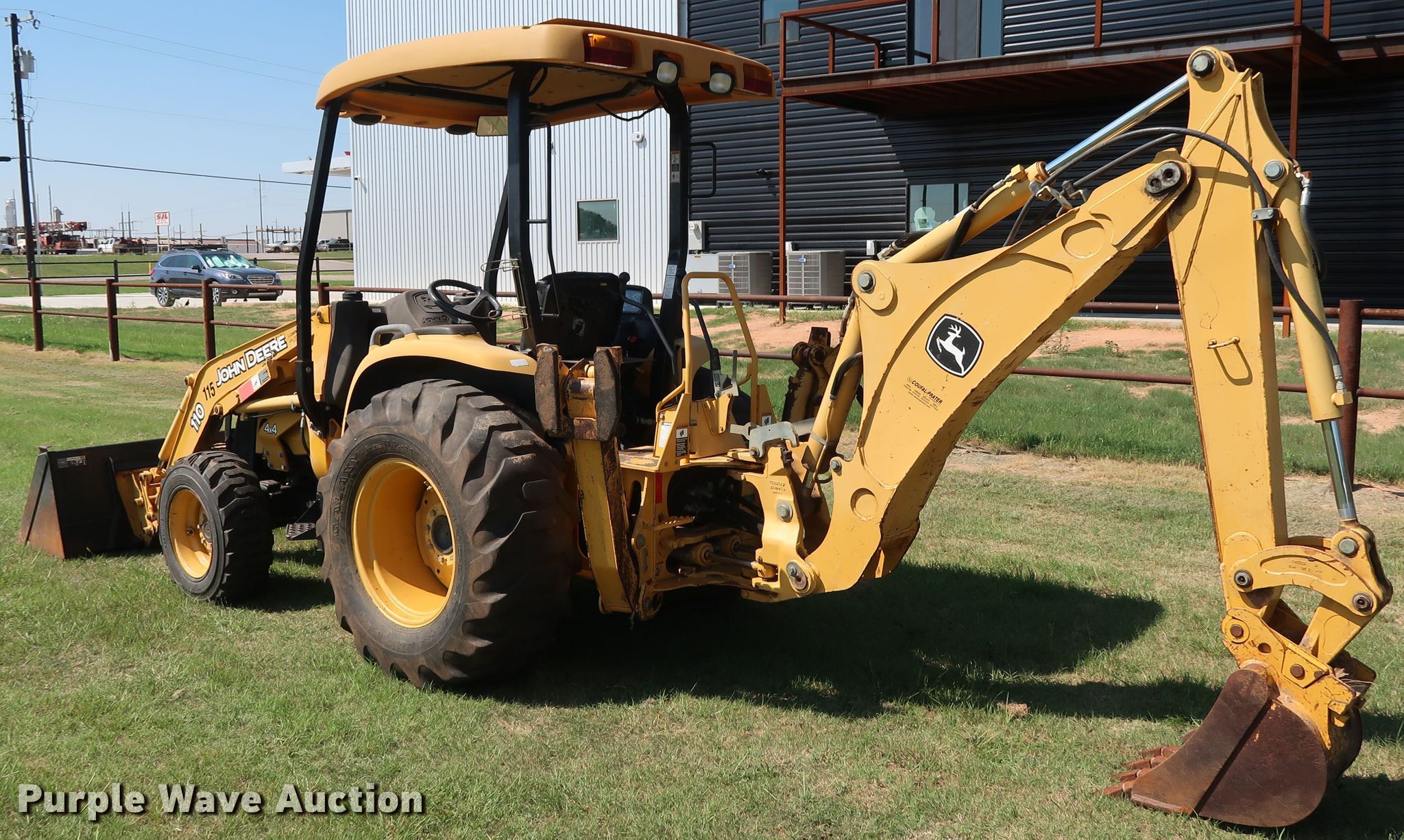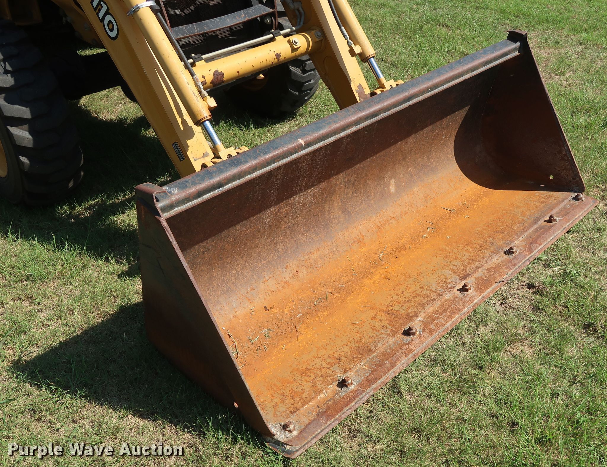 Purple Wave is selling a used Tractor Loader Backhoe in Oklahoma. This item is a 2008 John Deere 110 backhoe with the following: 2,094 hours on meter, Yanmar 4TNV88 2.2L four cylinder diesel engine, 41 HP, Three speed hydrostatic transmission, OROPS, Wobble stick backhoe controls, John Deere Worksite Pro L72 72"W loader bucket, Bolt-on cutting edge, Manual quick coupler, 18"W backhoe bucket, (4) teeth, 10-16.5 NHS front tires, 17.5L-24 rear tires, Top side transmission housing cracked near the cab floorboard, Serial LV0110T711197, T00110S111810