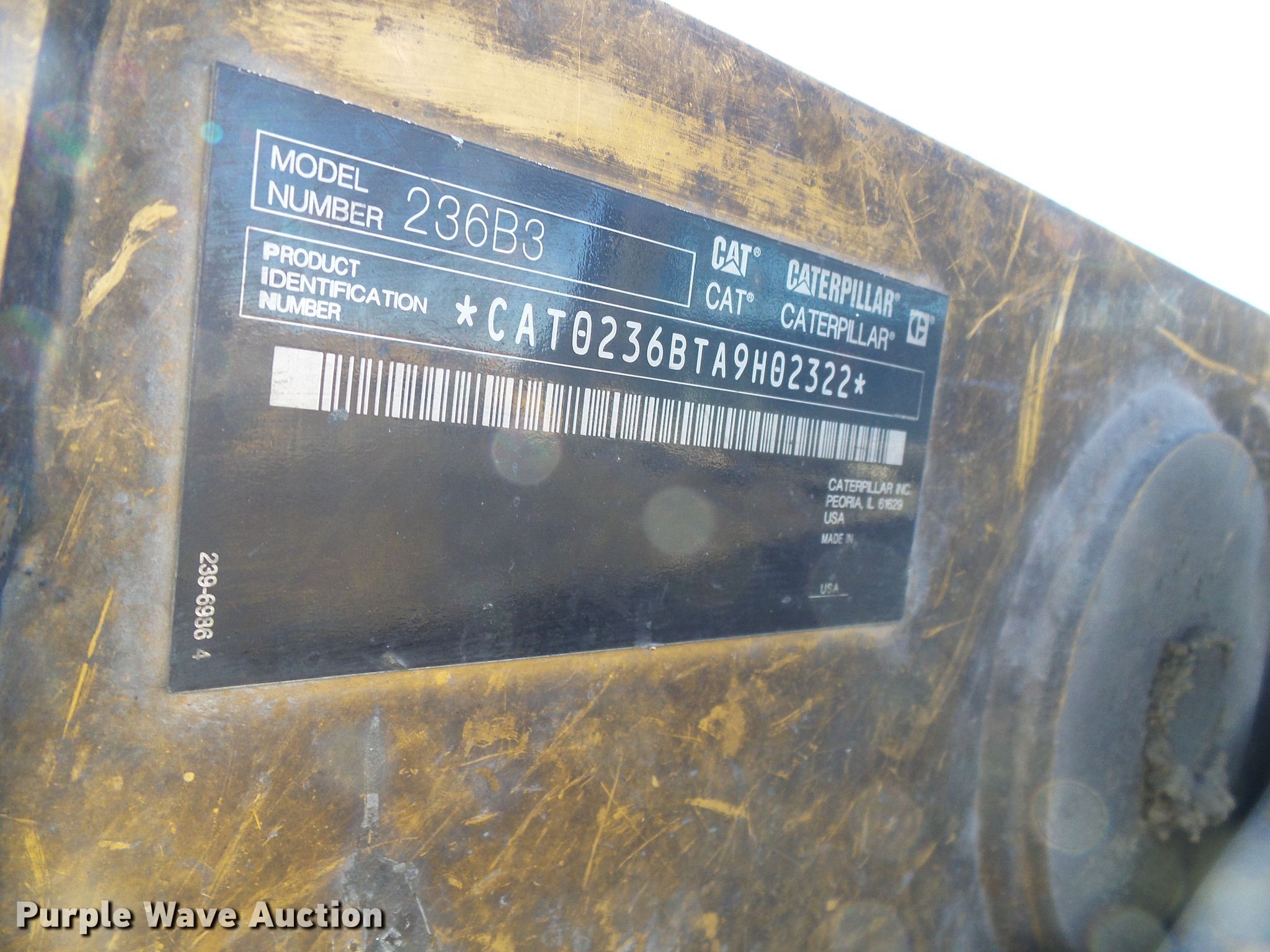 Purple Wave is selling a used Skid Steer Loader in Missouri. This item is a 2012 Caterpillar 236B3 skid steer with the following: 8,858 hours on meter, Caterpillar four cylinder diesel engine, Hydrostatic transmission, Open station/canopy, Hand bucket controls, Auxiliary hydraulics, 33 x 12-20 solid tires, Left lift arm cracked, Serial CAT0236BTA9H02322