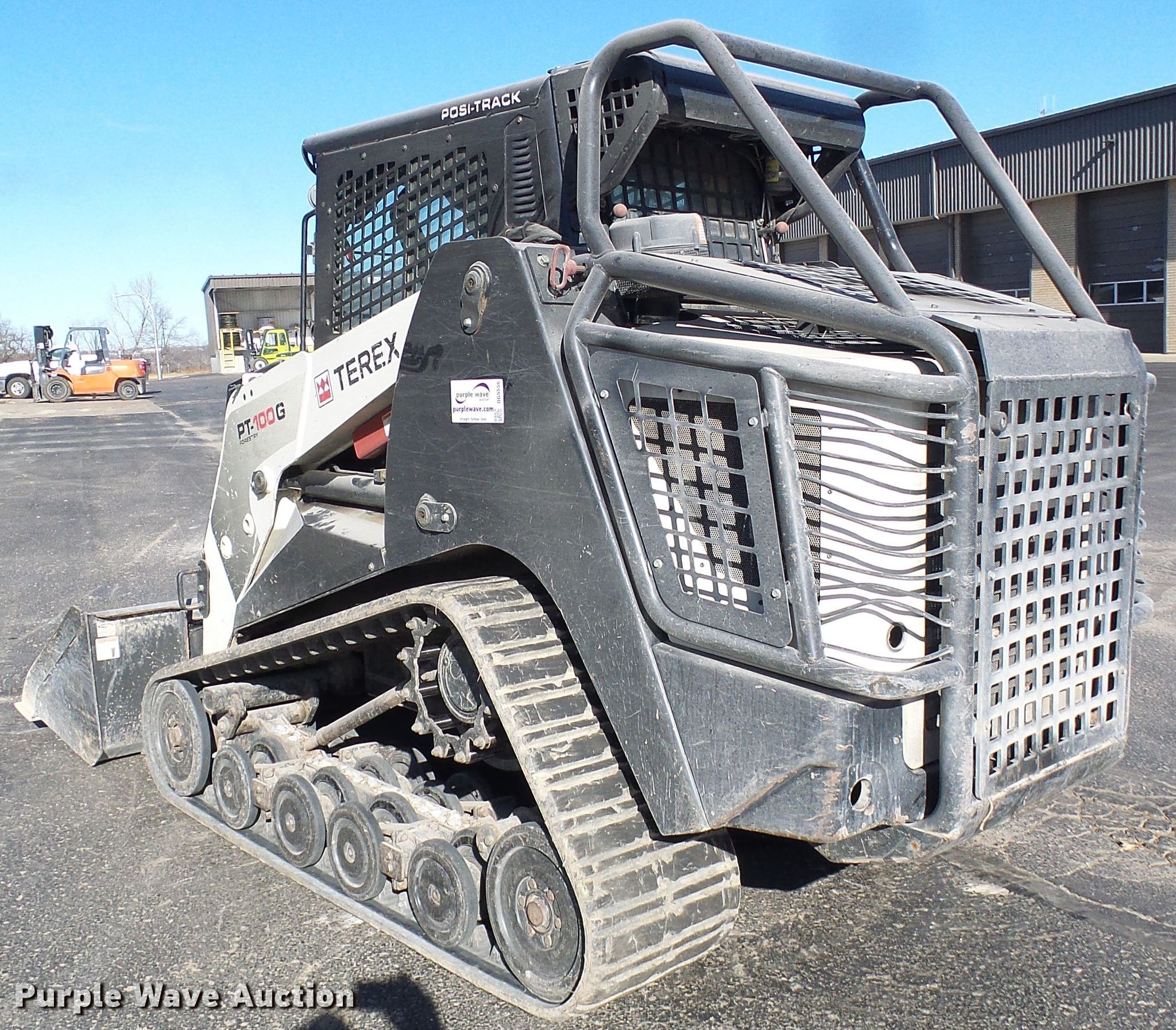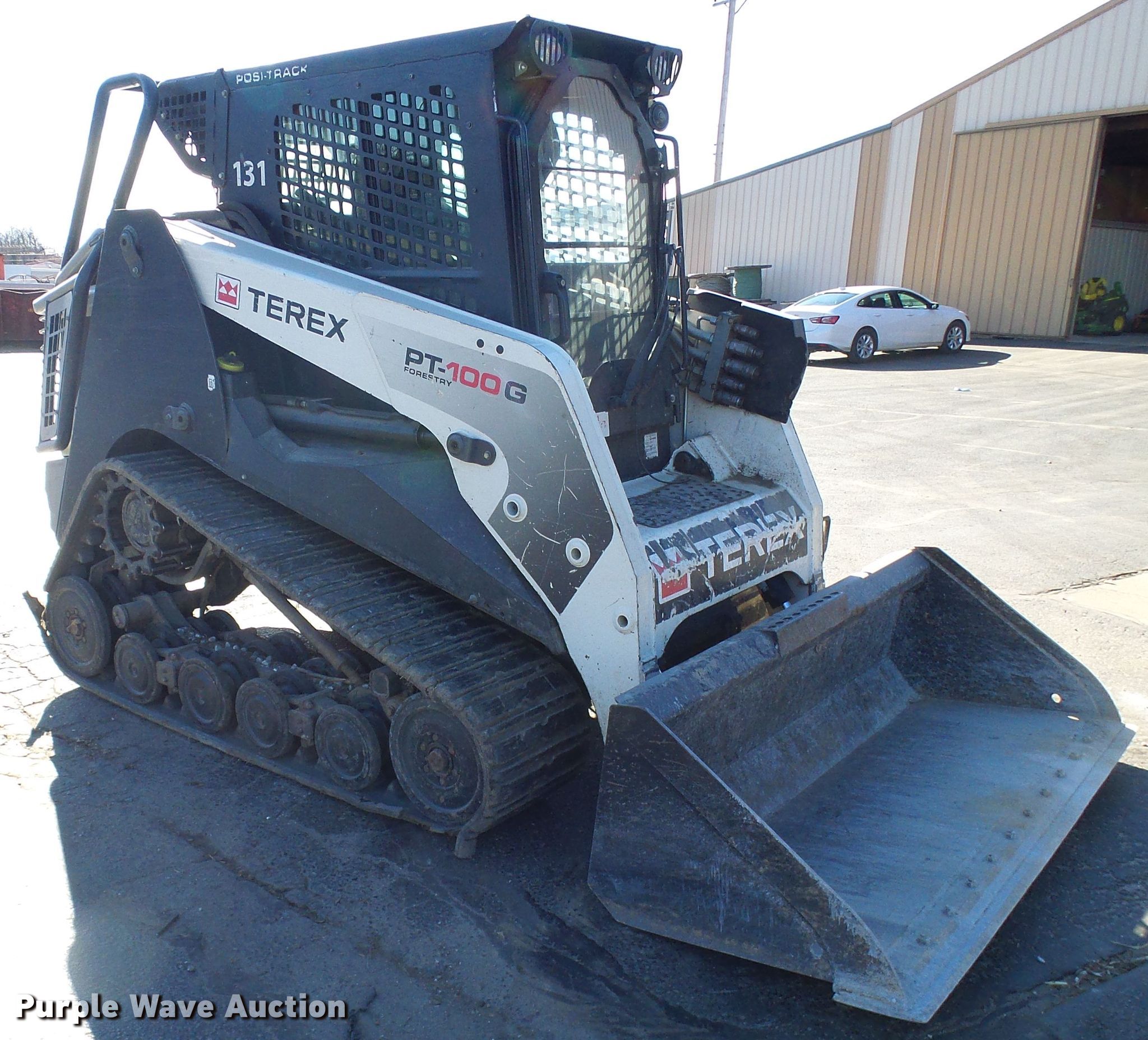 Purple Wave is selling a used Skid Steer Loader in Missouri. This item is a 2012 Terex PT-100G skid steer with the following: 2,052 hours on meter, Perkins four cylinder diesel engine, Two speed hydrostatic transmission, Enclosed cab, AC and heat, Hand bucket controls, Pattern changer,, 74"W bucket, Bolt-on cutting edge, Auxiliary hydraulics, Auxiliary electrical outlet, 18"W tracks, Unused parts included, CB radio and fire extinguisher not included, Serial 120585