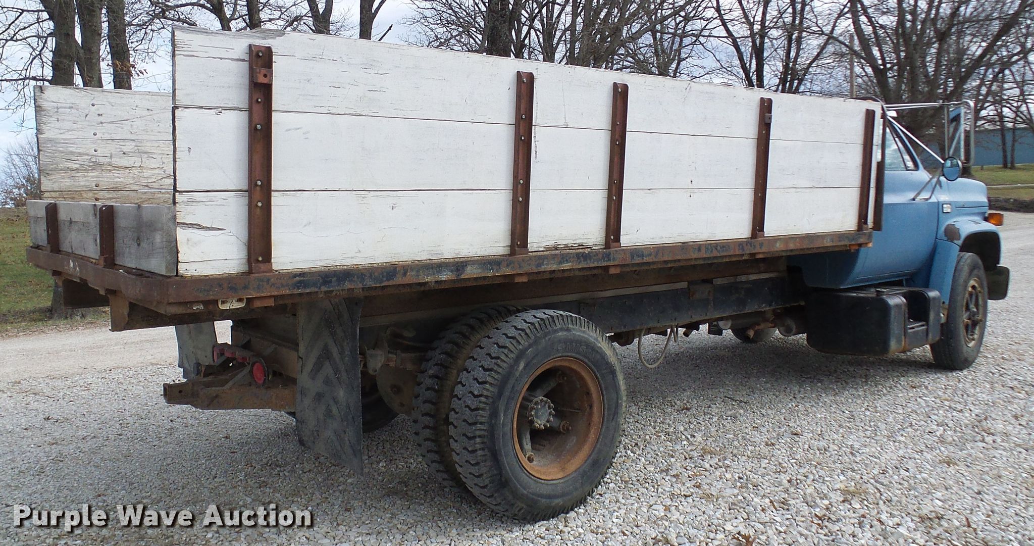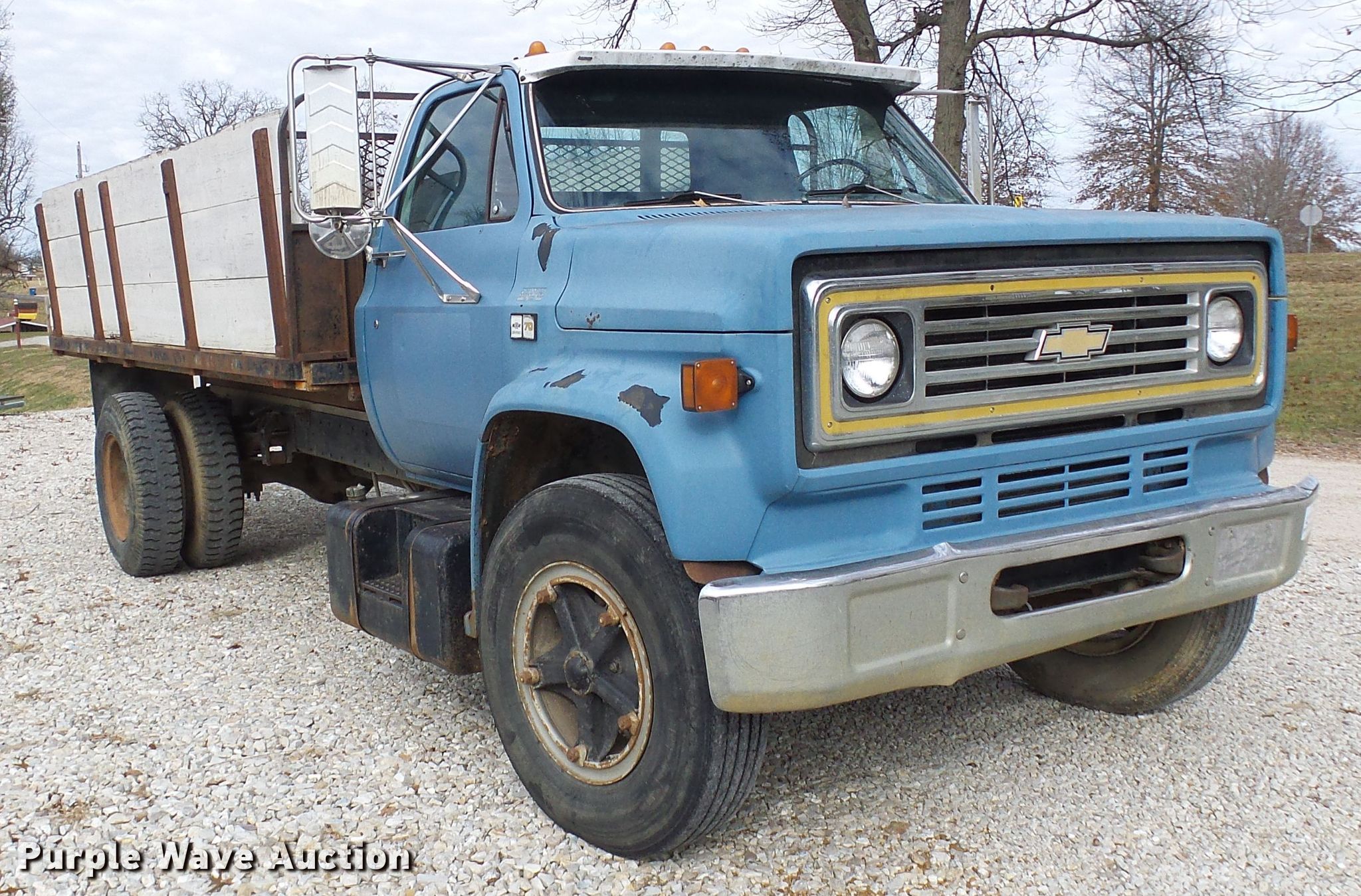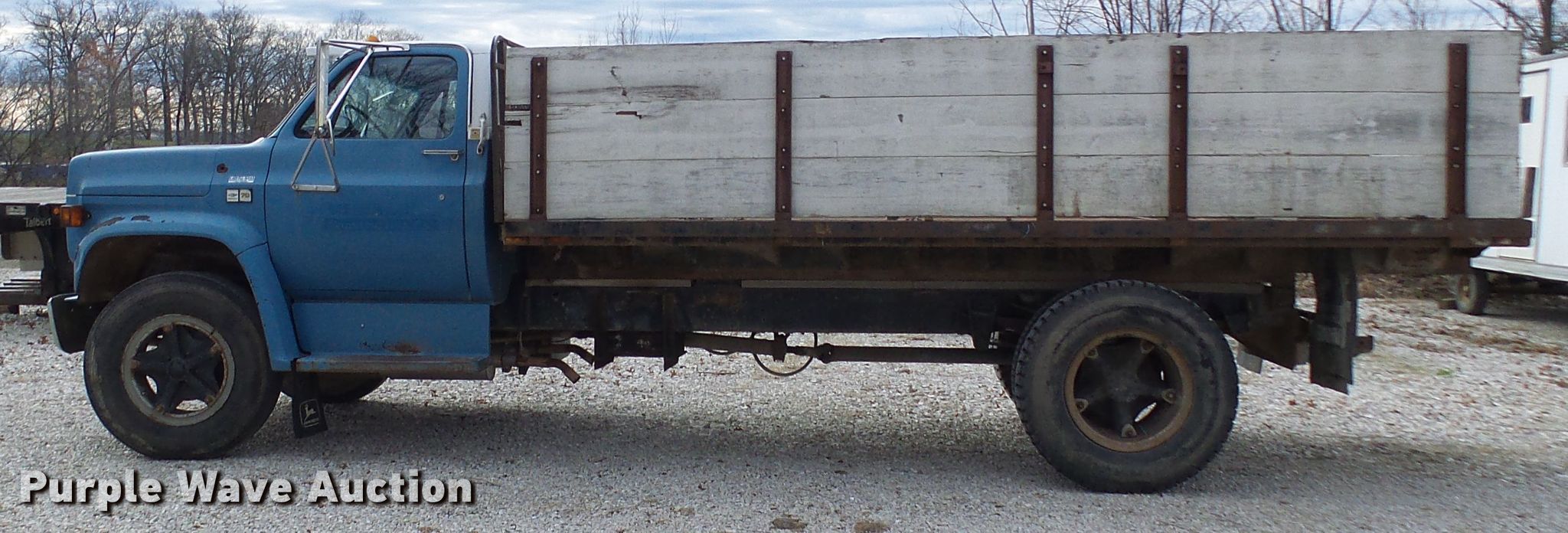 Purple Wave is selling a used Flat Bed Truck in Missouri. This item is a 1987 Chevrolet C70 flat dump bed truck with the following: 79,263 miles on odometer, 6.0L V8 gas engine, Five speed manual transmission, Single axle, Heat, 16'L x 92"W flatbed, 34" removable sides, Single cylinder hoist, Spring suspension, Hydraulic brakes, 9.00R20 tires, GVWR 23,160 lbs, Engine issues