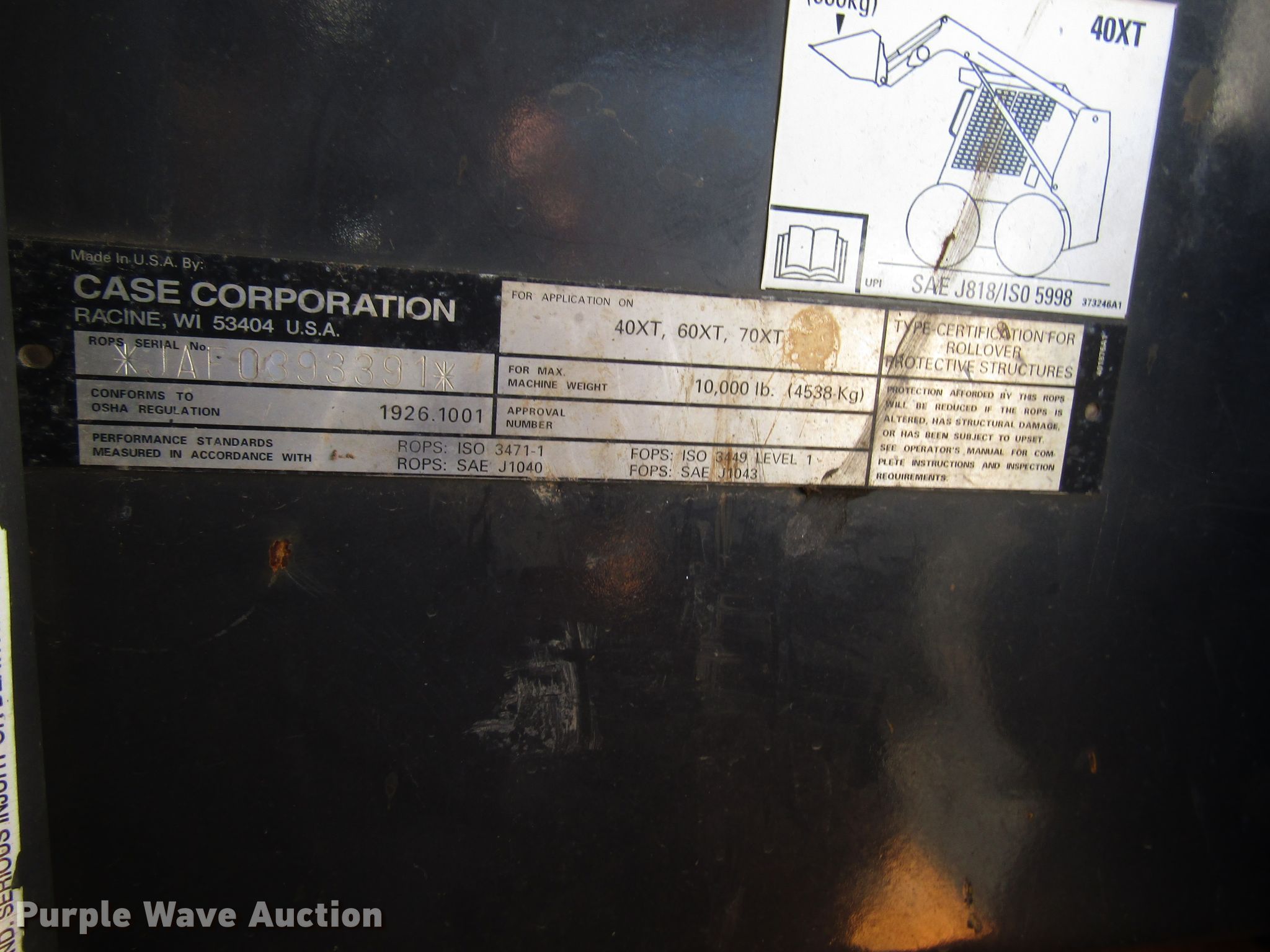 Purple Wave is selling a used Skid Steer Loader in Missouri. This item is a 2003 Case 40XT skid steer with the following: 2,462 hours on meter, Four cylinder diesel engine, Hydrostatic transmission, Open station/canopy, Hand bucket controls, 60"W bucket, Weld-on cutting edge, Manual quick coupler, Auxiliary hydraulics, 31 x 10-20 solid tires, Serial 1AF0387540, Unit# E15