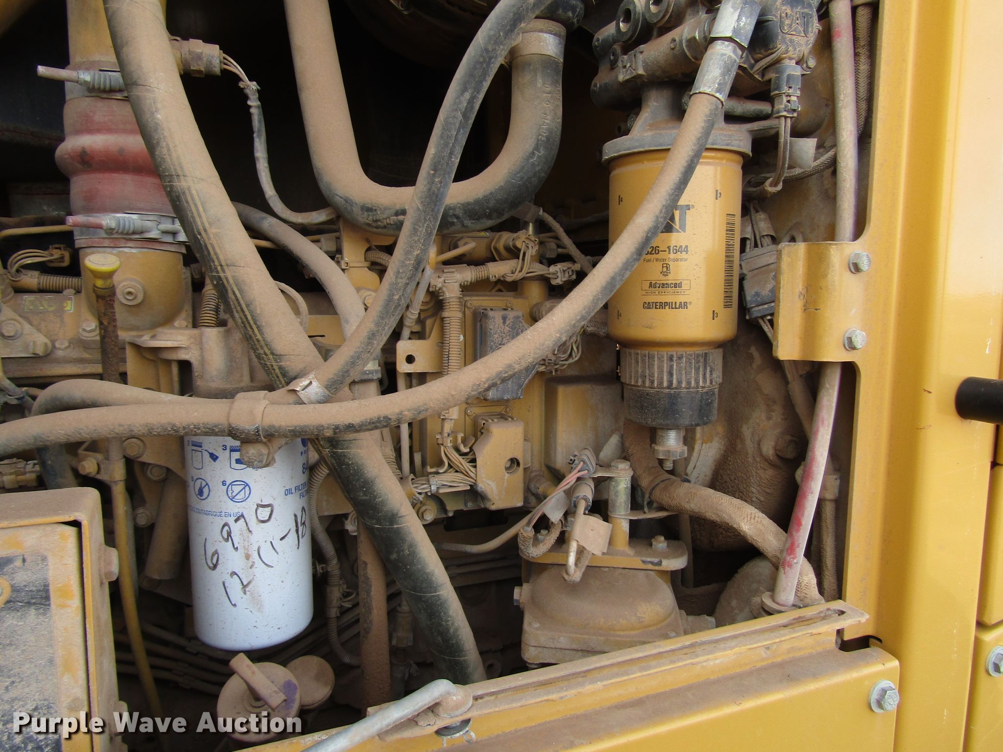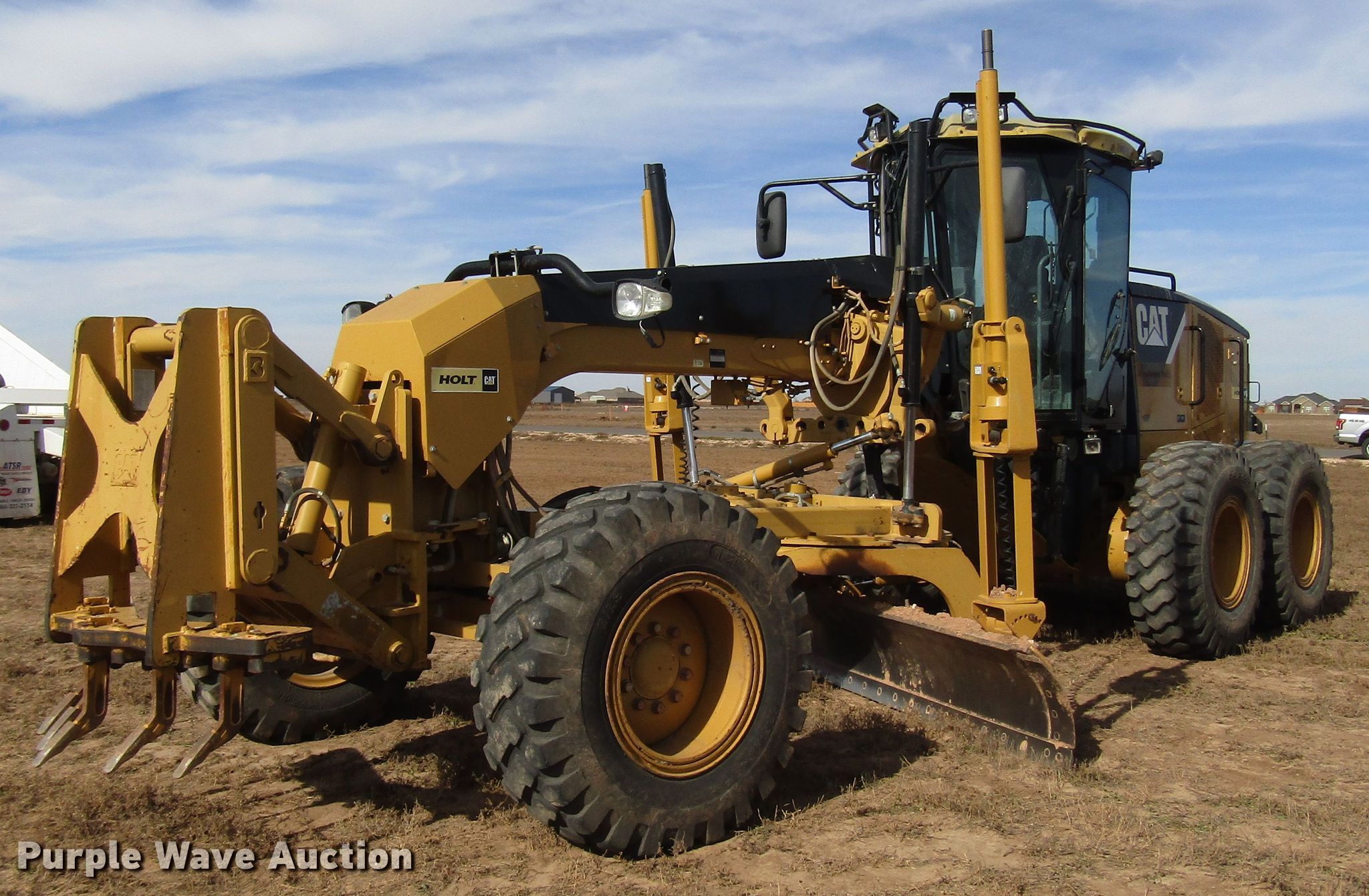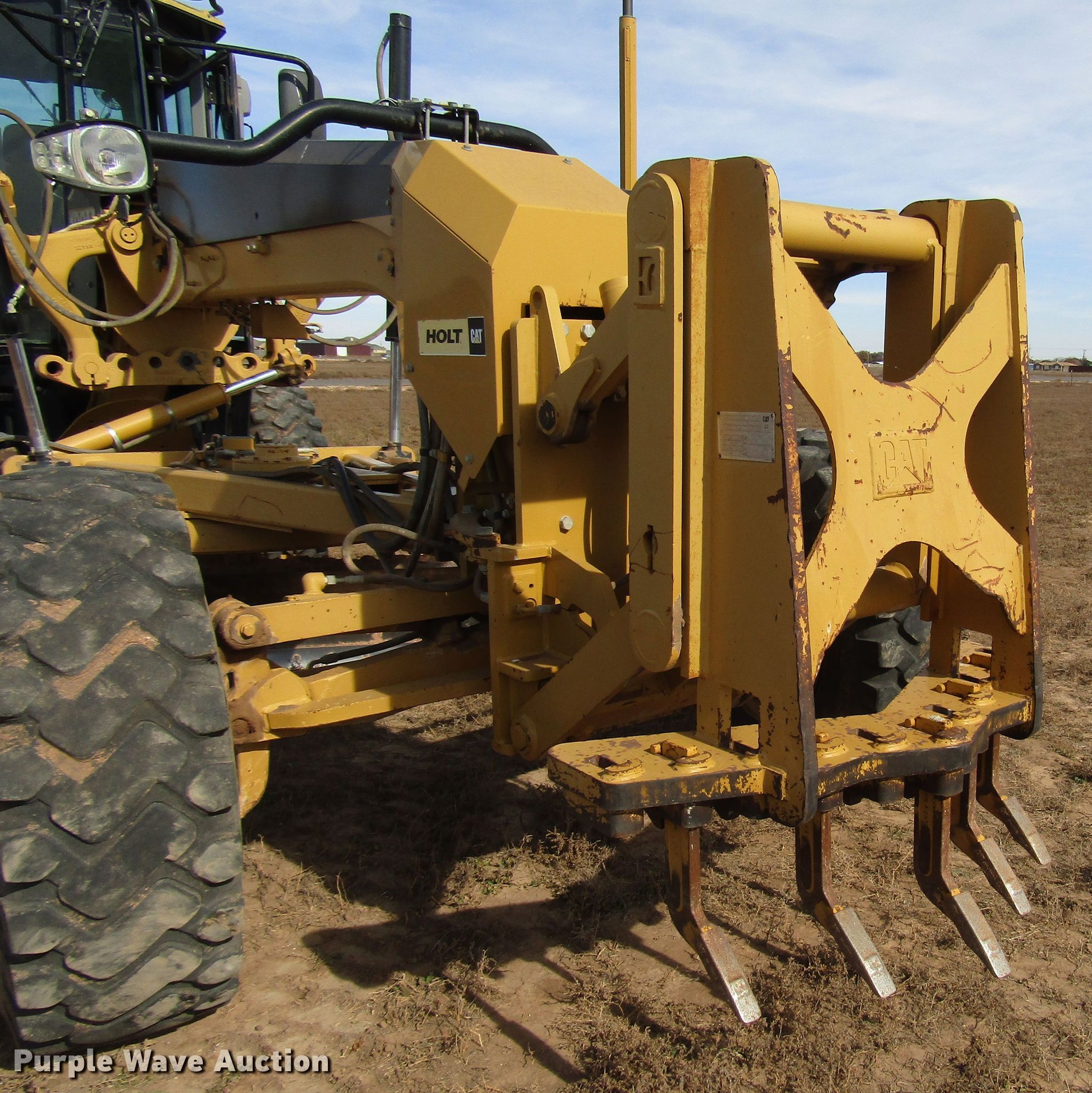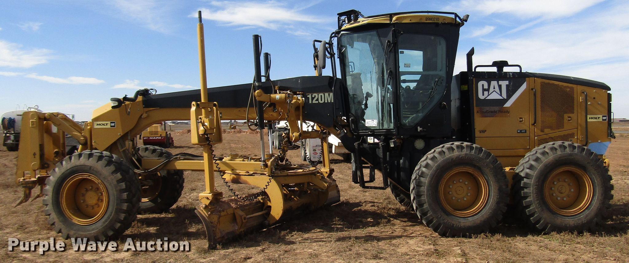 Purple Wave is selling a used Motor Grader in Texas. This item is a 2008 Caterpillar 120M motor grader with the following: 7,243 hours on meter, Hours may vary, unit still in use, Caterpillar C6 6.6L L6 diesel engine, Power shift transmission, 8F-4R gears, Differential lock, EROPS, AC and heat, (10) hydraulic control valves, Trimble laser grade controls, 14'L moldboard, Tip control, Side shift, Caterpillar front mounted lift group, Caterpillar front mounted scarifier, (5) teeth, 17.5-25 tires, Glass cracked, Serial CAT0120MAB9N00210