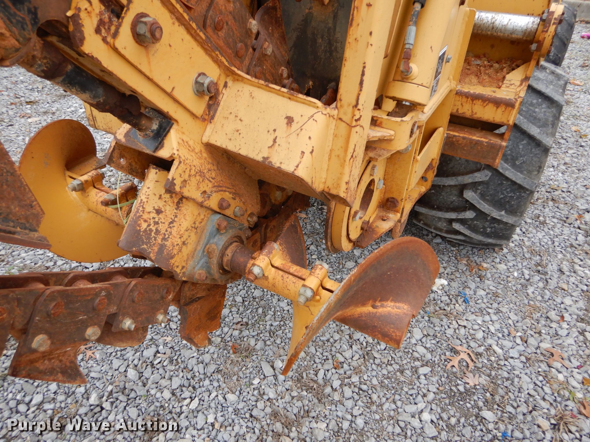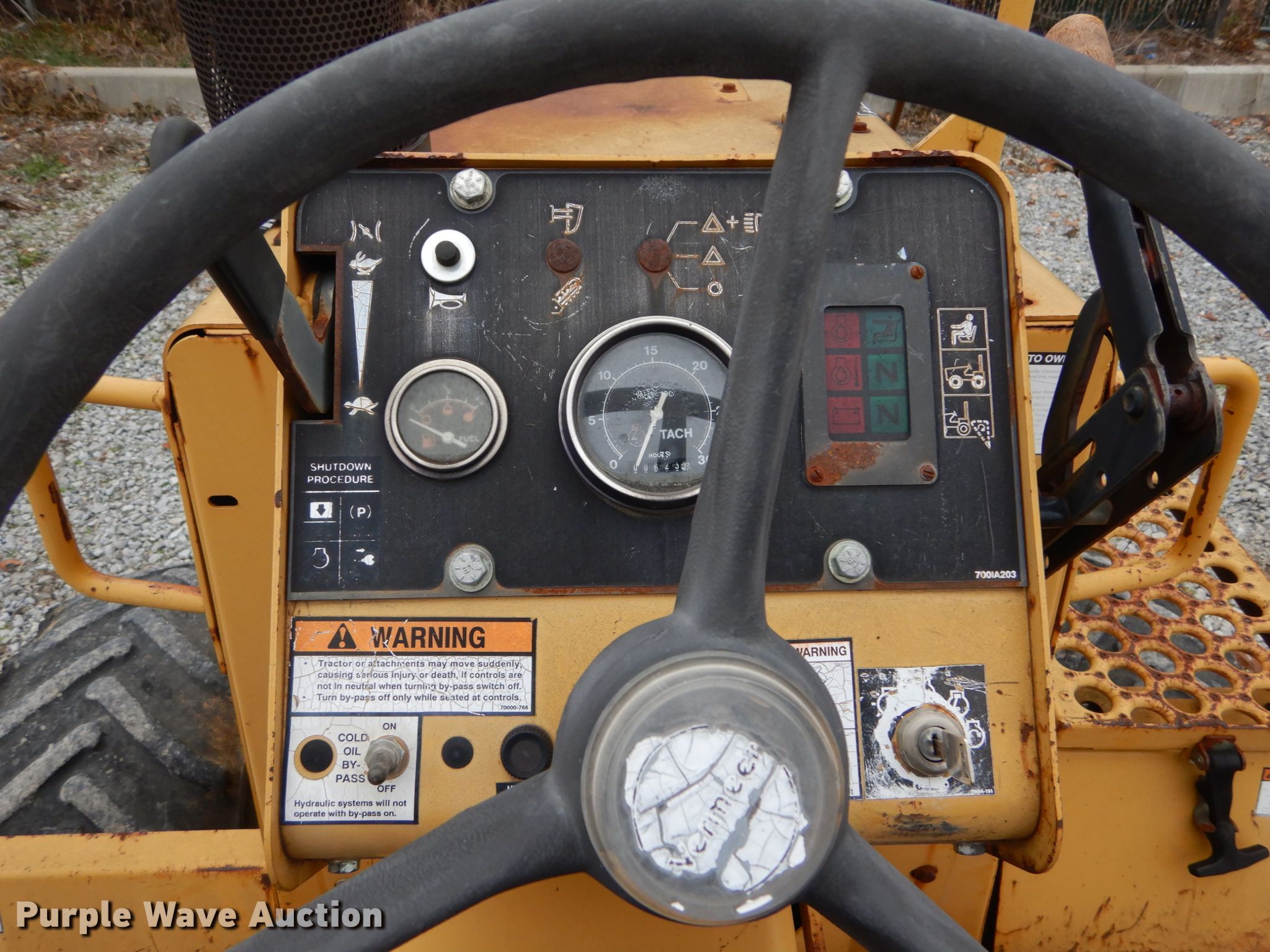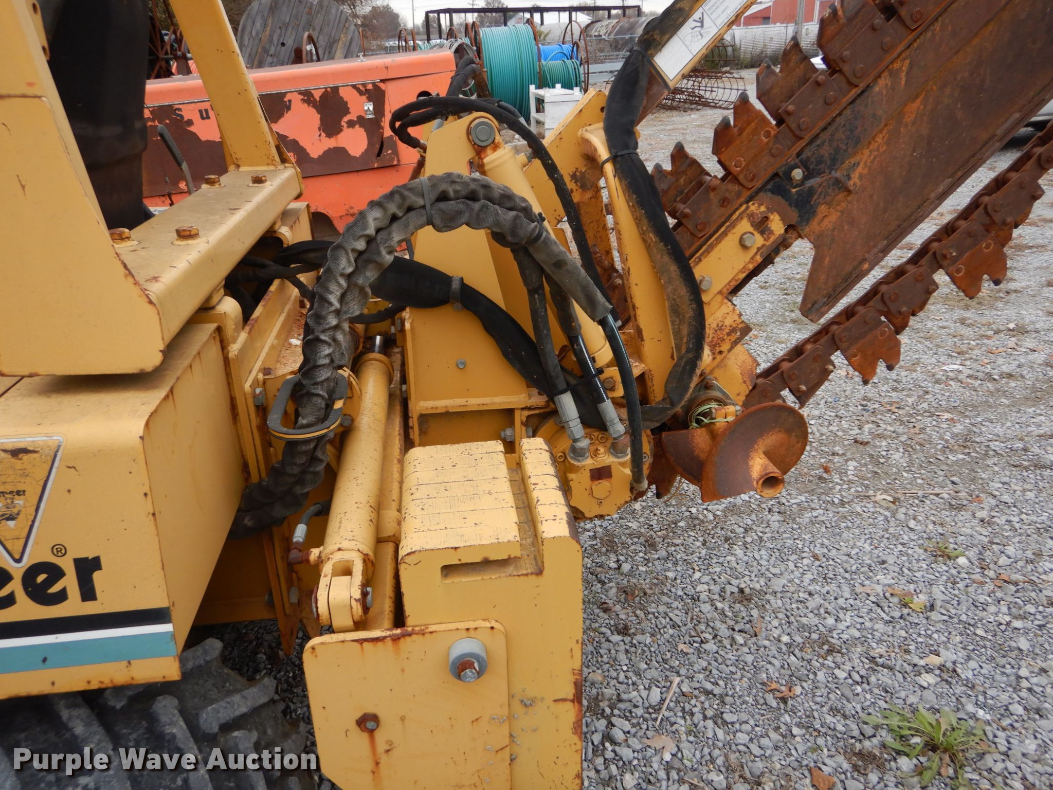 Purple Wave is selling a used Trencher or Rock Saw in Indiana. This item is a Vermeer V5750 trencher with the following: 623 hours on meter, Deutz four cylinder diesel engine, Hydrostatic transmission, Four wheel drive, OROPS, Four-way backfill blade, Trencher model S05750, 60" boom length, 4" cutting width, Side shift, Hydraulic crumber, 36"L x 12"W conveyor, Backhoe model B600, 18"W bucket, Serial 1LVRP080B631001019, 31 x 15.5-15 tires, Broken latch on backhoe, Possible broken pin housing, Serial 1VRM082Z331001184, Unit# T-437