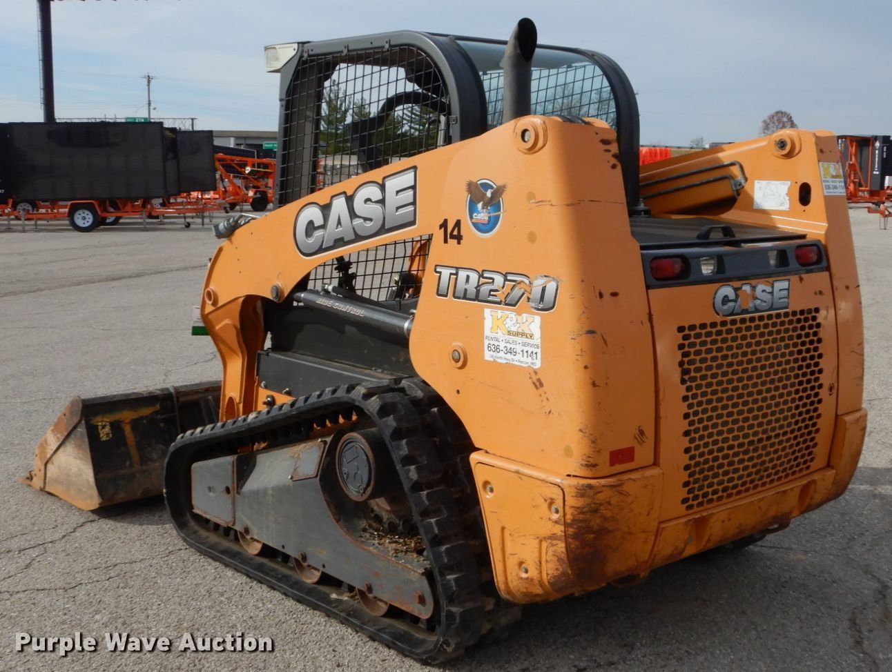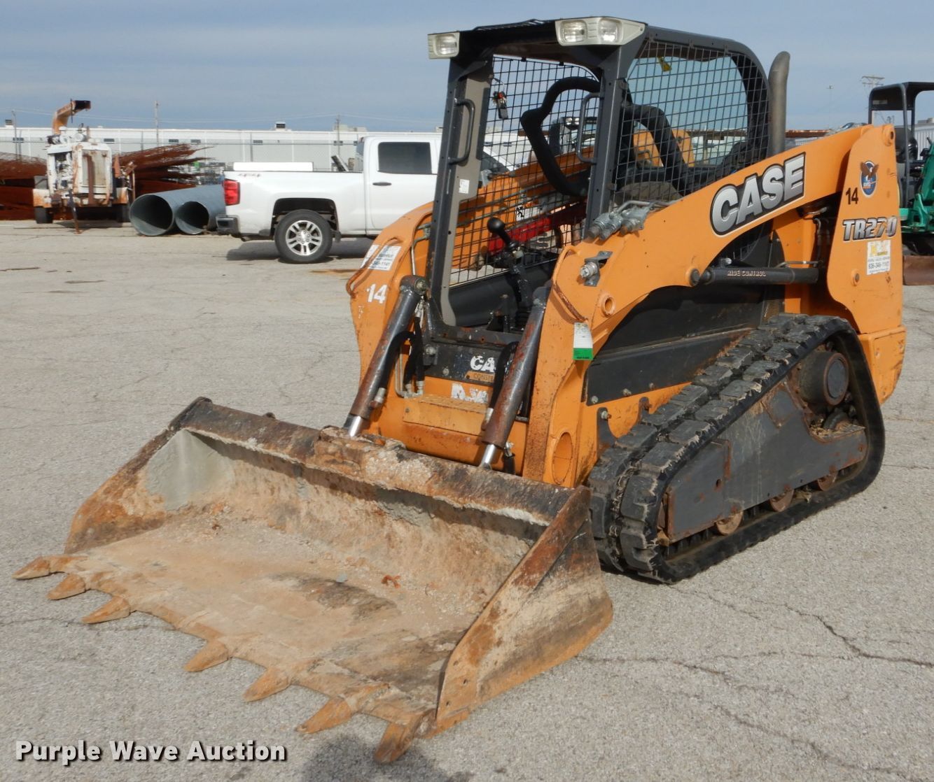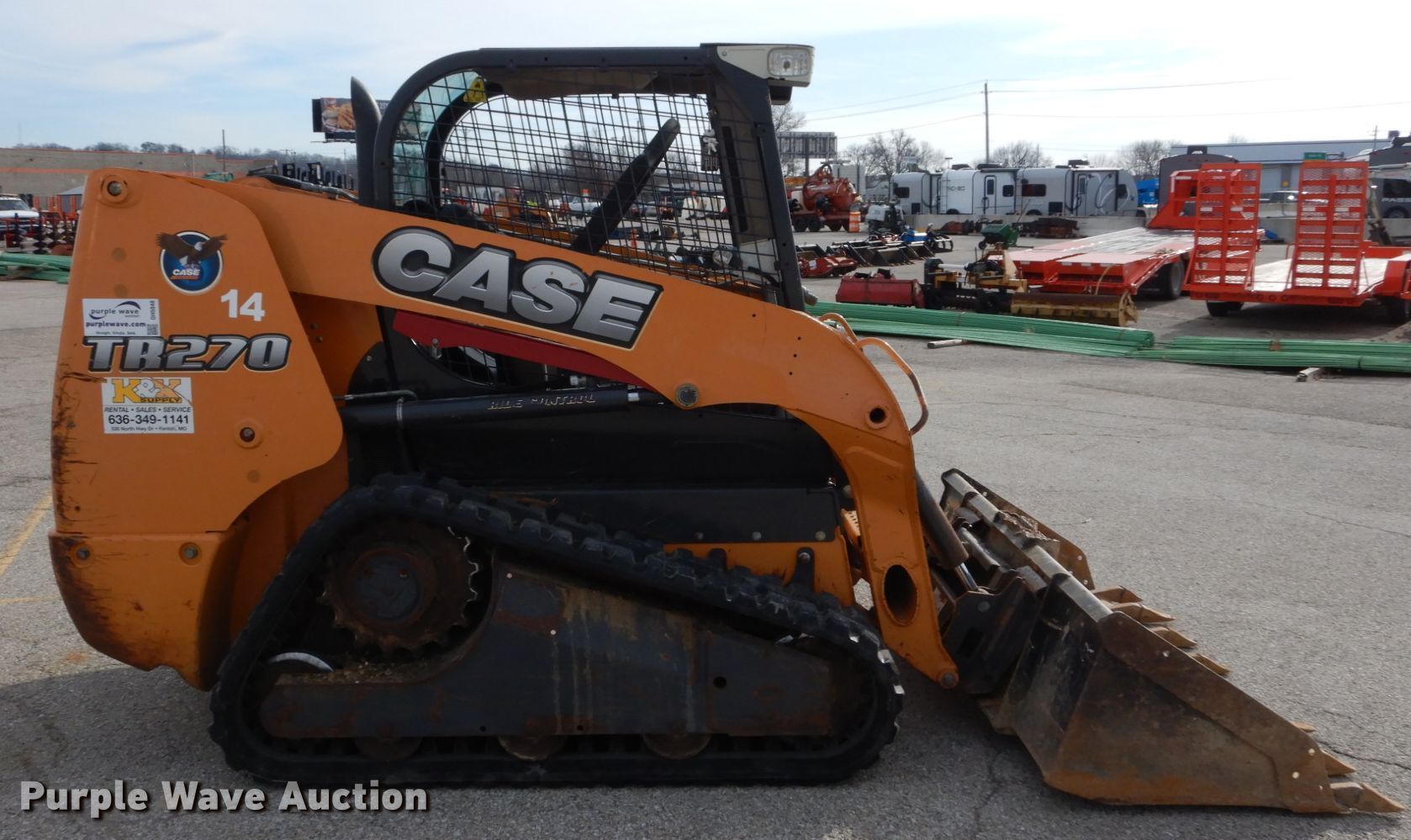 Purple Wave is selling a used Tracked Skid Steer Loader in Missouri. This item is a 2014 Case TR270 skid steer with the following: 918 hours on meter, Four cylinder diesel engine, Hydrostatic transmission, Open station/canopy, Hand bucket controls, 78"W bucket, Weld-on cutting edge, Hydraulic quick coupler, Auxiliary hydraulics, Auxiliary electrical outlet, 12"W tracks, Quick coupler latch issue, Bucket tooth missing, Serial NEM482448, Unit# 14