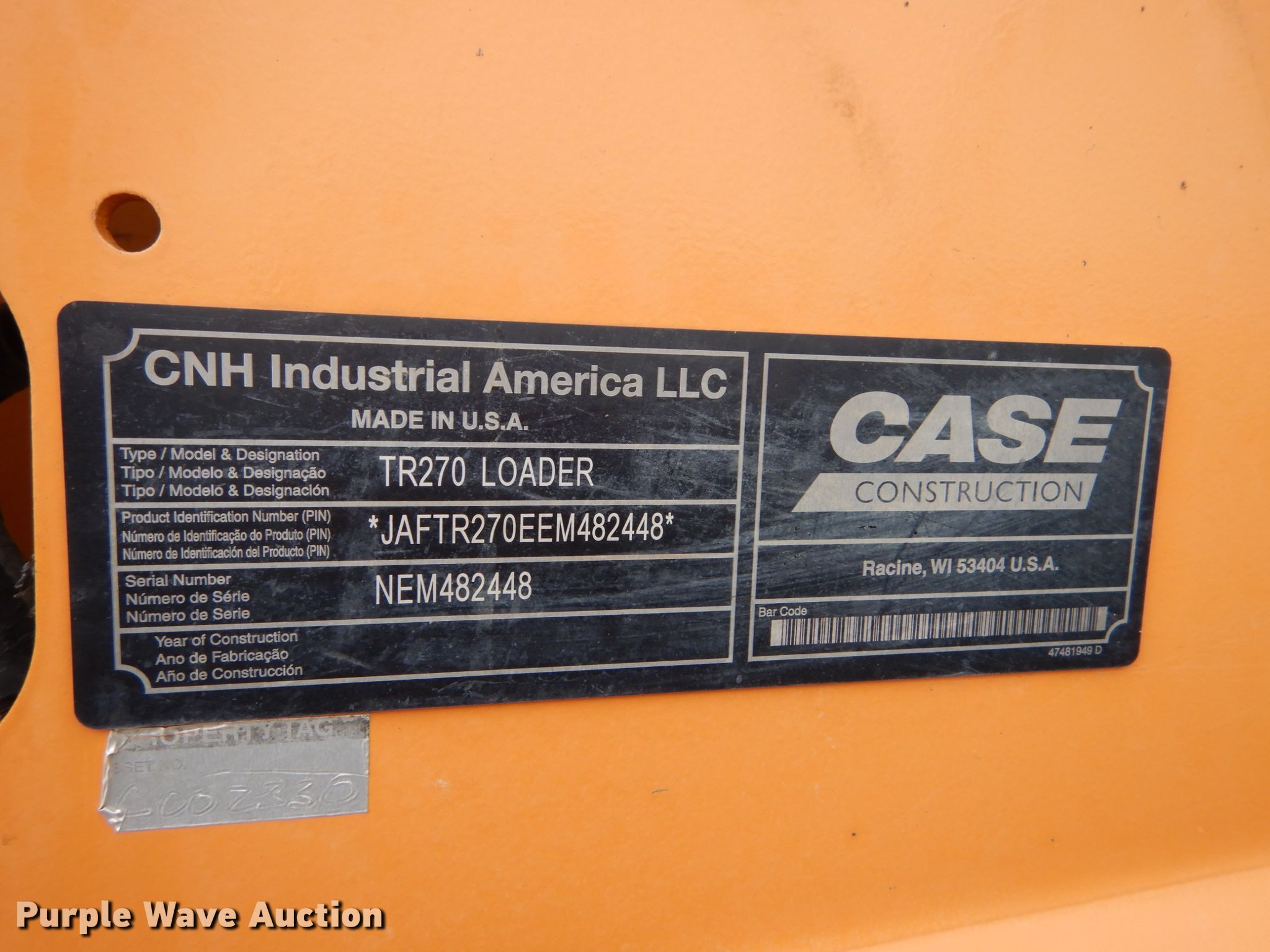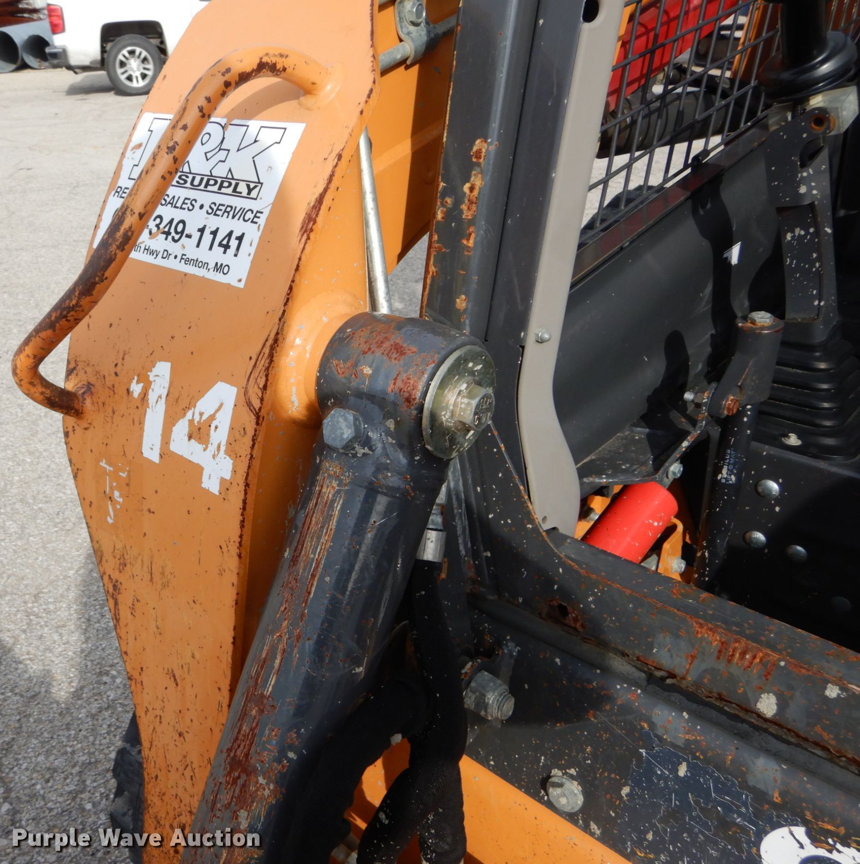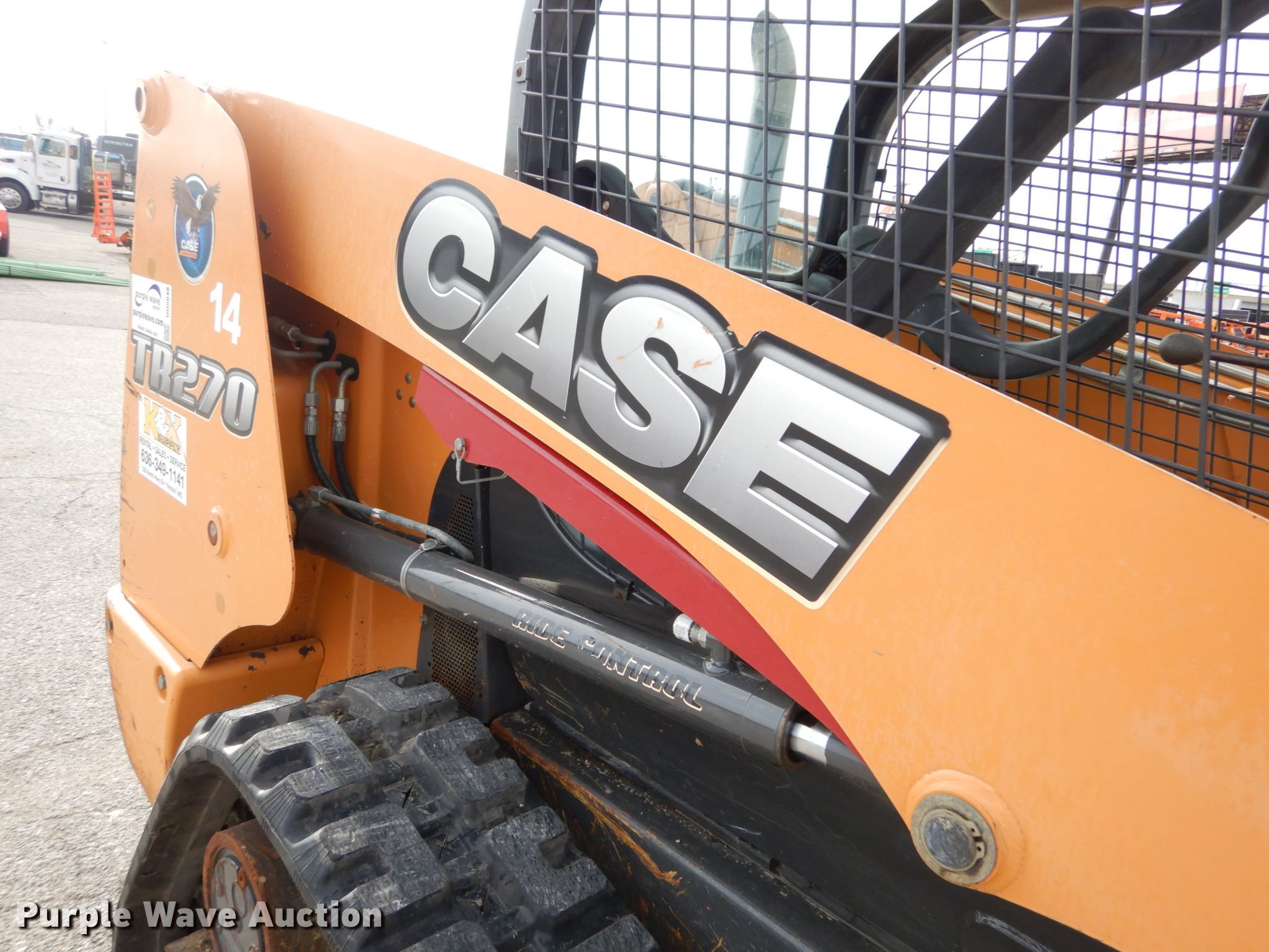 Purple Wave is selling a used Tracked Skid Steer Loader in Missouri. This item is a 2014 Case TR270 skid steer with the following: 918 hours on meter, Four cylinder diesel engine, Hydrostatic transmission, Open station/canopy, Hand bucket controls, 78"W bucket, Weld-on cutting edge, Hydraulic quick coupler, Auxiliary hydraulics, Auxiliary electrical outlet, 12"W tracks, Quick coupler latch issue, Bucket tooth missing, Serial NEM482448, Unit# 14