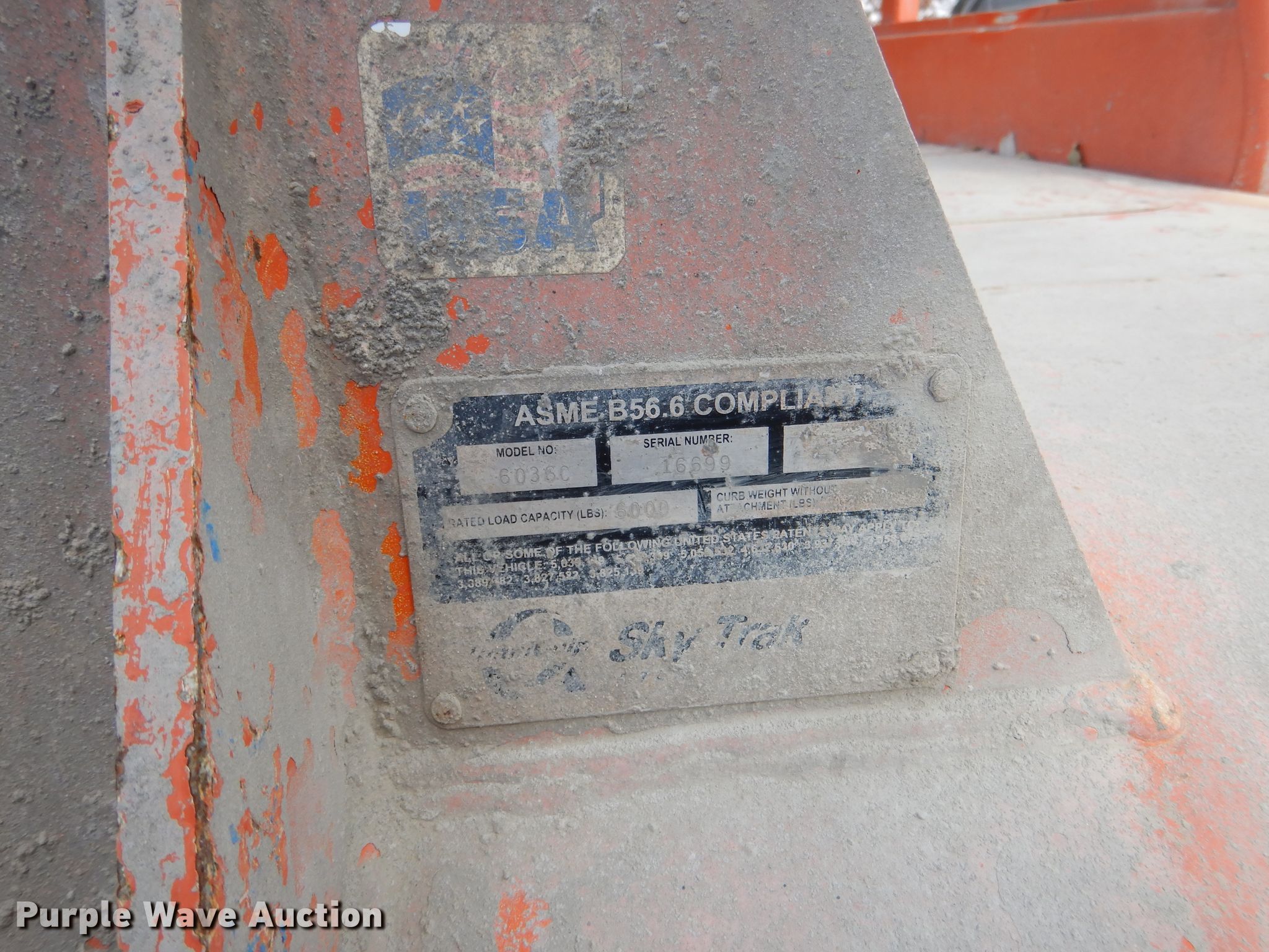 Purple Wave is selling a used Telehandler in Missouri. This item is a 2002 Sky Trak 6036 telehandler with the following: 5,820 hours on meter, Cummins B3.9C 3.9L four cylinder diesel engine, Serial 46205371, Powershift transmission, 4F-4R gears, Four wheel drive, Crab steer, Four wheel steer, OROPS, 6,000 lbs maximum lift capacity, 36' maximum lift height, Three stage boom, 48"L forks, Tilt carriage, Hydraulic leveling, Hydraulic quick attach, 13.00-24 foam filled tires, Serial 16699