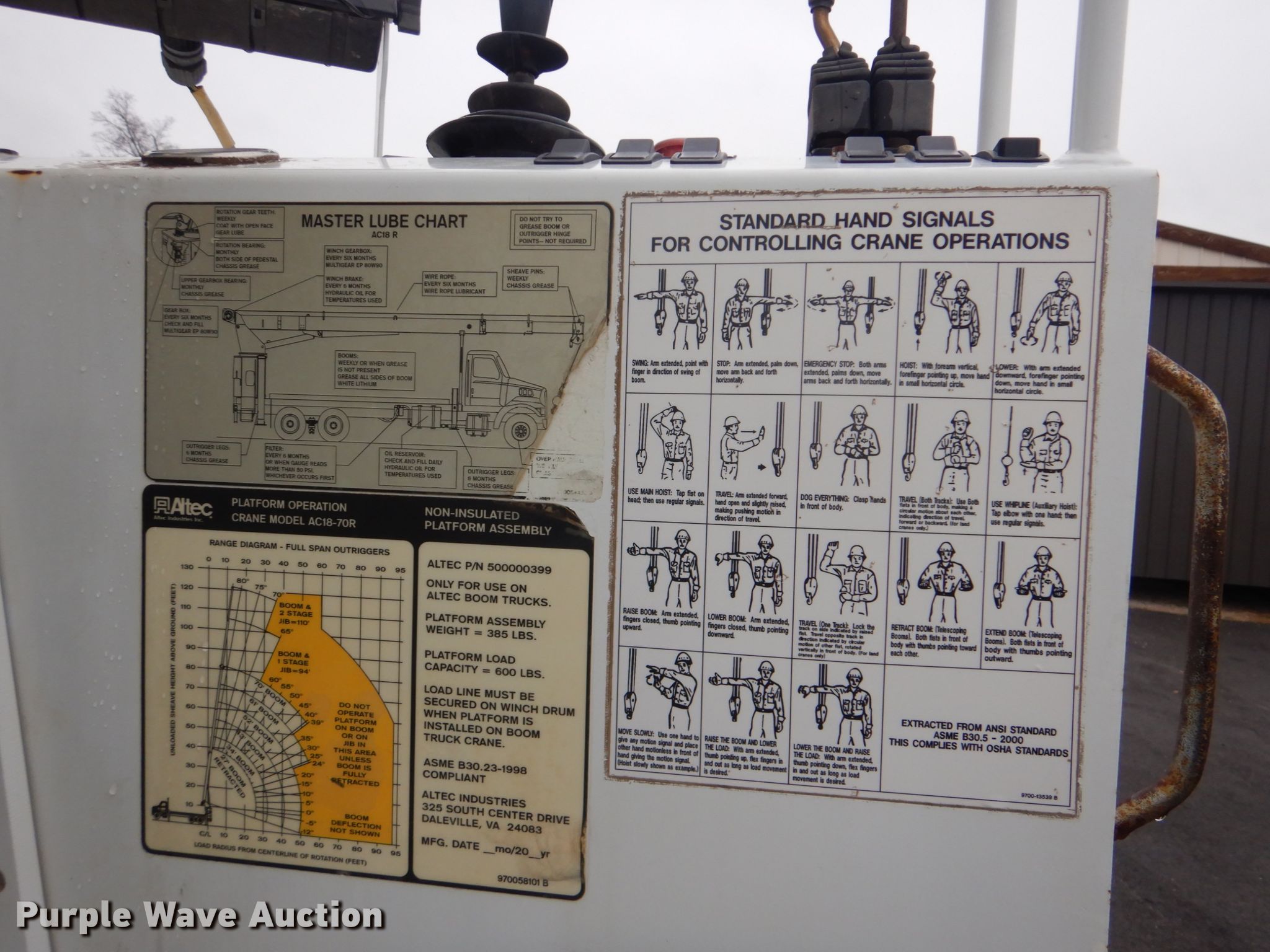 2009 Peterbilt 340 crane truck. 35,346 miles on odometer, 4,298 hours on meter, Paccar PX8 8.3L L6 diesel engine, Eaton Fuller 10 speed manual transmission, Tandem axle, AC and heat, PTO, Knapheide PVMALST-196A flatbed Serial 20080318-0110432, Altec AC18-70R telescopic boom 70' boom length, Three boom sections, 36,000 lbs maximum lift capacity, 70' maximum lift height, Man basket Ground controls, Crane ball and hook, Manuals, Lift chart, Spring suspension, Air brakes, 425/65R22.5 front tires, 11R22.5 rear tires, GVWR 54,780 lbs, FAWR 20,000 lbs, RAWR 20,000 lbs. Oklahoma title. Title distribution may be delayed up to 30 days from verification of funds. 2NPRLN9X29M776456. Collinsville, OK 74021