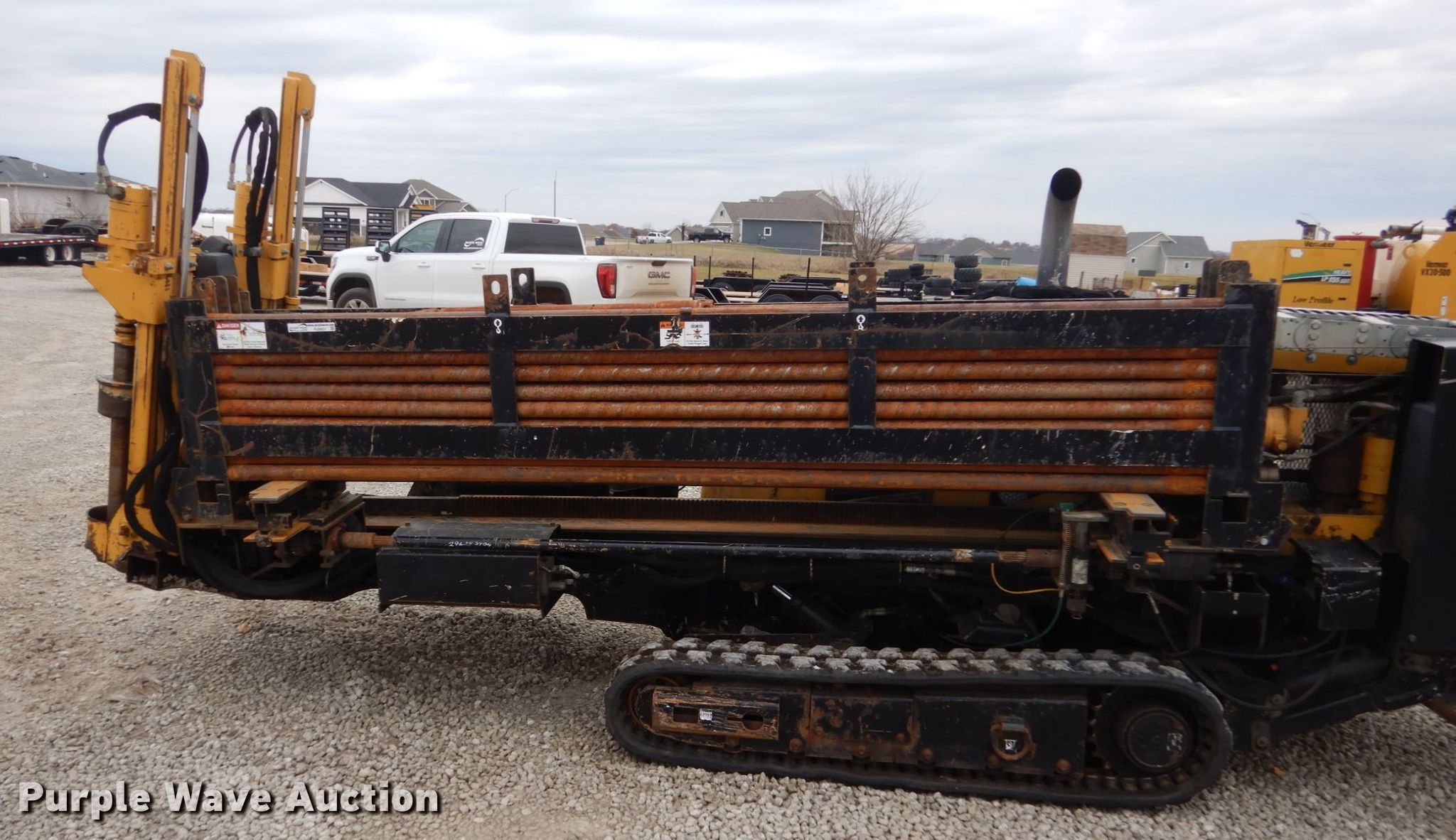 2011 Vermeer D16X20 directional boring unit. 5,719 hours on meter, Kubota V3600-E105 3.6L four cylinder diesel engine, Bean water pump 25 gallon on-board water capacity, 3"W drill bit, (40) drill stems 10'L x 1.90" diameter, Automatic rod loader, Hydraulic stake down, Rear hydraulic stabilizers, 10"W rubber tracks Left extendable tracks, Serial 1VR6170S7B1000446. Vermeer Iowa & No. Missouri. 661 Highway T14. Pella, IA 50219