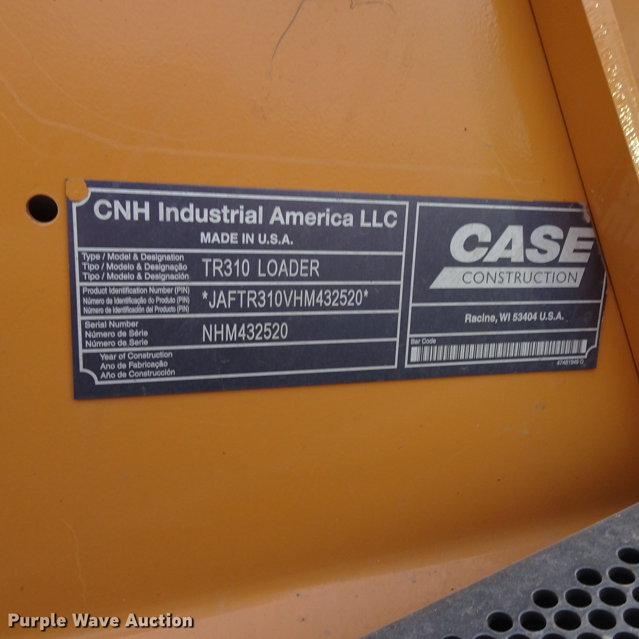 Purple Wave is selling a used Skid Steer Loader in Texas. This item is a 2017 Case TR310 skid steer with the following: 163 hours on meter, 3.4L four cylinder diesel engine, 68 HP, Hydrostatic transmission, Enclosed cab, AC and heat, Hand bucket controls, 78"W low profile bucket, Weld-on cutting edge, .54 cu.yd. capacity, Hydraulic quick copuler, Auxiliary hydraulics, 15.7"W tracks, Serial NHM432520