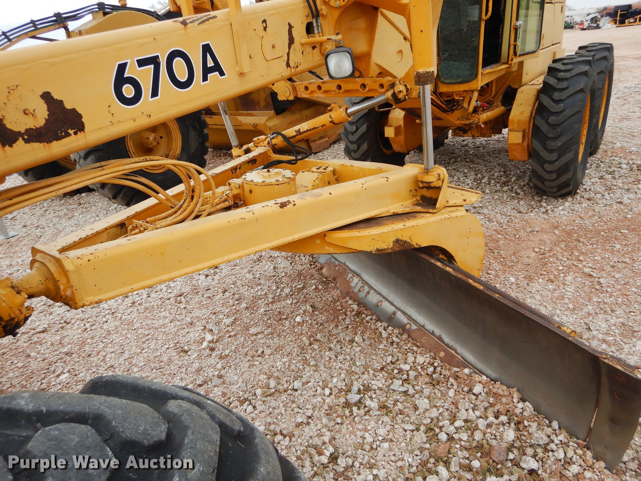 Purple Wave is selling a used Motor Grader in Oklahoma. This item is a 1980 John Deere 670A motor grader with the following: John Deere six cylinder diesel engine, Powershift transmission, 8F-4R gears, EROPS, (4) hydraulic control valves, 12'L moldboard, Front mounted scarifier, (4) teeth, 14.00-24 tires, Serial 9868