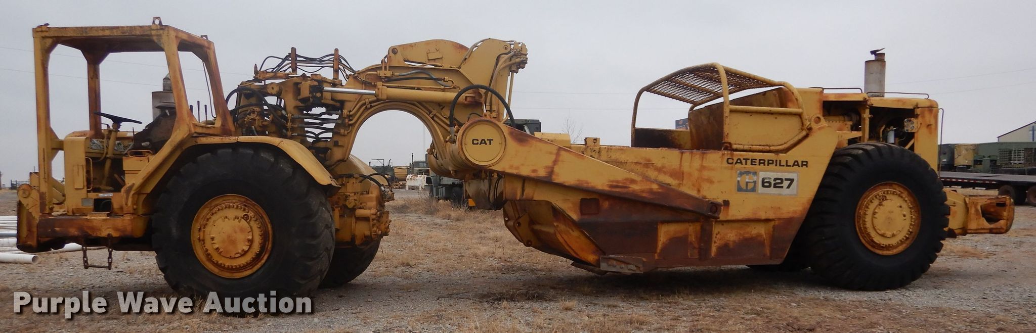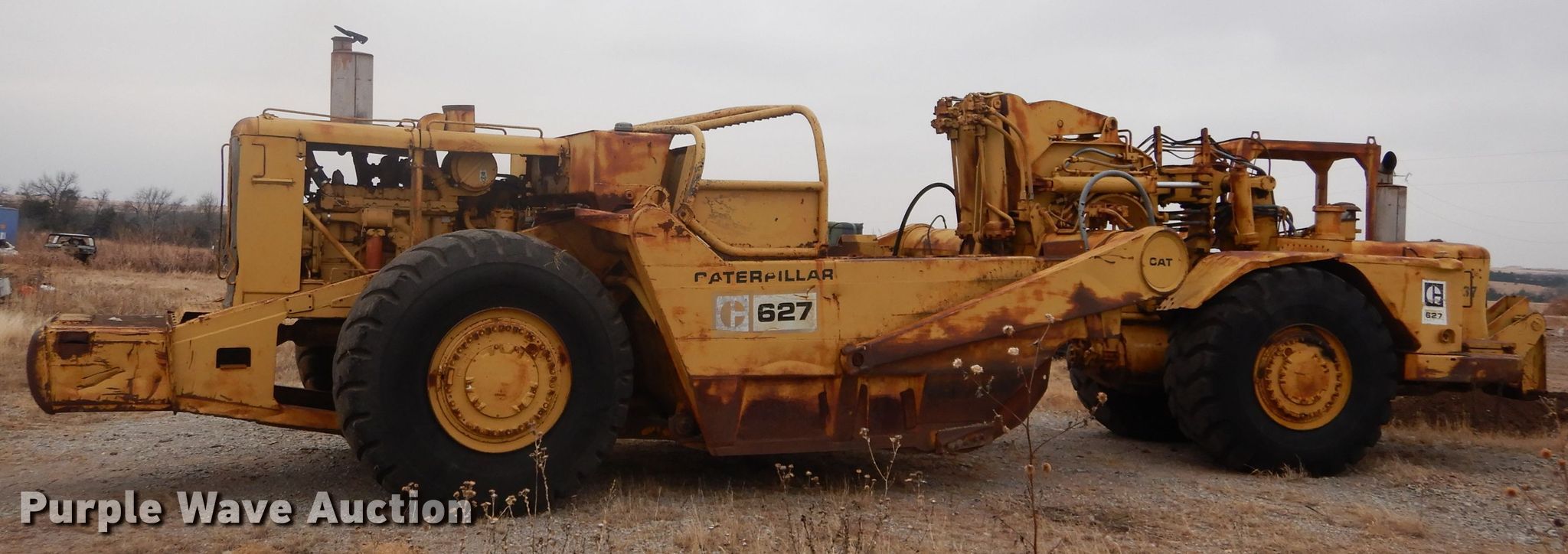 Purple Wave is selling a used Conventional Scraper in Oklahoma. This item is a Caterpillar 627B conventional scraper with the following: 397 hours on meter, Caterpillar six cylinder diesel engine, Caterpillar 3306 six cylinder diesel second engine, Serial 3N0342, Powershift transmission, 8F-1R gears, OROPS, Three lever controls, Approximately 10' bowl width, Hydraulic lift, Air brakes, 29.5-29 tires
