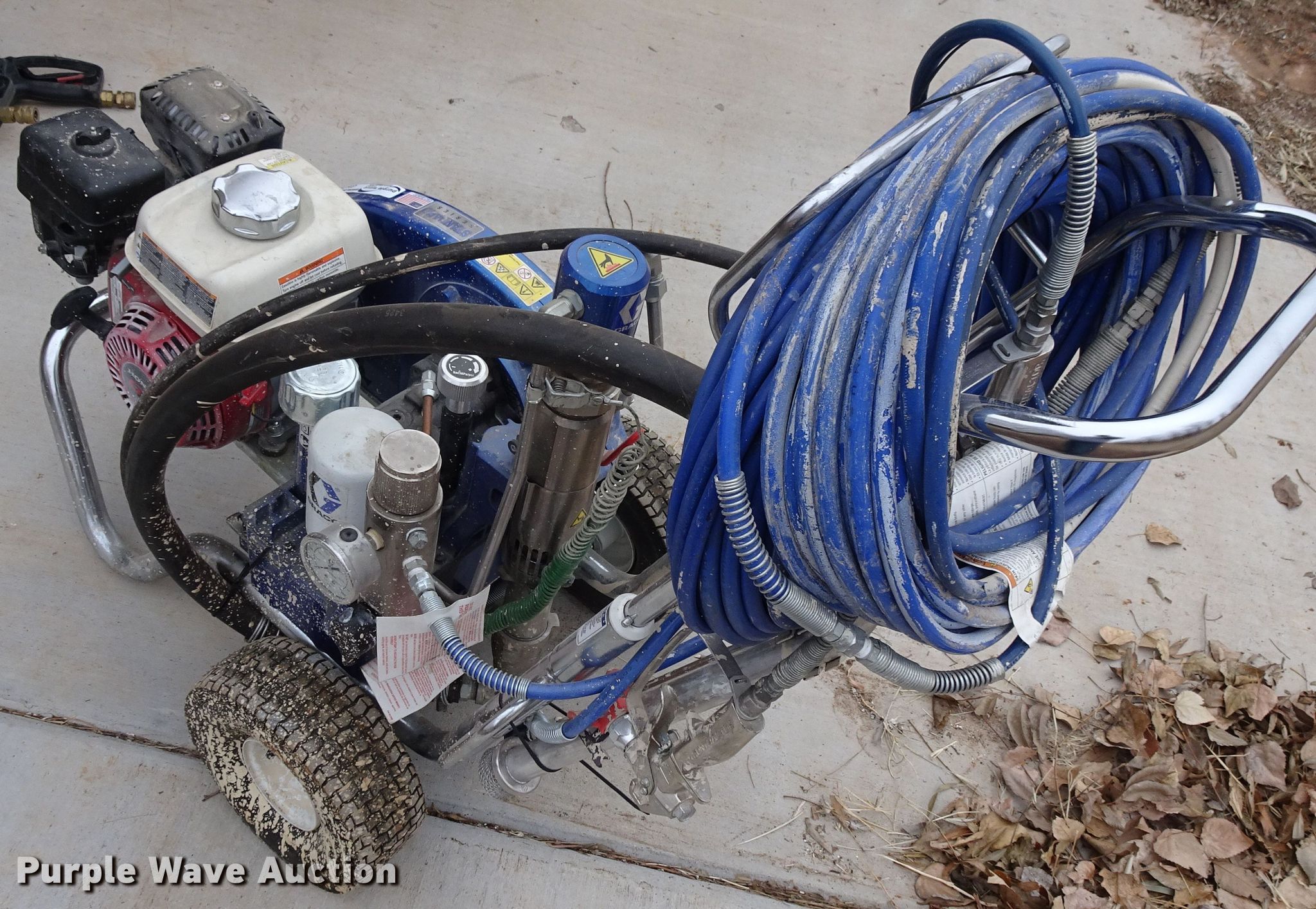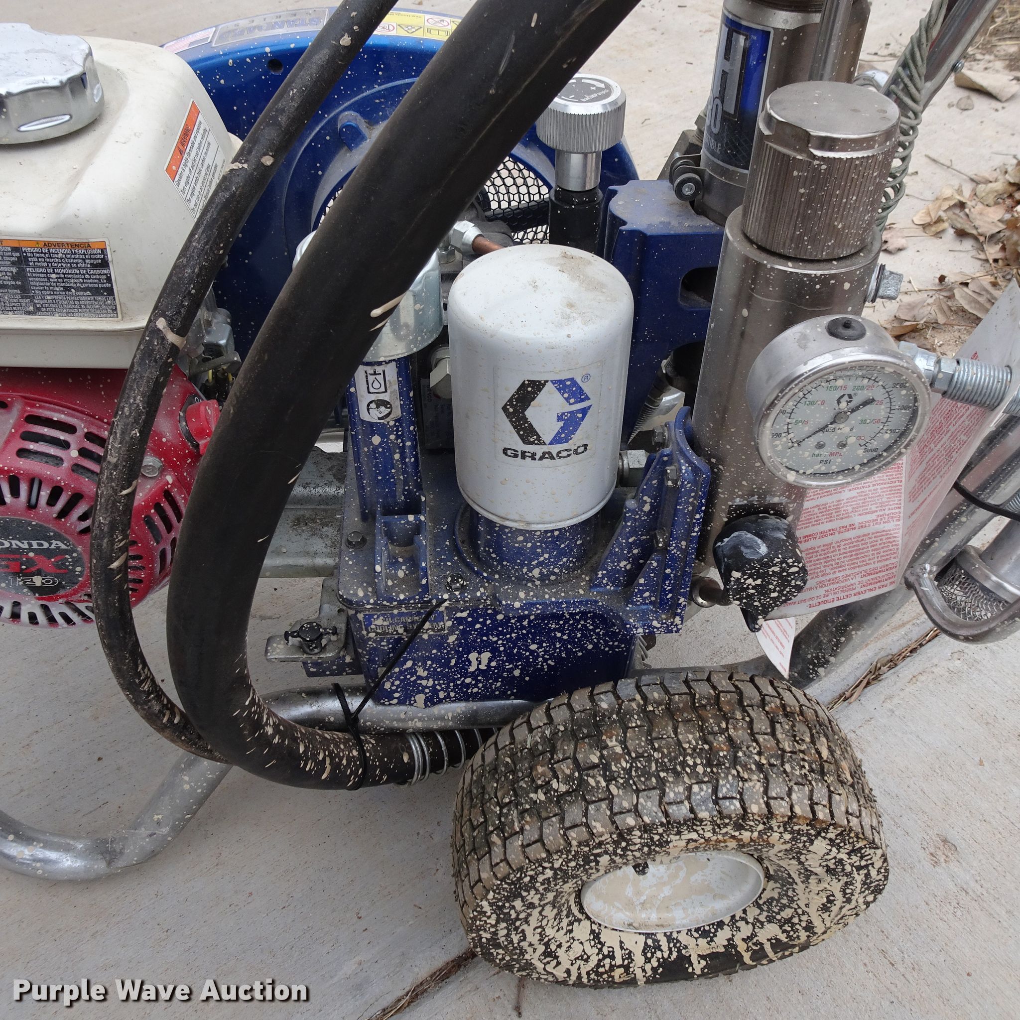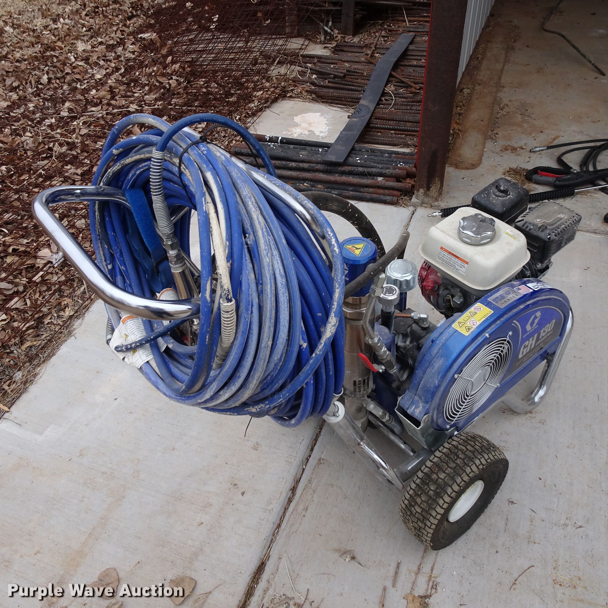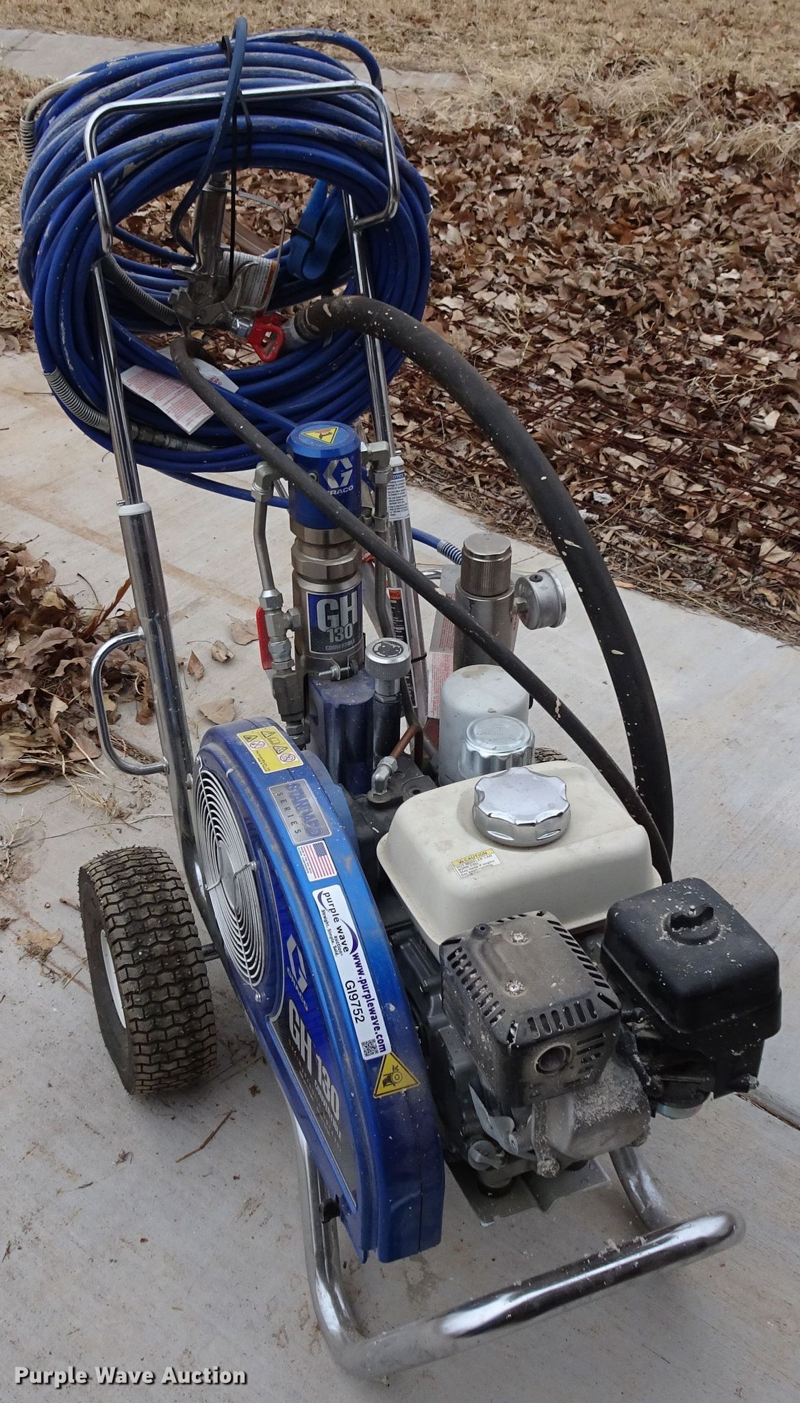 Purple Wave is selling a used Tools in Texas. This item is a Graco GH130 convertible paint sprayer with the following: Honda GX120 gas engine, (2) guns, Hoses