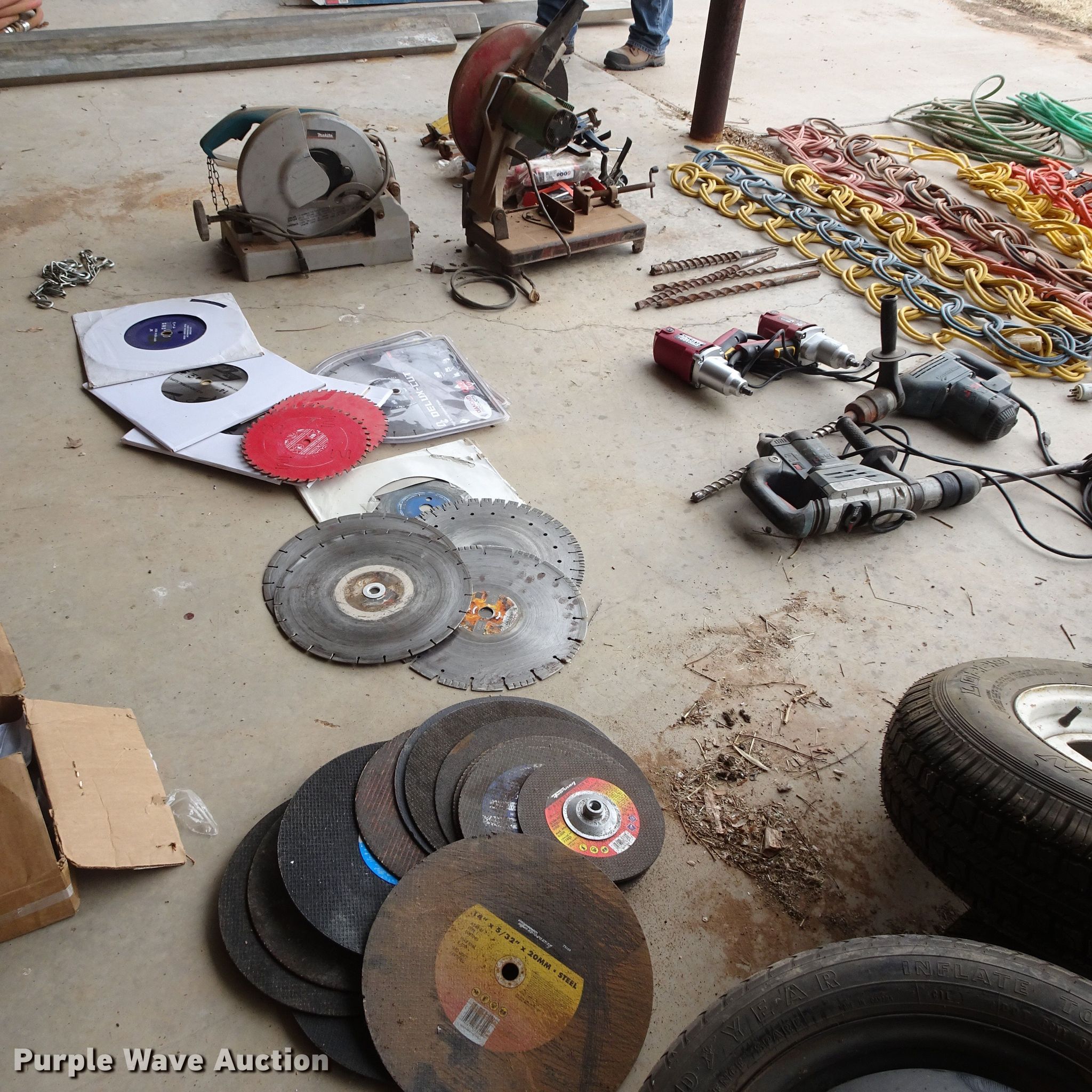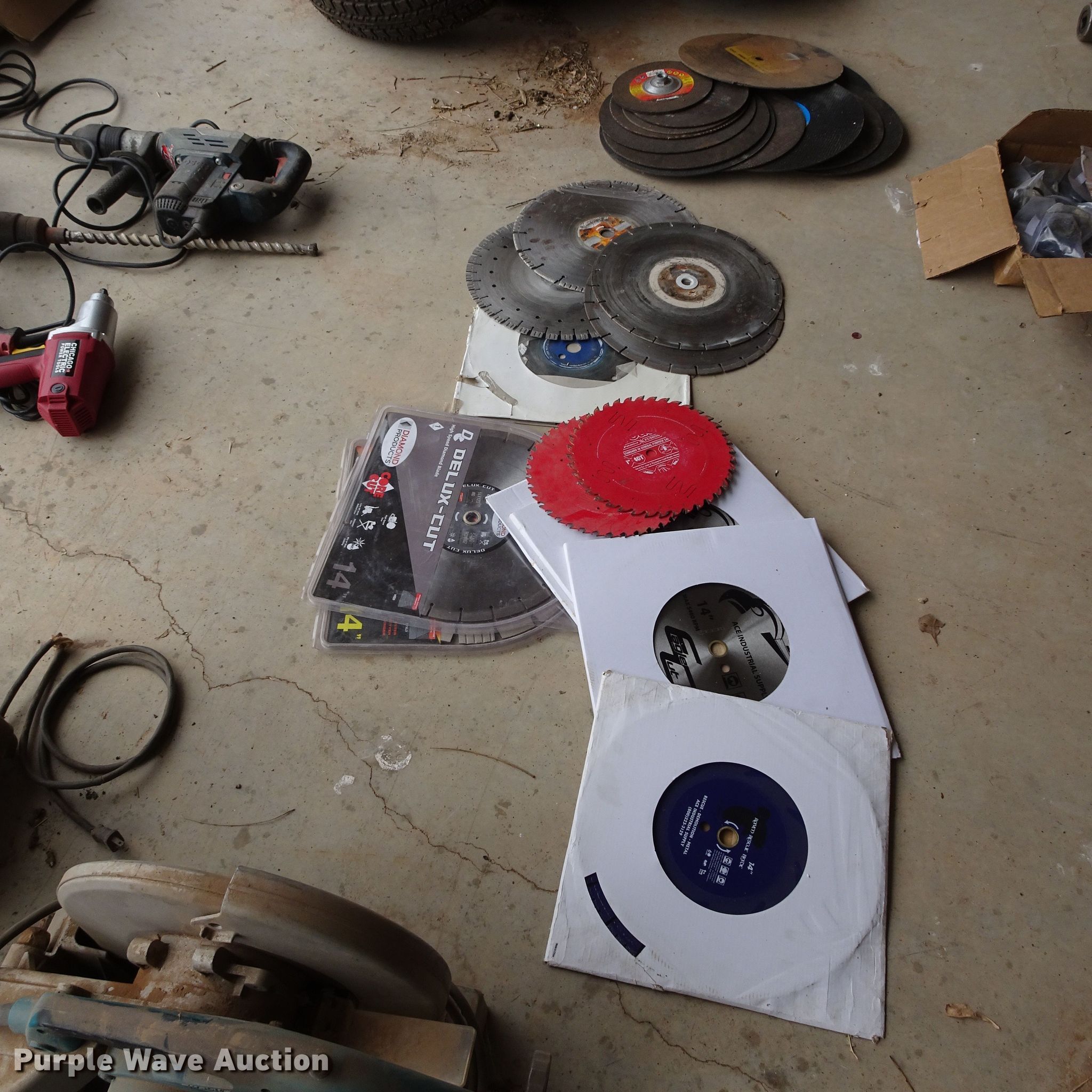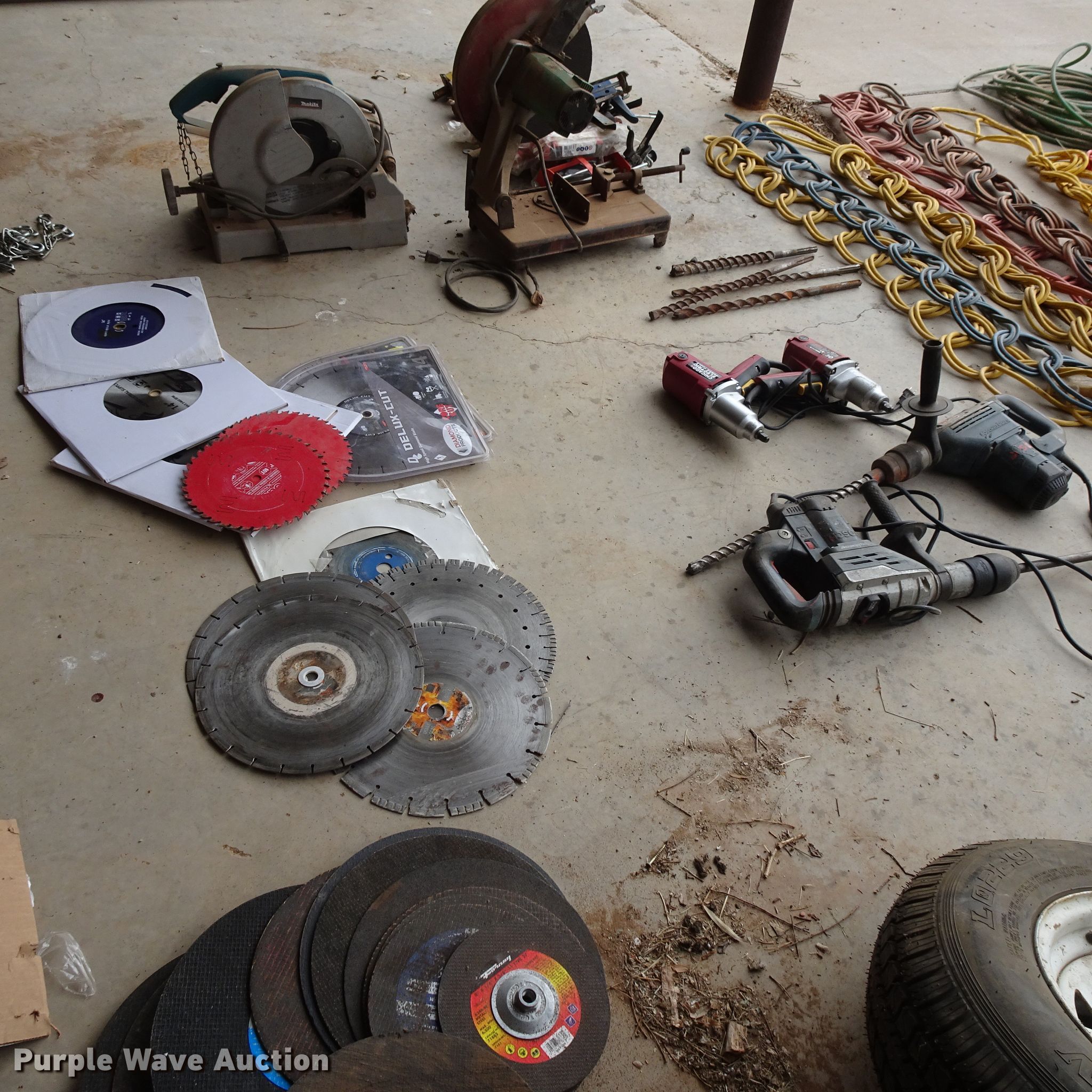 Purple Wave is selling a used Tools in Texas. This item is a Tools with the following: Makita chop saw, Hitachi chop saw, (2) Bosh hammer drills, Caulk guns, Blades, Extension cords, Simpson strong-tie anchors and more