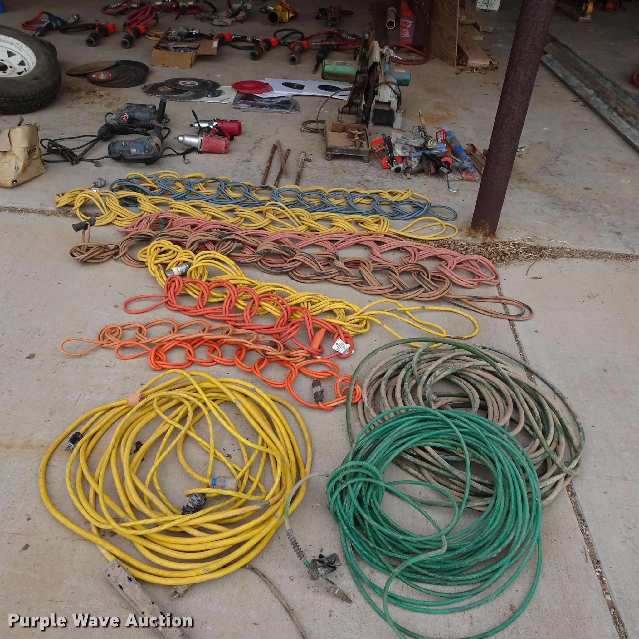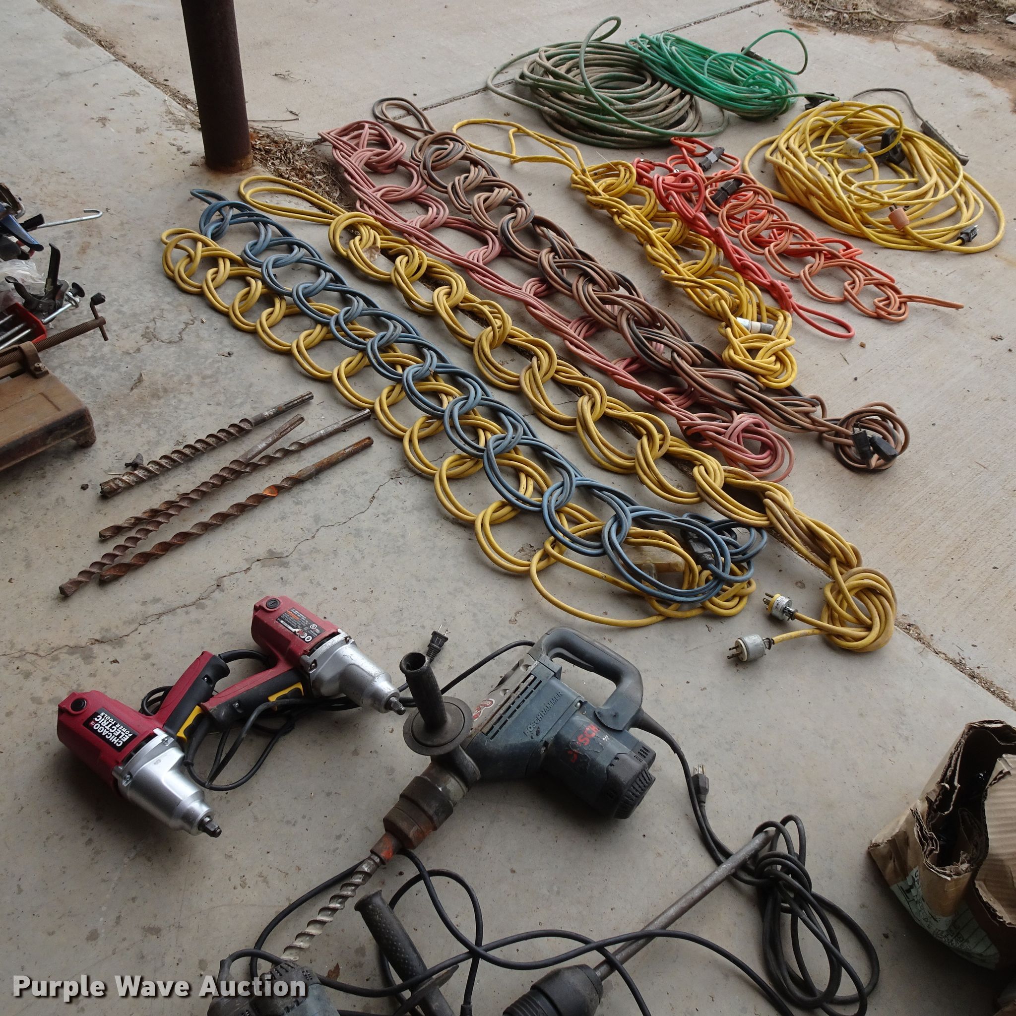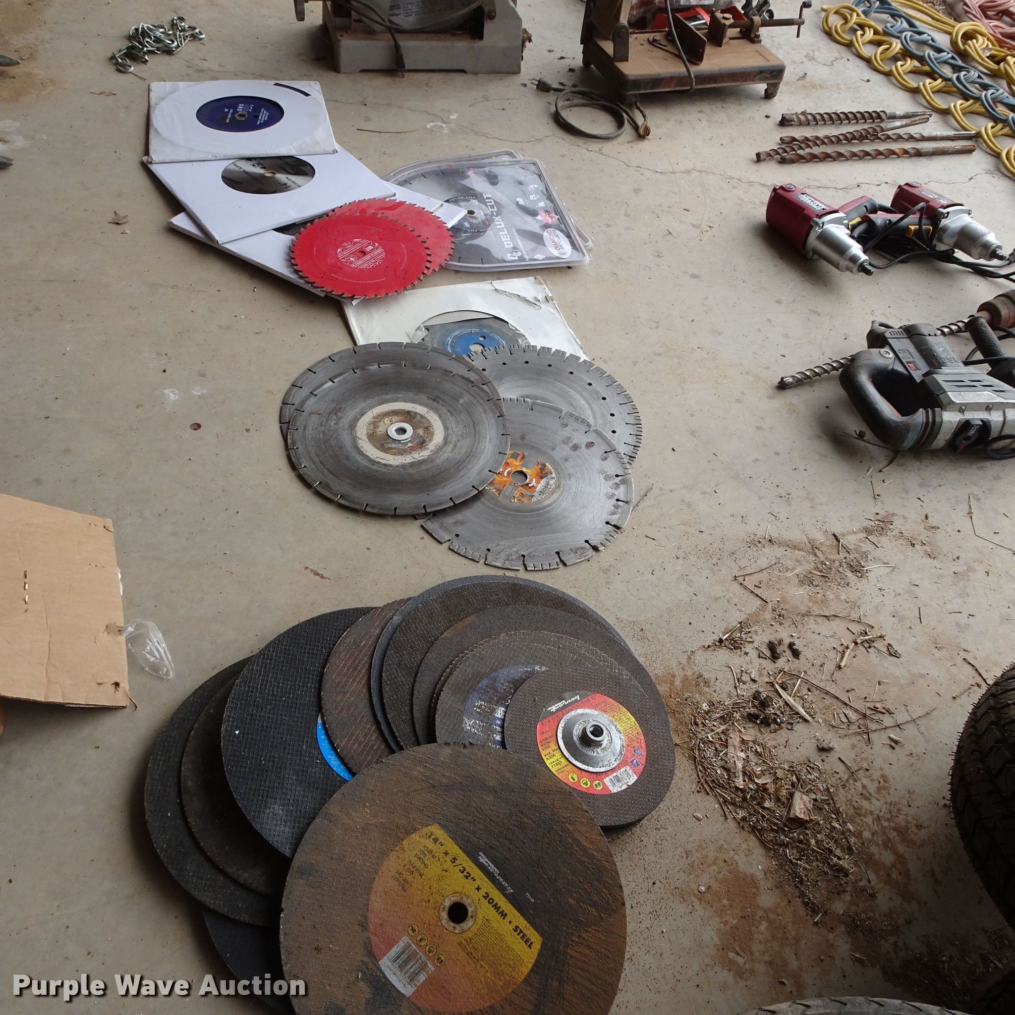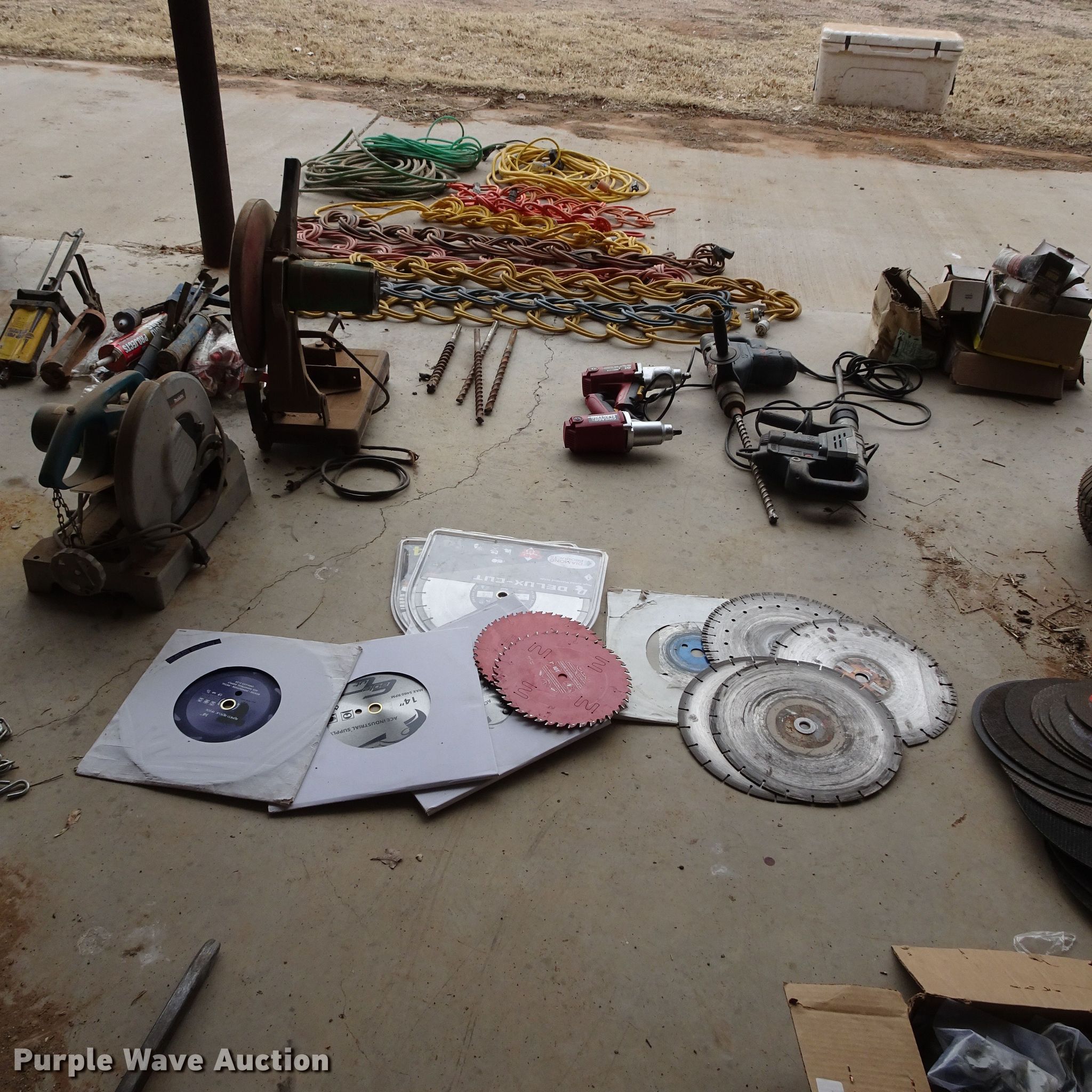 Purple Wave is selling a used Tools in Texas. This item is a Tools with the following: Makita chop saw, Hitachi chop saw, (2) Bosh hammer drills, Caulk guns, Blades, Extension cords, Simpson strong-tie anchors and more