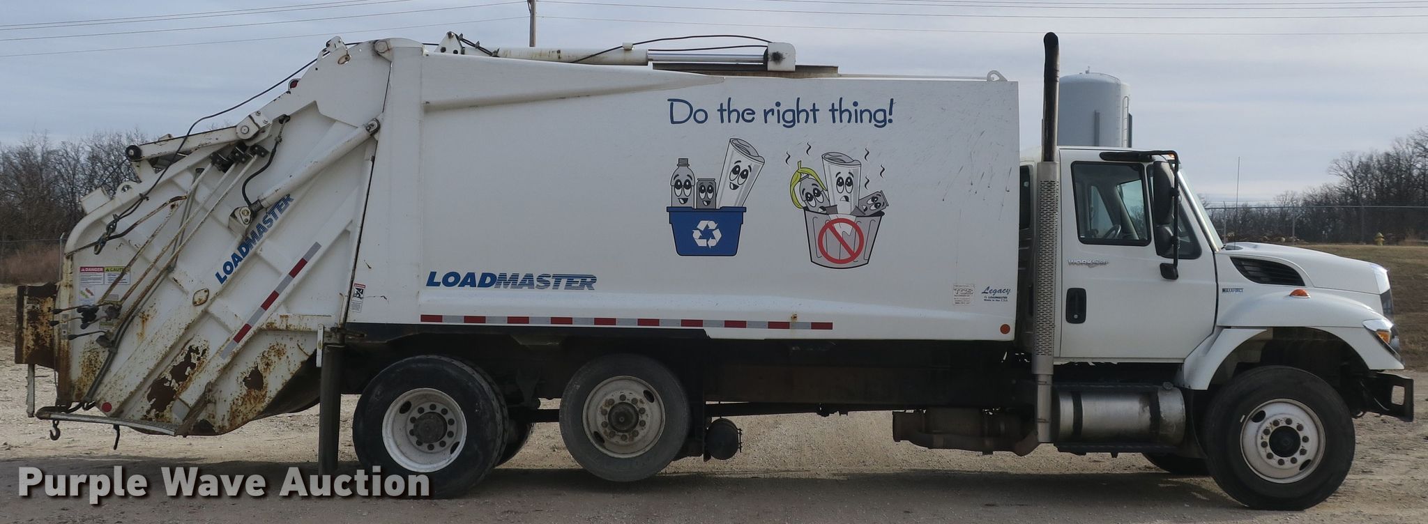 Purple Wave is selling a used Refuse Truck in Missouri. This item is a 2012 International WorkStar 7400 refuse truck with the following: 69,836 miles on odometer, 13,015 engine hours on meter, 1,056 PTO hours on meter, International MaxxForce DT 7.6L L6 diesel engine, Automatic transmission, Single axle, AC and heat, Cruise, Heated mirrors, Backup camera, PTO, LoadMaster Legacy refuse bed, 20 cu. yd. capacity, Rear load, Cart tipper, Winch, Serial LM11997, Double frame, Spring suspension, Air brakes, 11R22.5 tires, GVWR 36,000 lbs, Power steering gearbox leaks