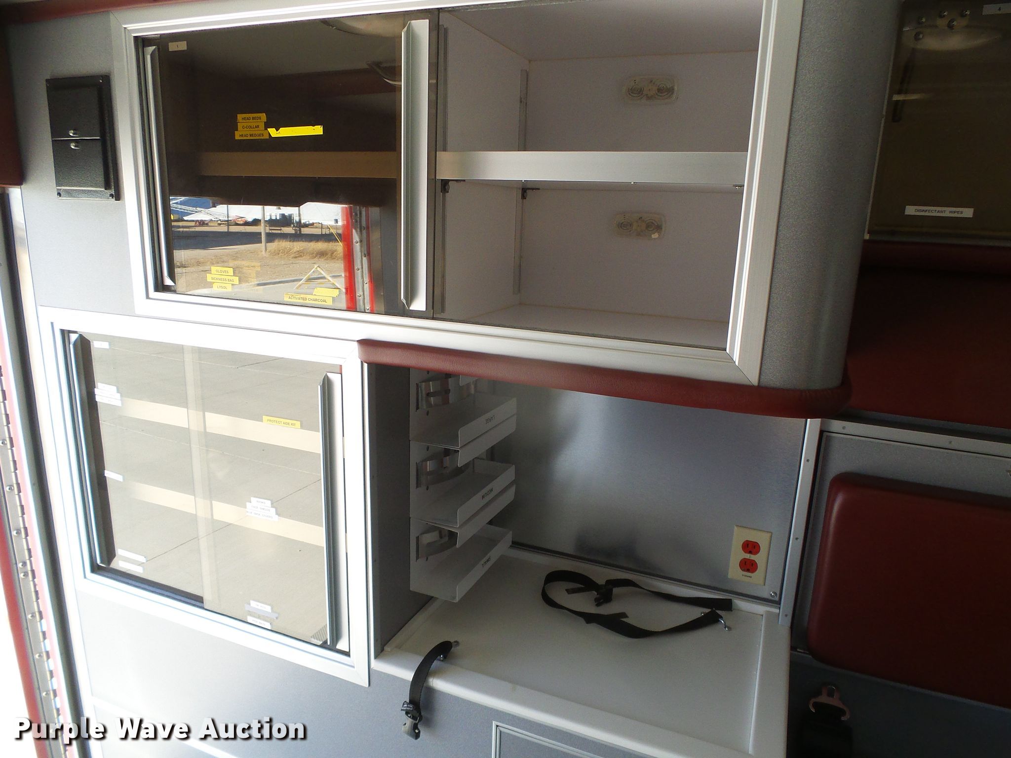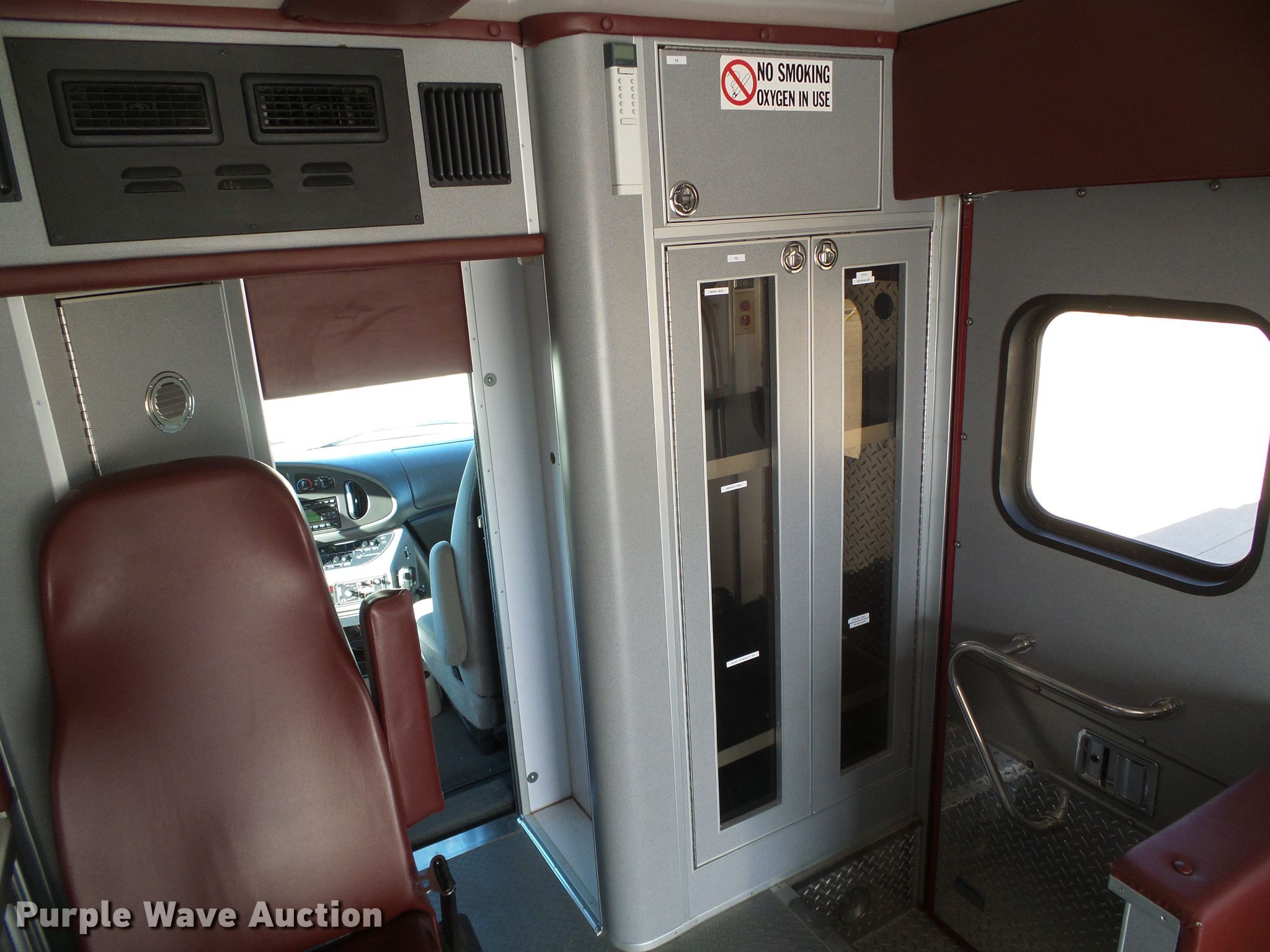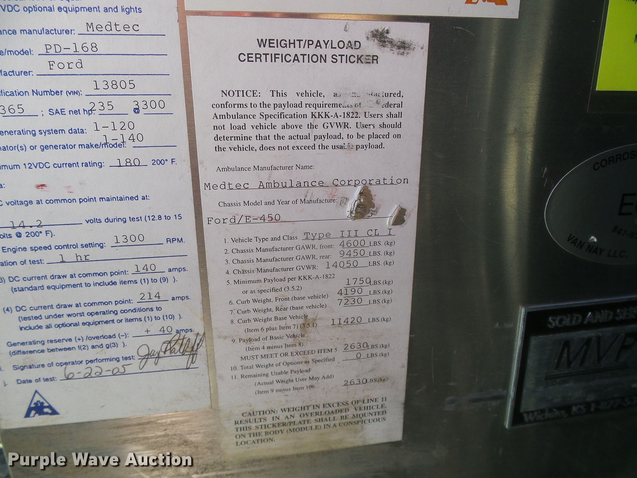 Purple Wave is selling a used Fire Truck or Emergency Vehicle in Kansas. This item is a 2005 Ford E450 ambulance with the following: 52,469 miles on odometer, 2,099 hours on meter, 6.0L V8 OHV 32V diesel engine, Automatic transmission, Single axle, AC and heat, Power windows and locks, Medtec PD168 body, PA/siren controls, Oxygen hookups, Spring suspension, Hydraulic brakes, LT225/75R16 tires, GVWR 14,050 lbs, Unit# 81