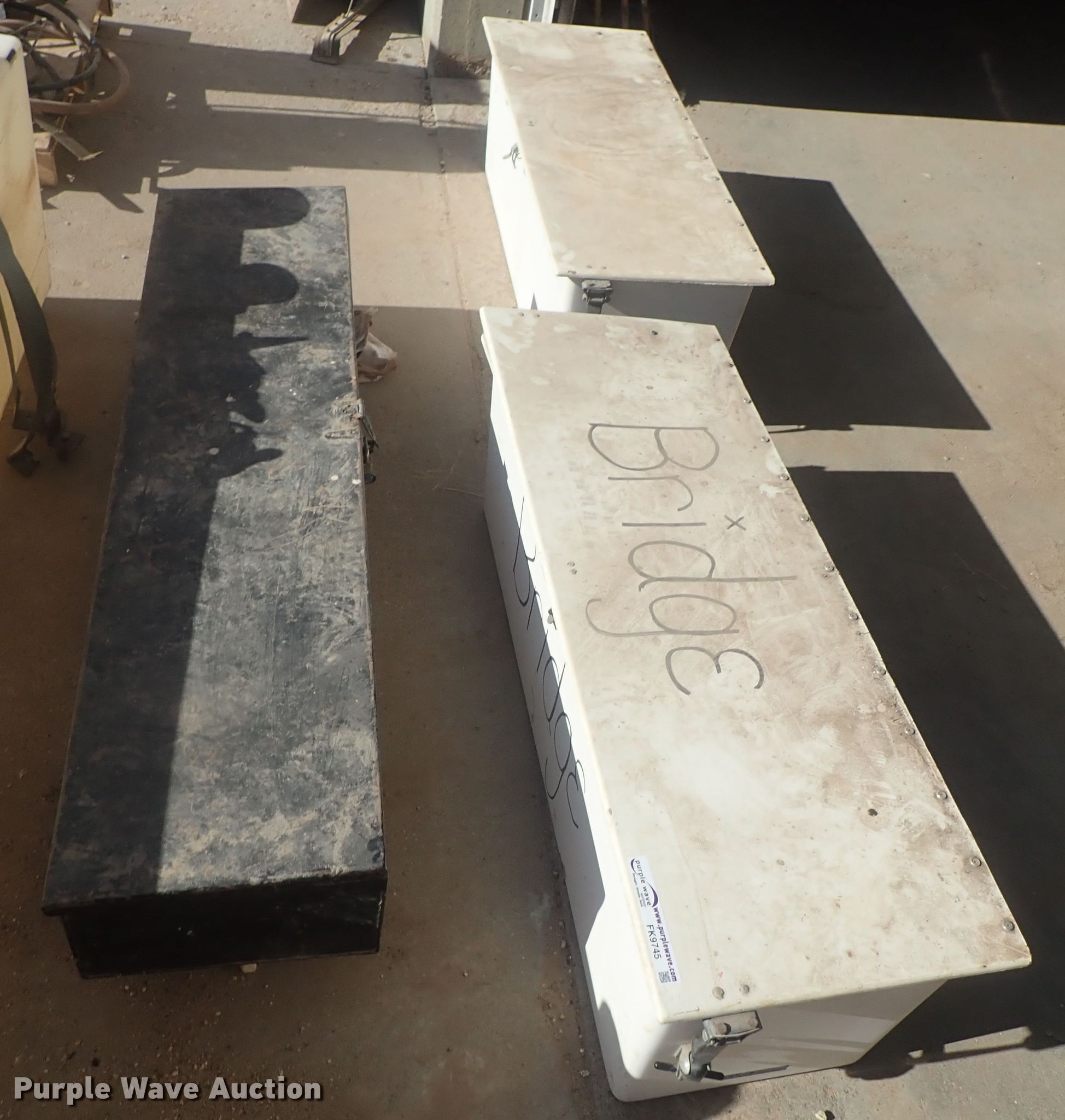 Purple Wave is selling a used Automotive Parts or Acces. in Kansas. This item is a (3) toolboxes with the following: (2) fiberglass, 50" x 18" x 17", Metal, 60"W, Contents not included