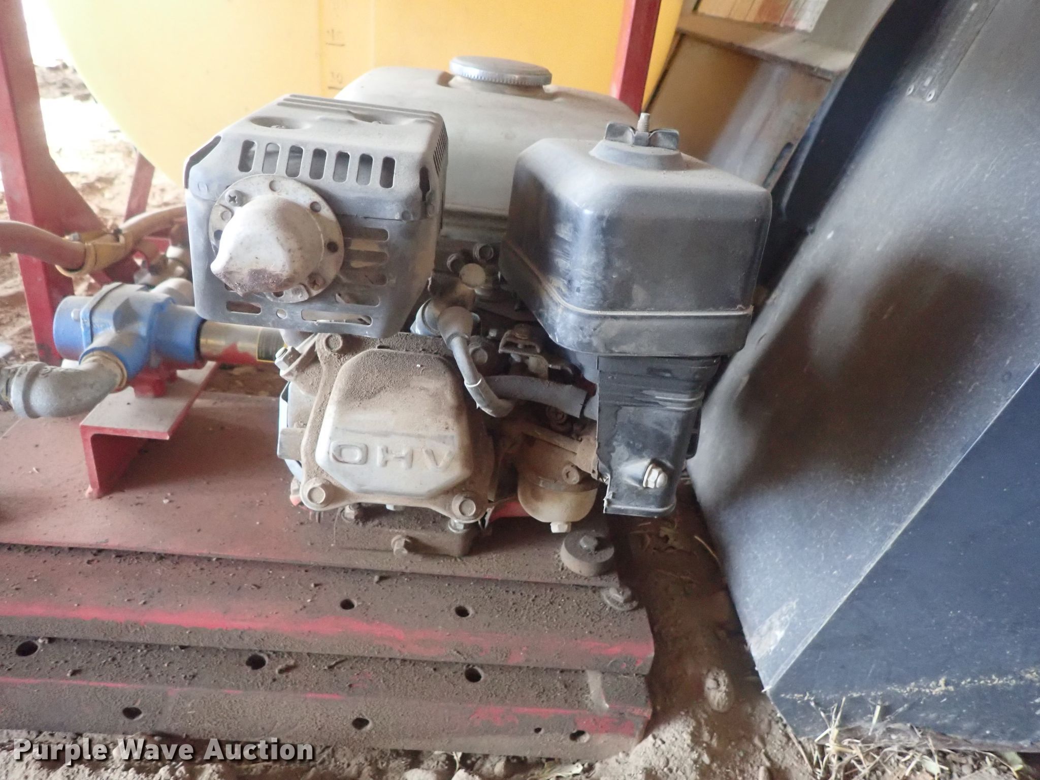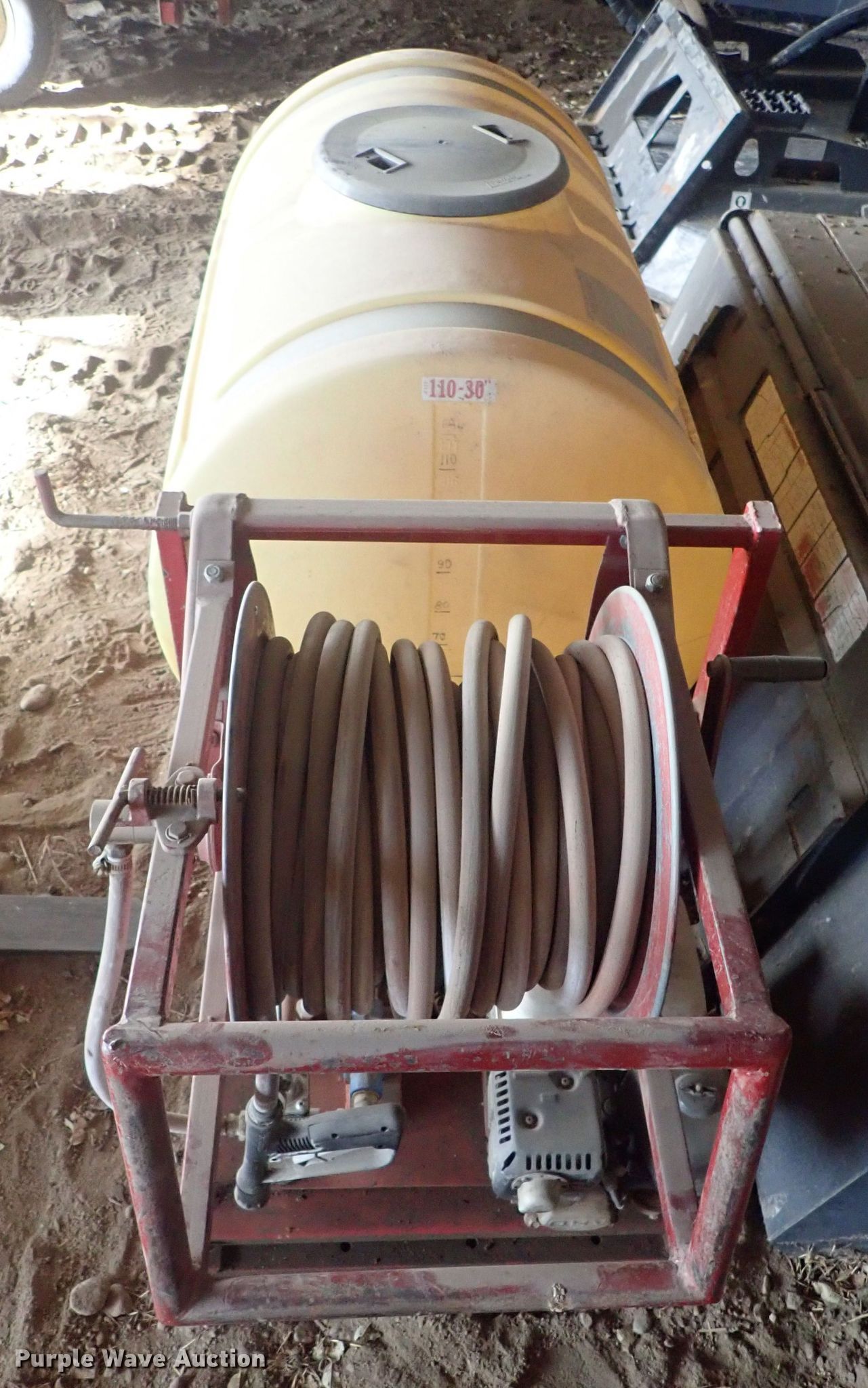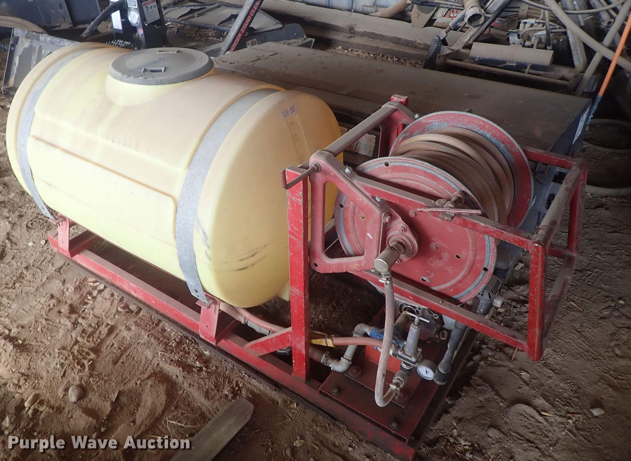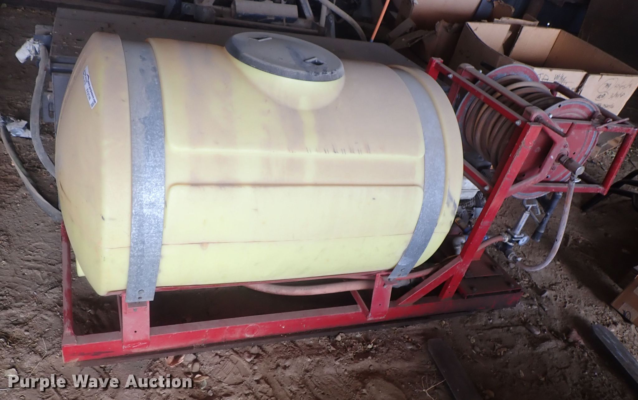 Purple Wave is selling a used Applicator Attach. in Kansas. This item is a Spray tank with the following: 110 gallon poly tank, Approx. 80" x 32", Hose reel with hose, Honda gas engine, Hypro pump