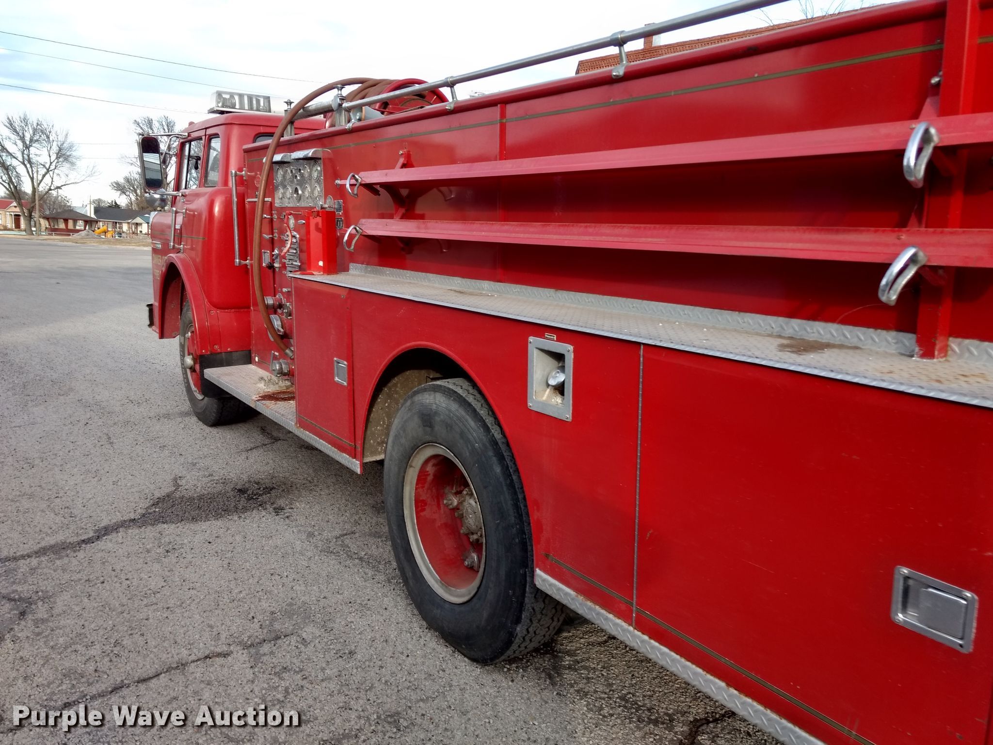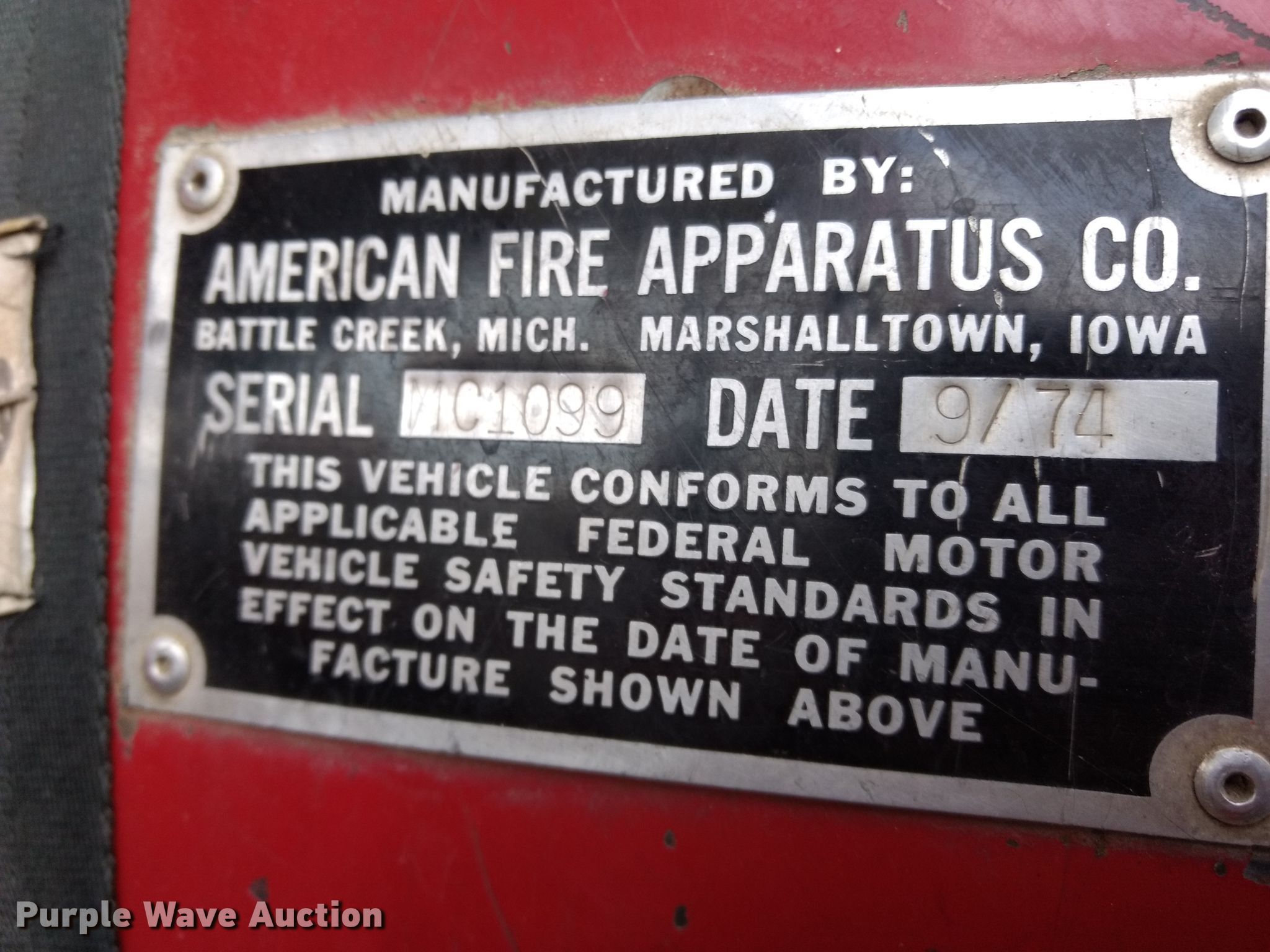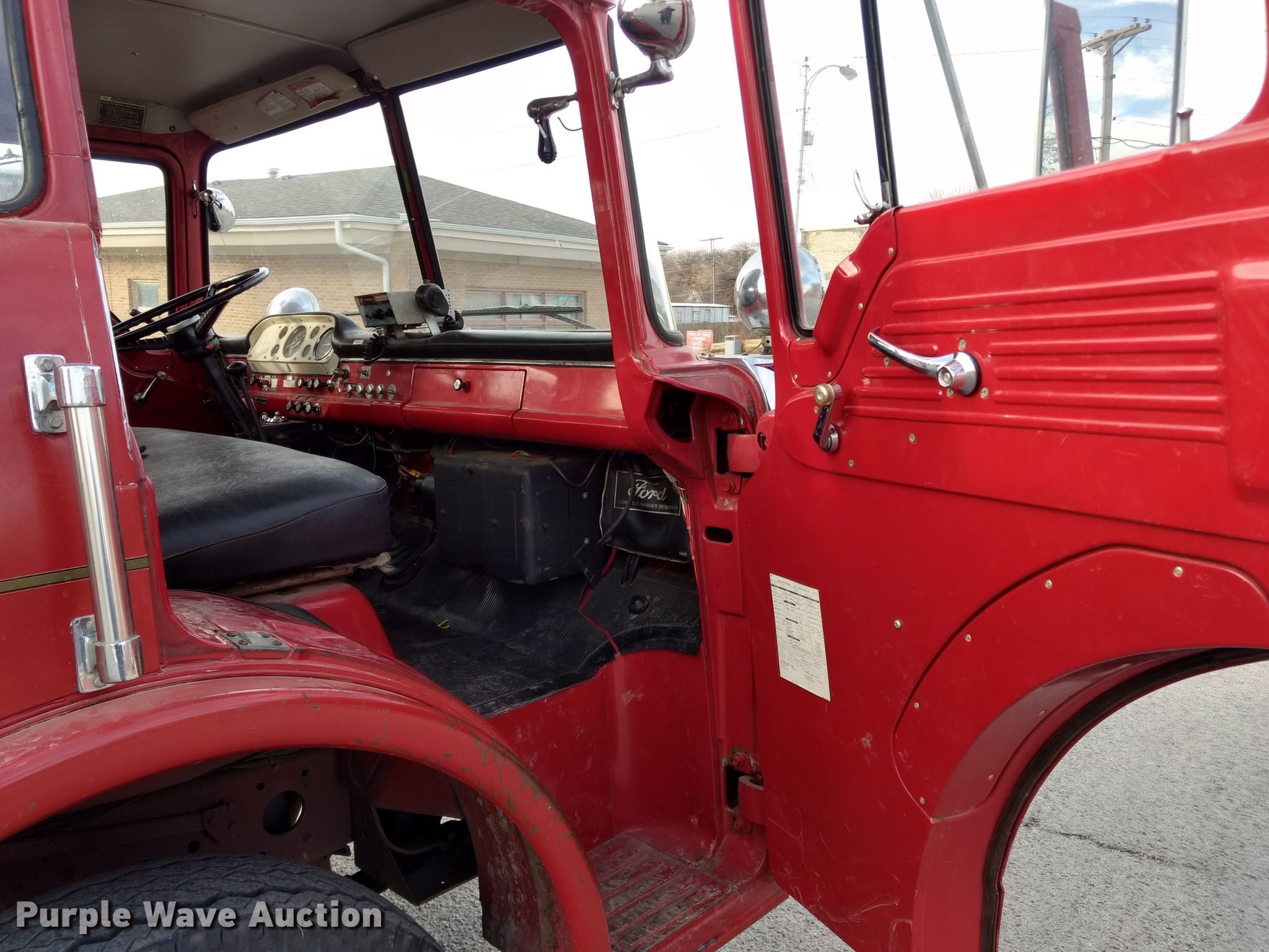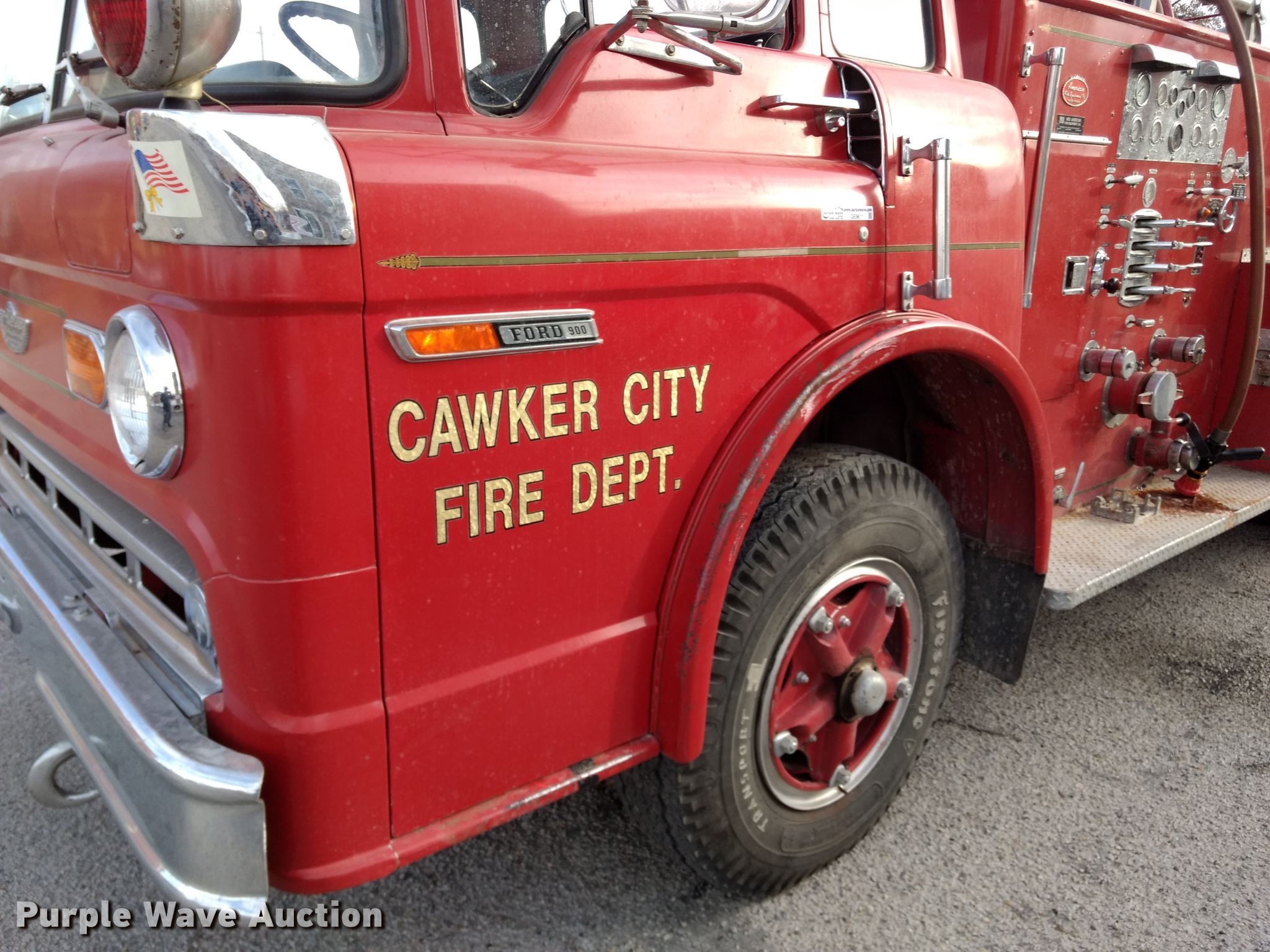 Purple Wave is selling a used Fire Truck or Emergency Vehicle in Kansas. This item is a 1974 Ford pumper fire truck with the following: 10,820 miles on odometer, Odometer exceeds mechanical limits, Ford 534 C.I.D. eight cylinder gas engine, Five speed manual transmission, Single axle, Heat, American Fire Apparatus Co. bed, 750 gpm pump, Ground ladder, Spring suspension, Hydraulic brakes, 10.00-20 tires